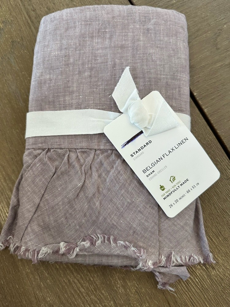 You are purchasing one Pottery Barn BELGIAN FLAX LINEN fringe ruffle Sham Size is standard color is a light purple/lavender purple new with tags, paper tag has a black line through the pb name...