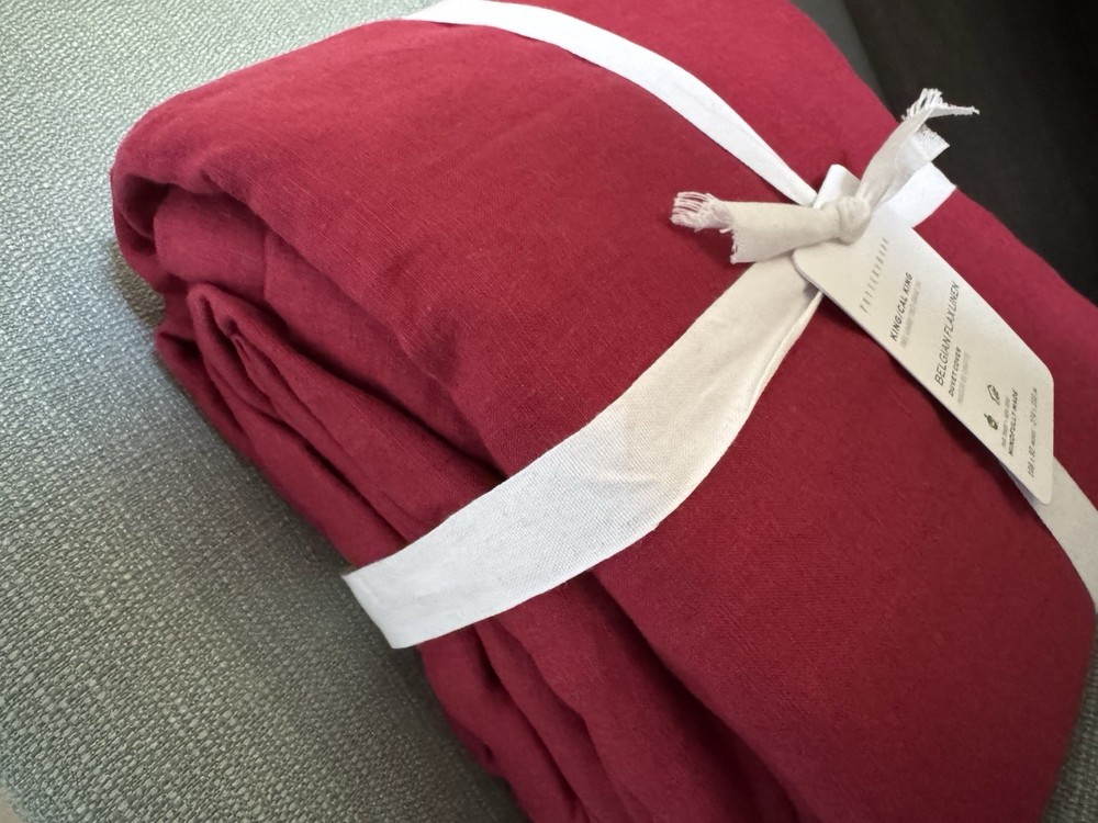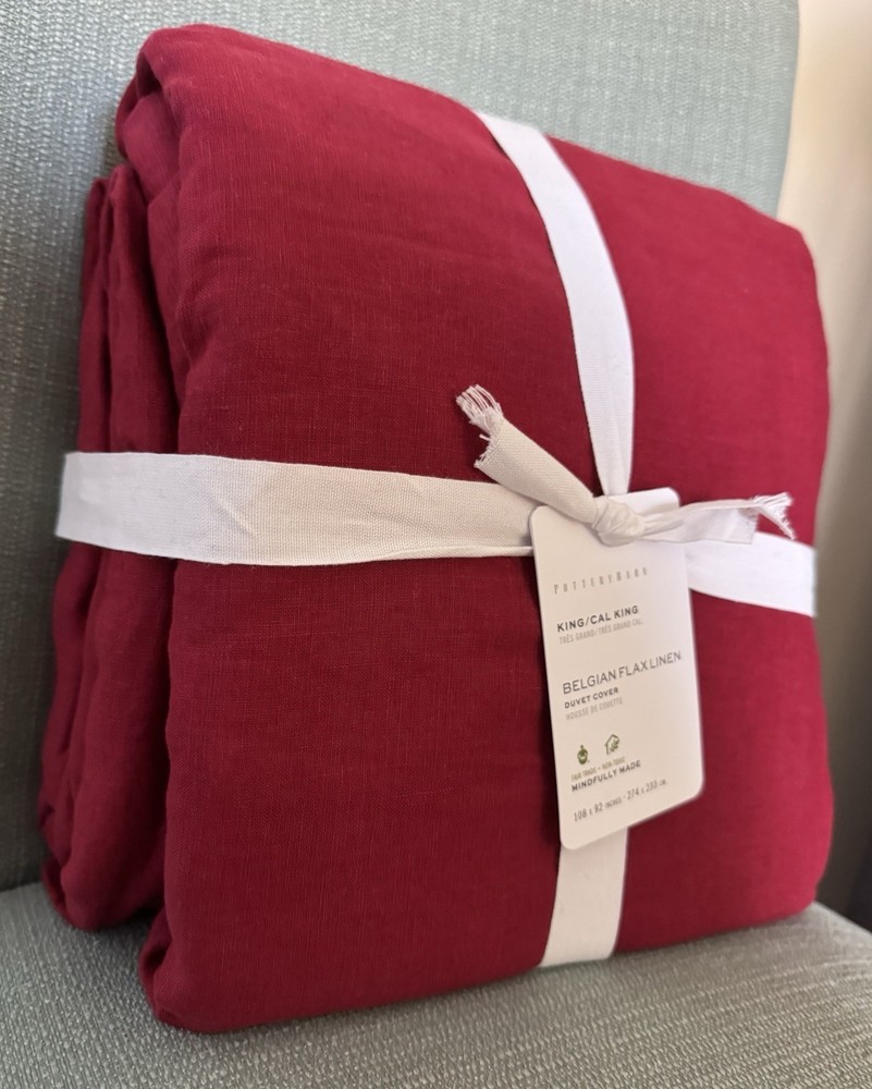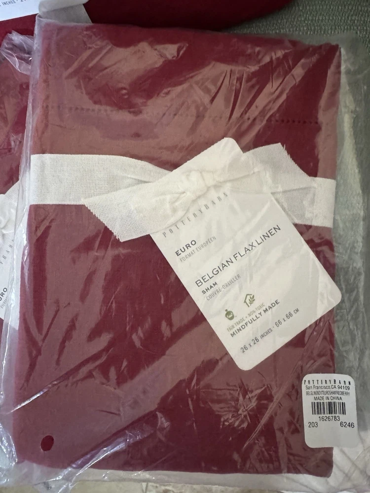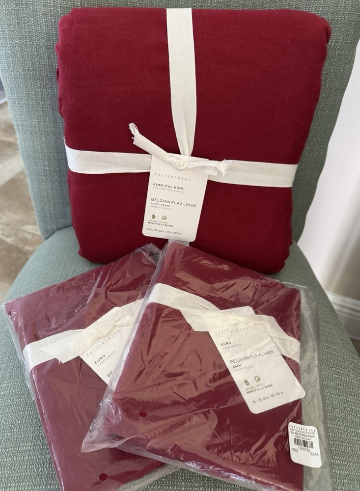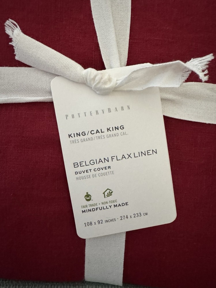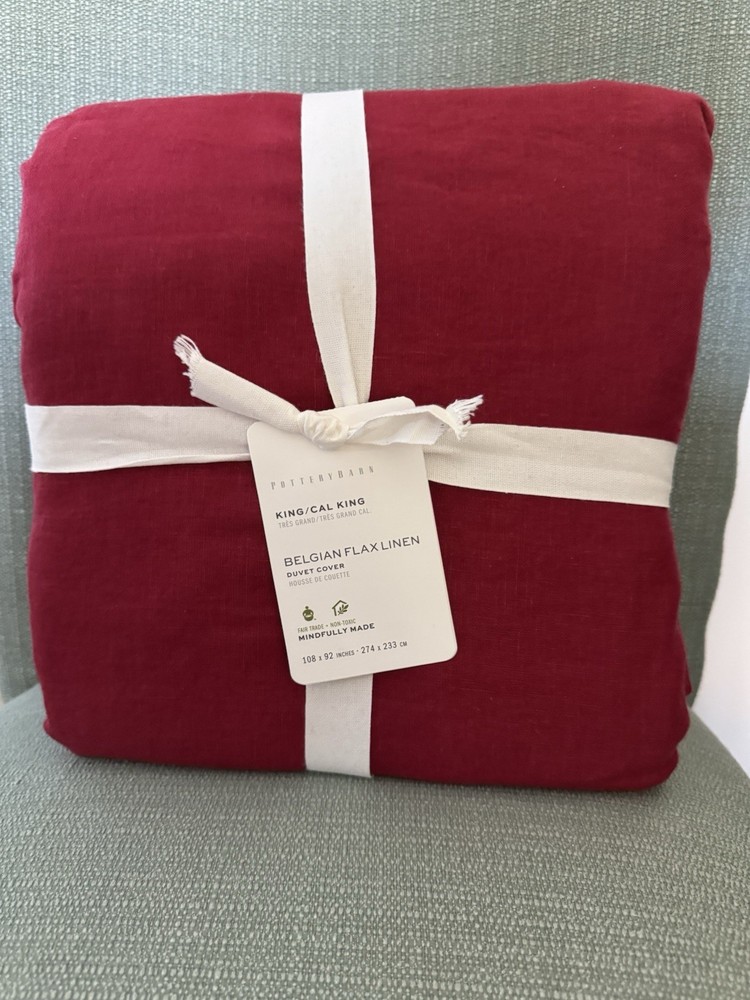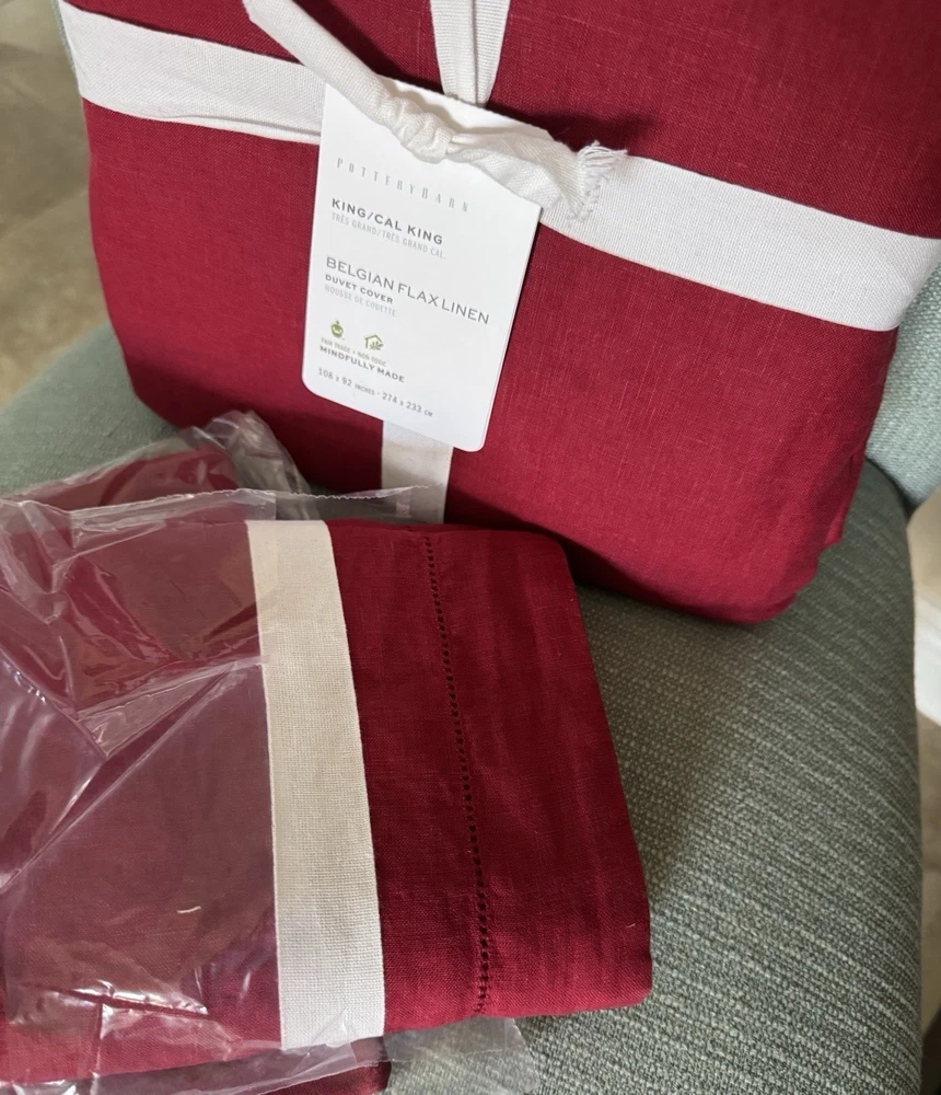 Brand New With Tags 3-Piece Pottery Barn ~Berry Red Belgian Flax Linen~ King-CA/King Duvet Cover and 2 Euro-Size Pillow Shams. ~SOLD OUT IN STORES AND ONLINE - This Set is In Hand and Ready to Ship to you for your Perfect Holiday Bed!~ Effortless, timeless, and made for layering, our linen bedding is the epitome of casual luxury. Woven from the world’s finest Belgian flax, it's prewashed for incredible softness that only gets better with time. One of our absolute favorite fabrics, linen keeps you cool when it’s warm and warm when it’s cold. Proudly made at a Fair Trade Certified™ factory. Linen woven from 100% Belgian flax. Reverses to same. Prewashed for a supersoft hand feel. Ideal for warm or cool temperatures. OEKO-TEX® STANDARD 100: tested for 1000+ harmful substances. 14.HUS.42449 HOHENSTEIN HTTI. Made in a Fair Trade Certified™ factory, empowering workers who made it. Duvet features a hidden button closure with inner ties that keep insert in place; sham features an envelope closure. Imported. Linen will get softer with every wash. Machine wash in cold water separately on gentle cycle. Use only non-chlorine bleach, if needed. Line or tumble dry on a low temperature. King/Cal. King Duvet: 92" l x 108" w Please let me know if you have any questions or would like additional pics. Also, please ask all questions prior to bidding as I do not normally accept returns, unless I have made a mistake while listing the item. At this time, I am only able to ship to confirmed US addresses... Item comes from a clean, non-pet and non-smoking home. Thanks for taking the time to view this great item, and Happy Shopping!! 😄