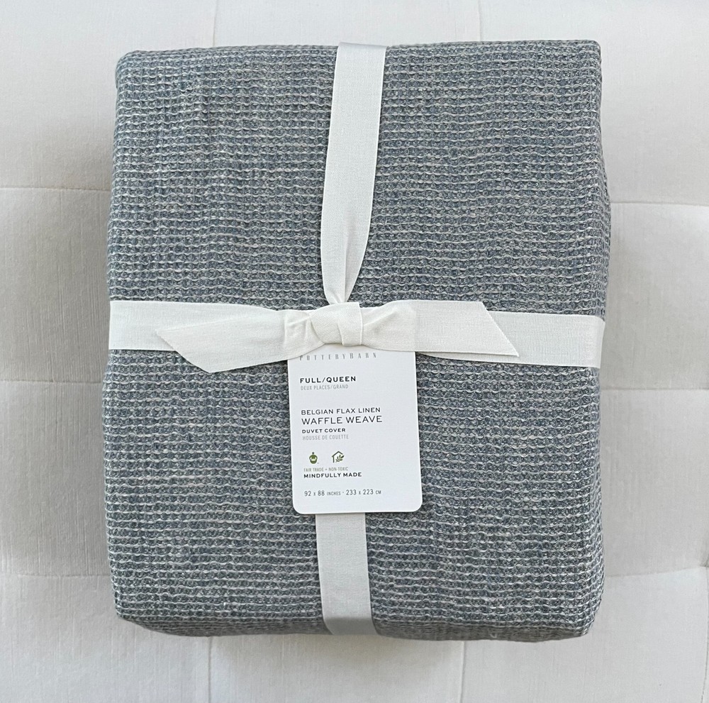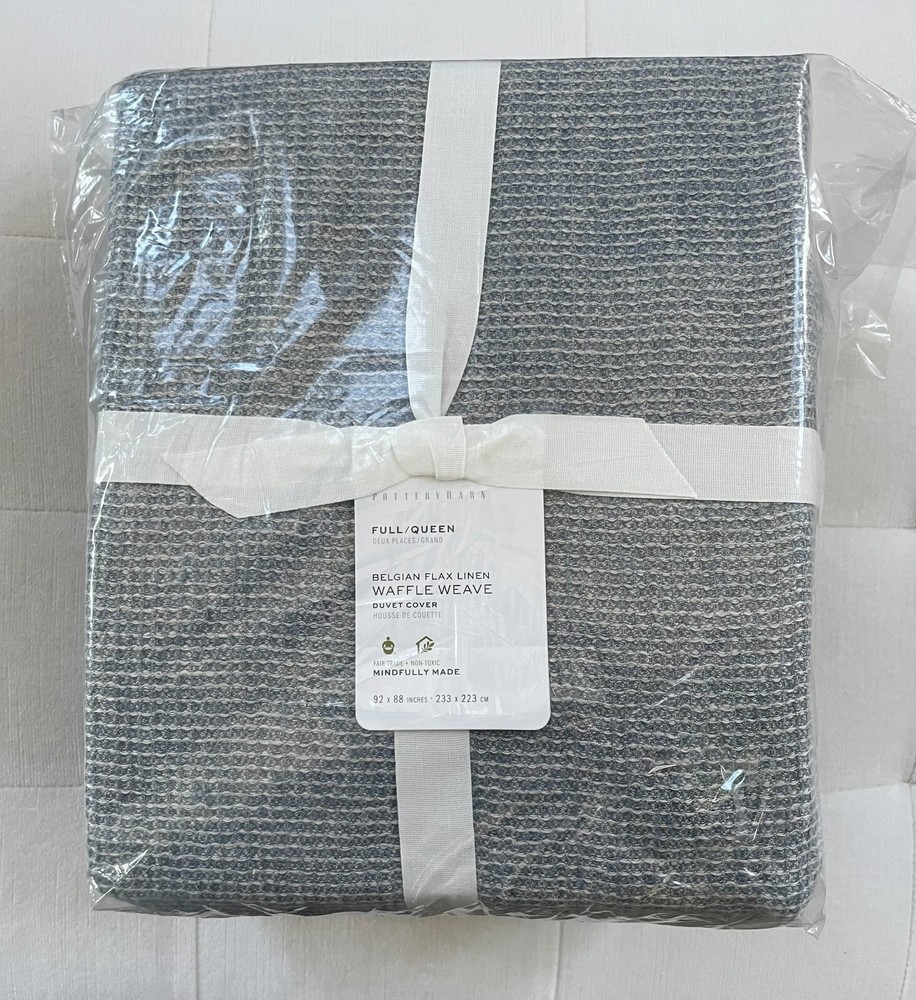 Pottery Barn Belgian Flax Linen Waffle Full/Queen Duvet ~Chambray New with tags PB describes as: Front is woven from 100% Belgian linen; reverse is 75% cotton and 25% linen. Breathable Belgian flax linen is ideal for warm or cool temperatures, and its durability lets you love it for years. Designed with a waffle texture. Soft and cool to the touch. Microscopic breaks in the fabric provide a light massaging effect, and high absorbency meaning they'll always feel fresh and cool. Pet & Smoke Free Shipped within 1 business day Thank you!