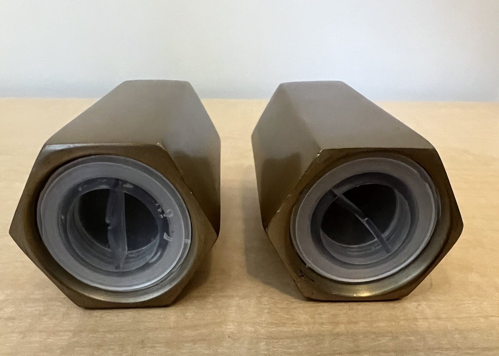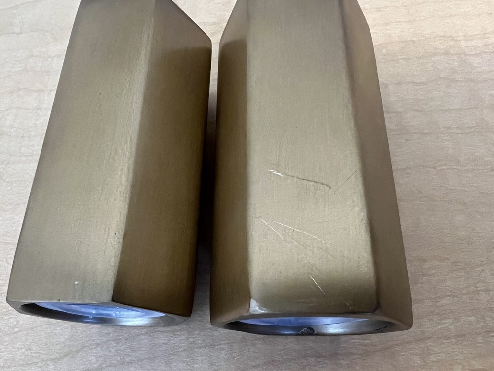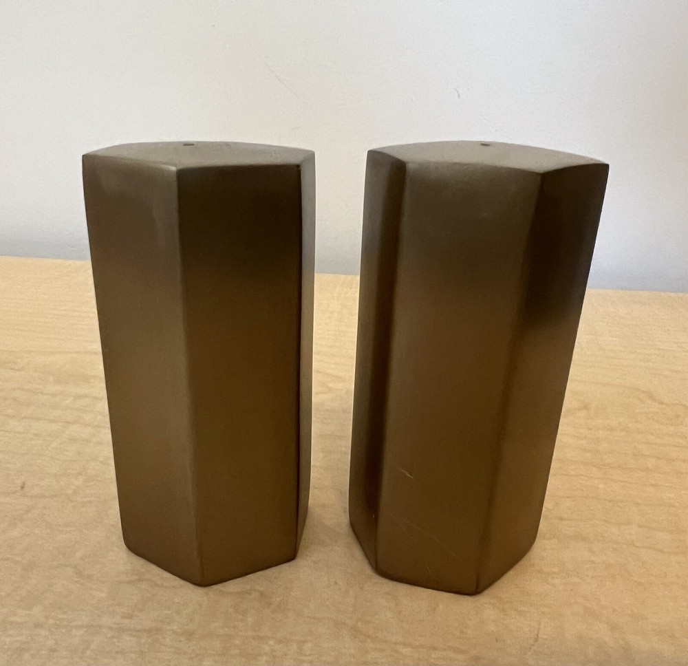 Pottery Barn BLEECKER Antiqued Gold Salt and Pepper Shakers Open Box, one has a few scratches, see picture for details