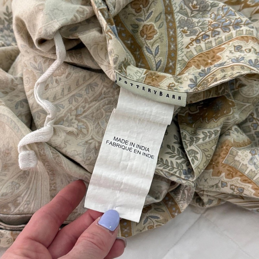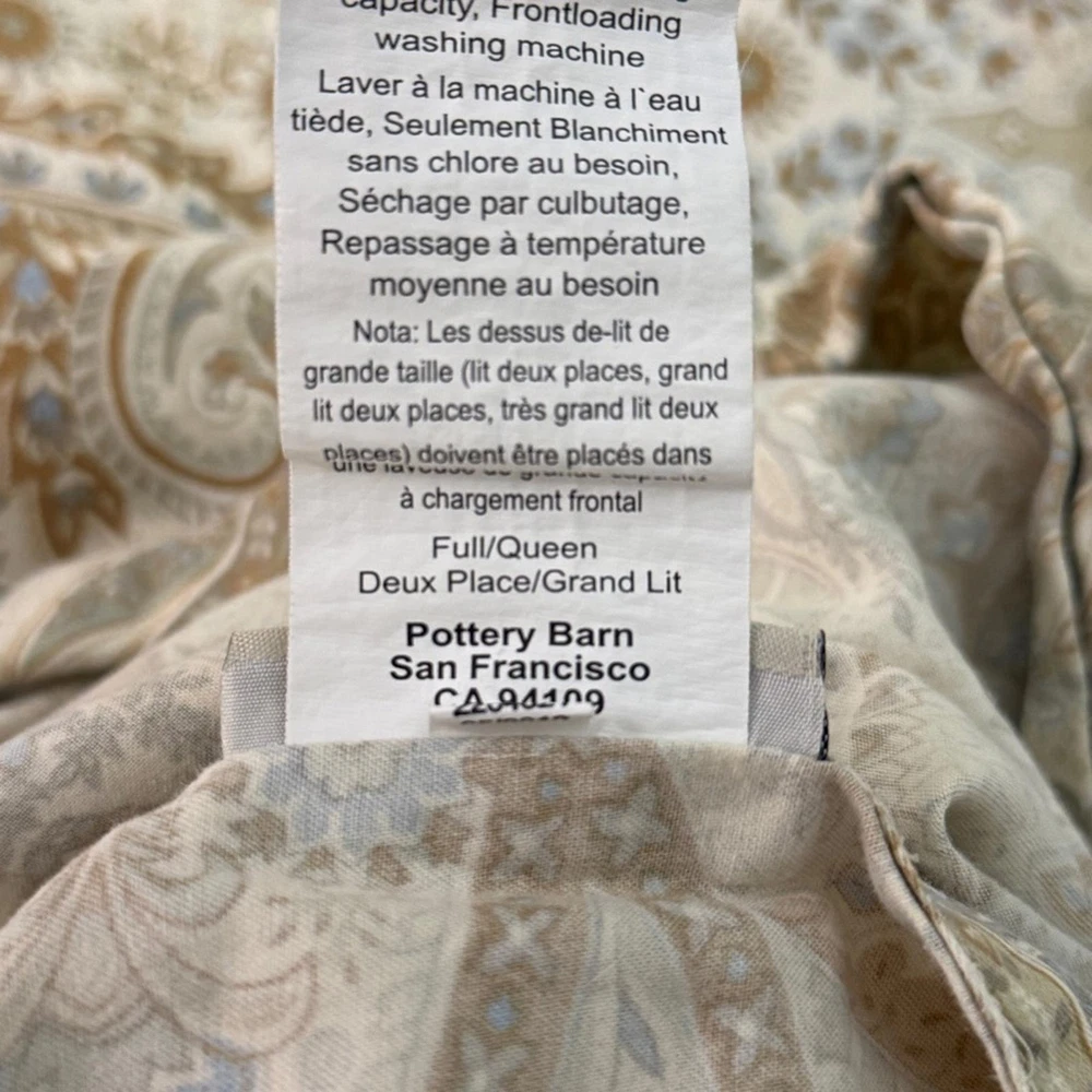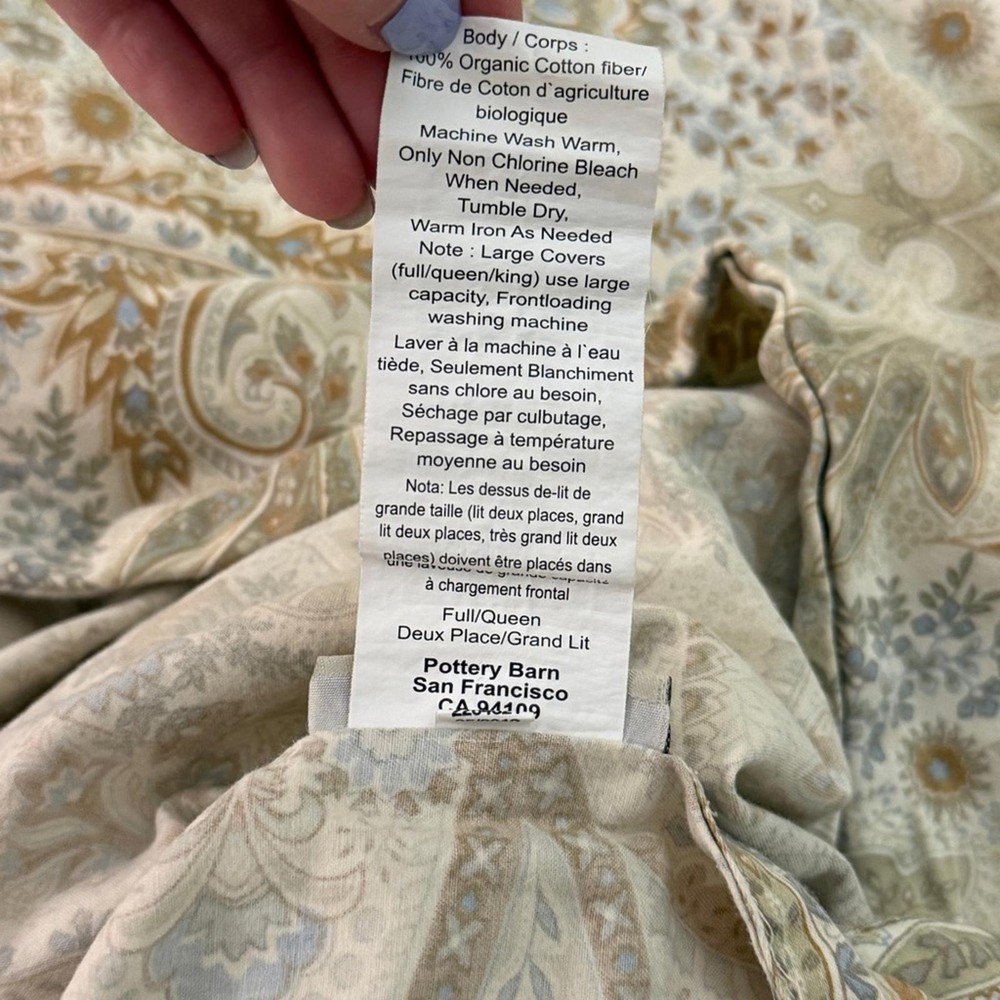 Pottery Barn Blythe Paisley Floral Bedding Set Includes full/queen duvet and two standard shams Duvet has clear button closure and inner ties to hold everything in place. Shams feature envelope closure. All pieces reverse to same pattern. Super soft 100% cotton. Lightweight and airy, perfect pairing with a down feather duvet insert. Warm tones of cream, butter yellow, green, and baby blues. Very light and almost neutral, enchanting. Very good pre-owned condition. One button is missing from duvet cover and one edge of pillow sham is fraying, as seen in photos.