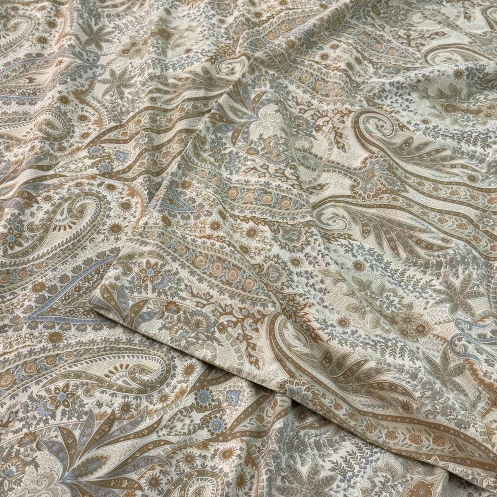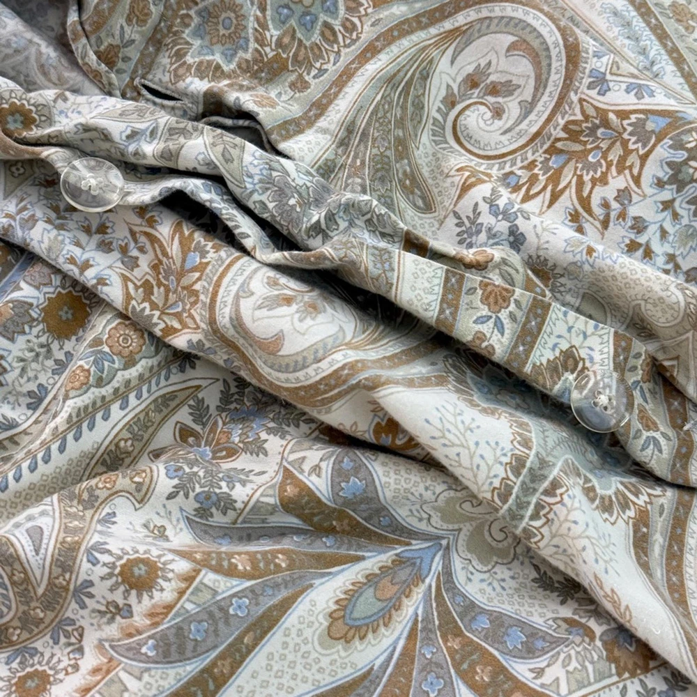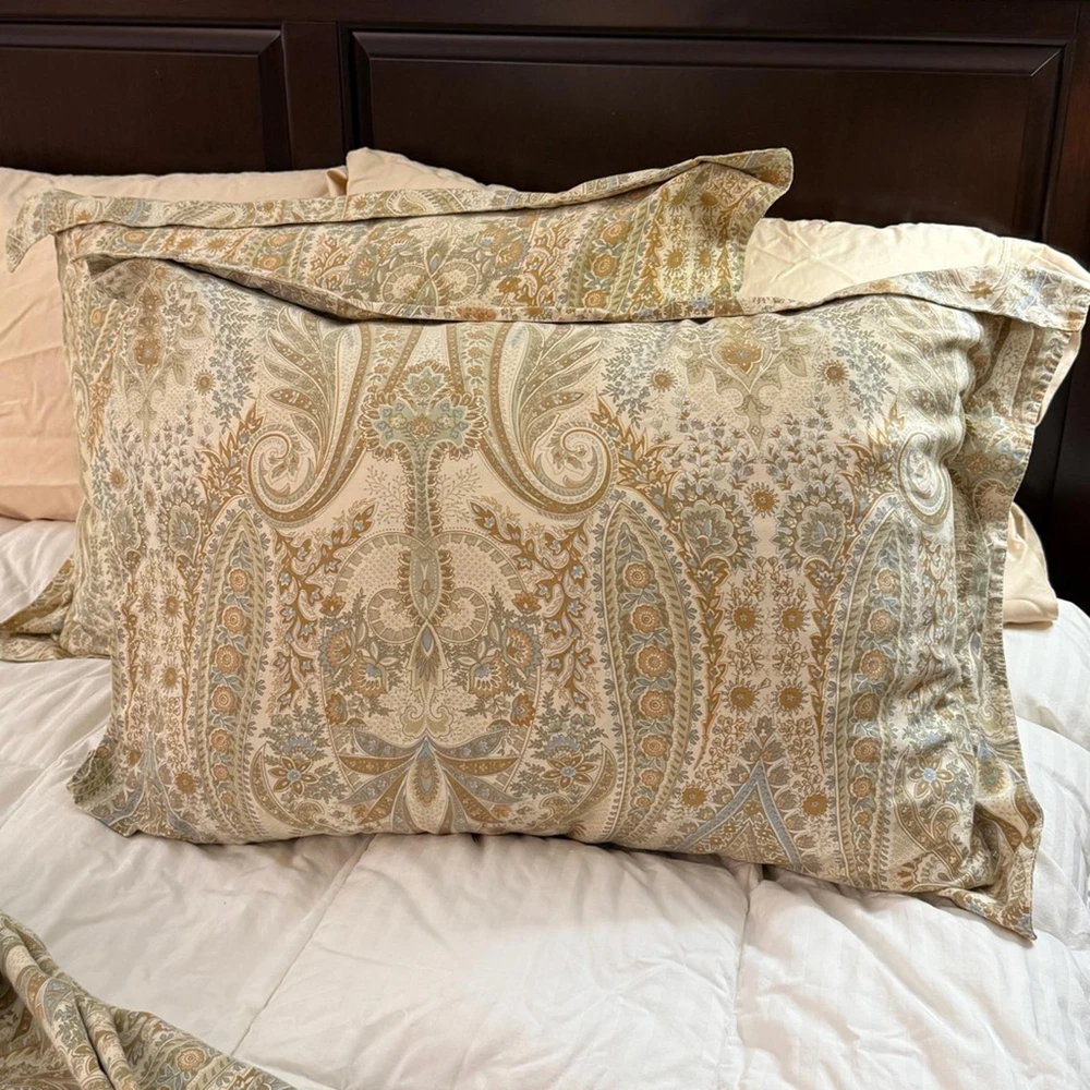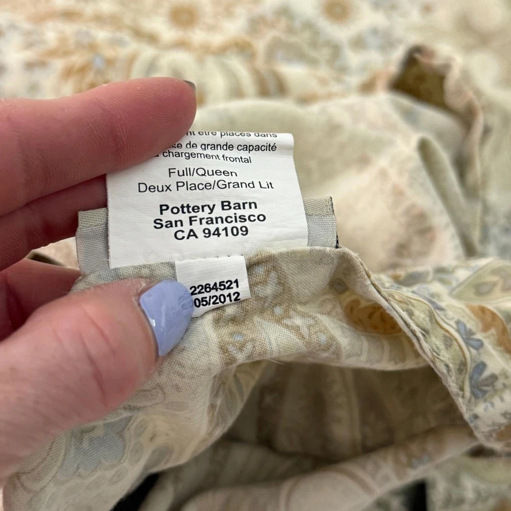 Pottery Barn Blythe Paisley Floral Bedding Set Includes full/queen duvet and two standard shams Duvet has clear button closure and inner ties to hold everything in place. Shams feature envelope closure. All pieces reverse to same pattern. Super soft 100% cotton. Lightweight and airy, perfect pairing with a down feather duvet insert. Warm tones of cream, butter yellow, green, and baby blues. Very light and almost neutral, enchanting. Very good pre-owned condition. One button is missing from duvet cover and one edge of pillow sham is fraying, as seen in photos.