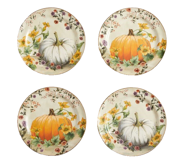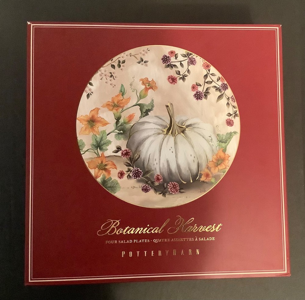 POTTERY BARN BOTANICAL HARVEST PUMPKIN SALAD PLATES NEW IN BOX Make your seasonal celebrations memorable with dinnerware that gleams with exquisite artwork. Our Botanical Harvest Dinnerware Collection depicts original designs painted in our own studio using vivid colors and realistic details. Each piece is bordered by a gold rim. Made of 100% stoneware with a glazed decal finish and a gold rim. Includes two of each design (2 orange and 2 white pumpkins) Set of 4 Overall: 8.75" diameter Dishwasher and microwave safe. While dishes are microwave safe, they may become hot. Handle carefully. Imported. Fast shipping from a smoke-free, pet-free home. Thank you for shopping with m e. Feedback from Buyers: * "This is, by far, the best shopping experience I’ve had ever. Period. This seller went above and beyond to make sure she did every single thing possible to get me the sheet set I’d ordered. And then she followed up with a generous thank you. I’ve never had so much fun buying something!" * "The seller could not have made it any easier to make a purchase. The communication concerning the status of shipping and any follow up questions was quickly answered. This is what real customer service feels like. I would purchase from this seller again!" * "So so sorry for the belated feedback. This was the best seller I have ever encountered on eBay or anywhere for that matter, so kind, thoughtful, personable, accommodating. Went out of her way to get me the items even faster than ASAP w/out upcharge. Everything was pristine, beyond perfect, impeccably wrapped, I am so grateful and was thrilled to have the items needed for my first post COVID dinner party. She is a model for all sellers, her customer service is beyond compare, incredible actually. "