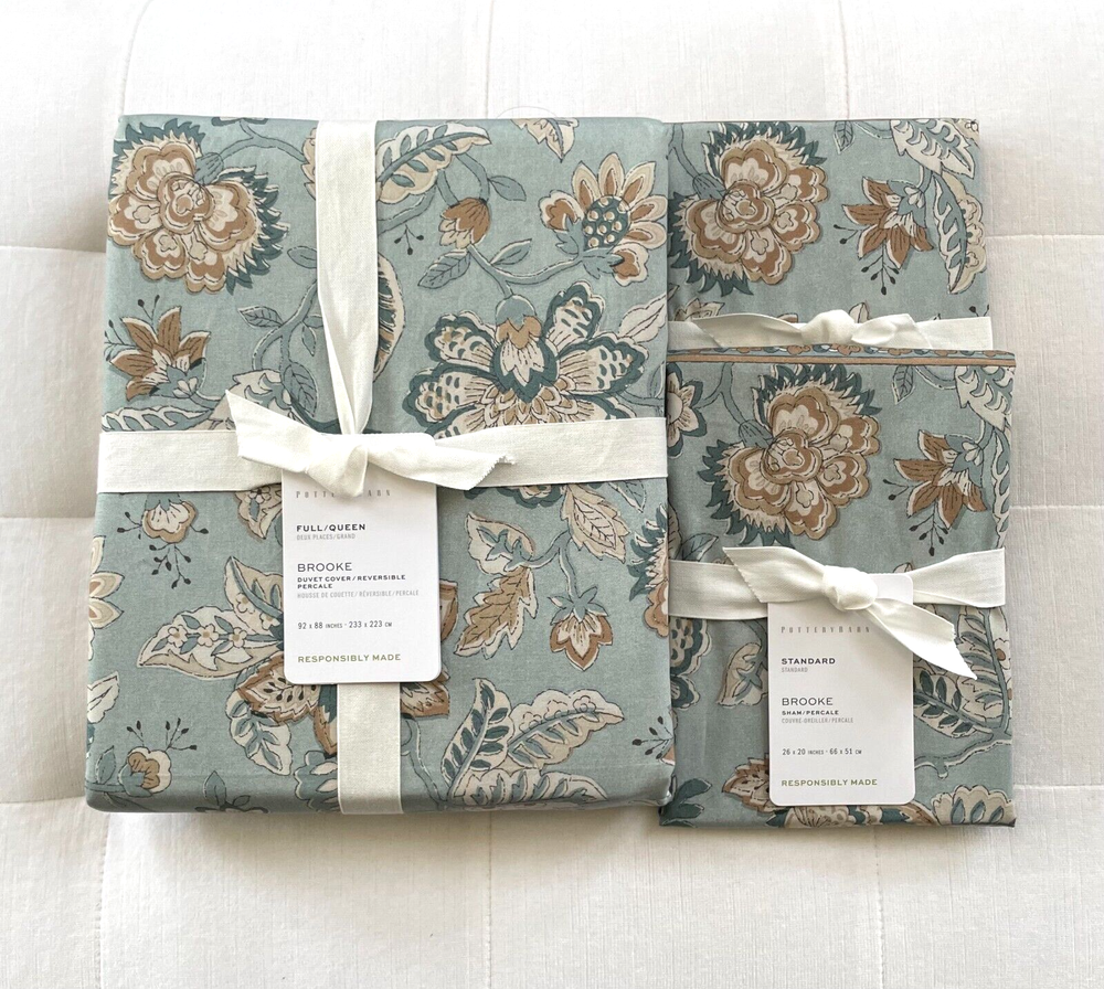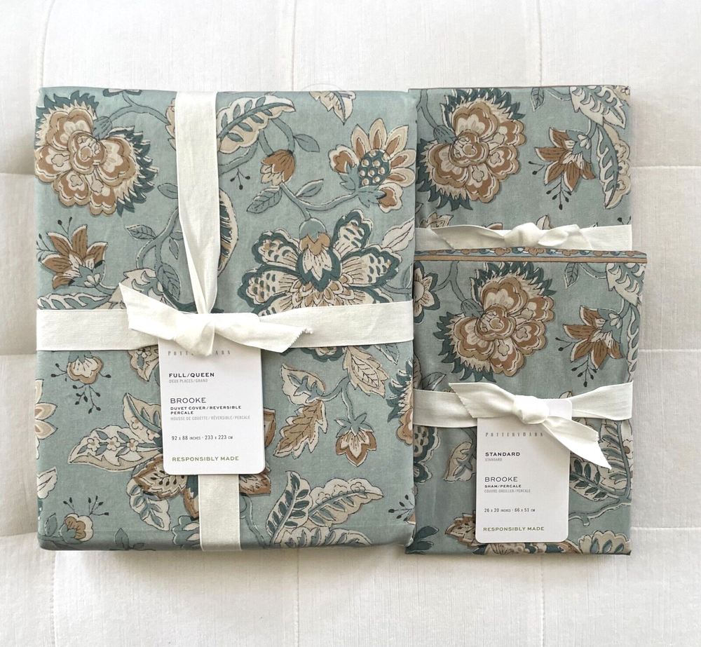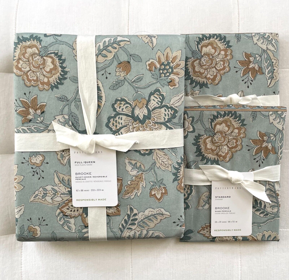 Pottery Barn Brooke Floral Printed Duvet Cover Full/Queen & Two Standard Shams New with Tag PB describes as: Influenced by the familiar softness and authentic character of well-loved textiles, this block-print-inspired bedding pairs traditional design with perfectly lived-in comfort. A reliable favorite for its naturally relaxed look, Brooke is an essential layer, no matter the season. Made from 100% cotton; reverses to same. 200-thread count Percale. Duvet features a hidden button closure with inner ties to keep insert in place. Shams feature a zipper closure. Inserts are sold separately. By choosing our cotton products, you’re supporting our investment in Better Cotton’s mission. This product is sourced via mass balance and therefore may not contain Better Cotton. Imported. Wash before first use. Machine wash in warm water; gentle cycle. Only use non-chlorine bleach, if needed. Tumble dry on low heat; remove promptly. Warm iron as needed. Full/Queen Duvet: 88" l x 92" w Standard Sham: 20" w x 26" l Pet & Smoke free Ships within 1 business day. Thank you