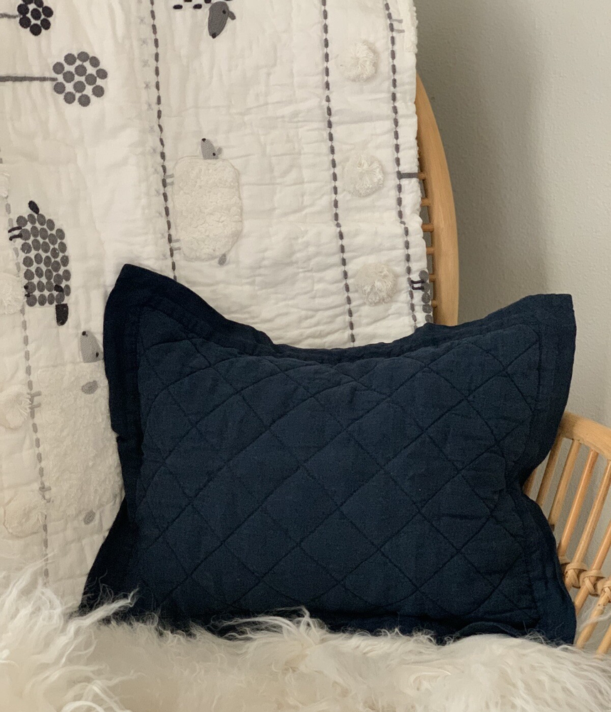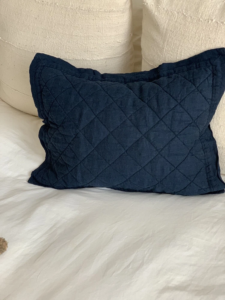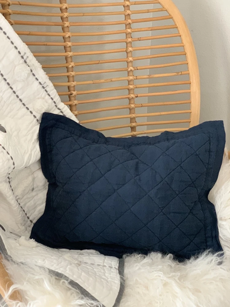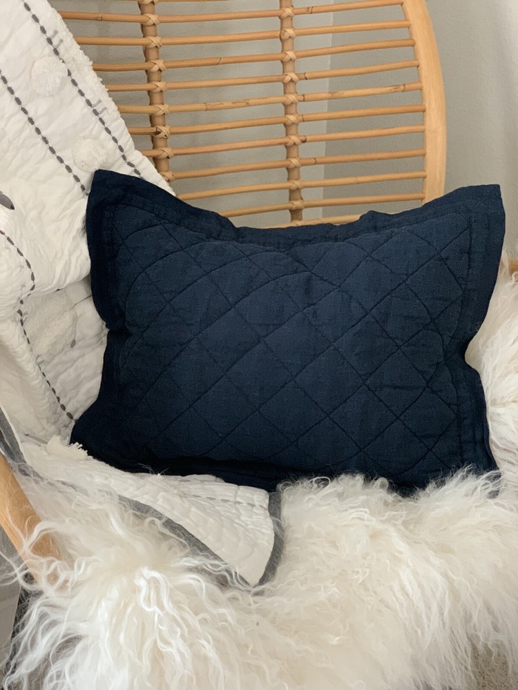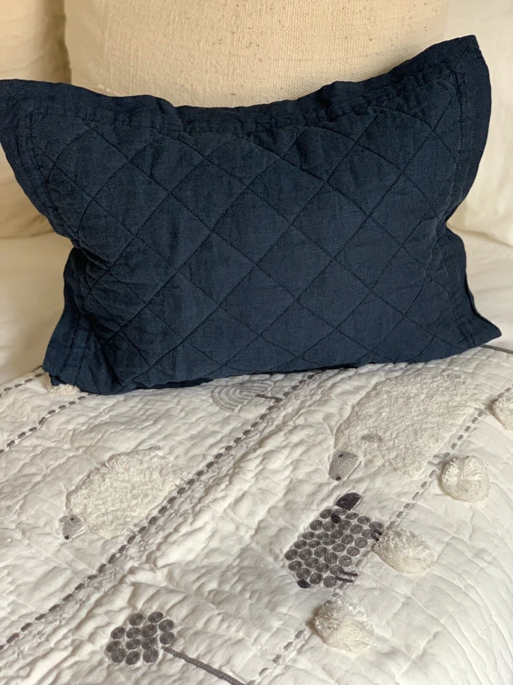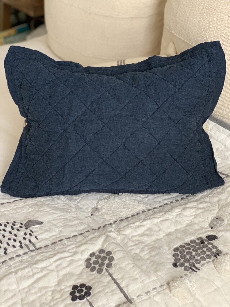 Pottery Barn Baby Belgian Flax Linen Quilted Sham Pillow Cover Only- 12 in x 16 in Navy Blue color Small baby/kids sham pillow cover. Insert pillow is not included. Quilted design 12" x 16" in Machine Washable 100% linen Filling; 100% polyester Hand quilted with decorative stitching