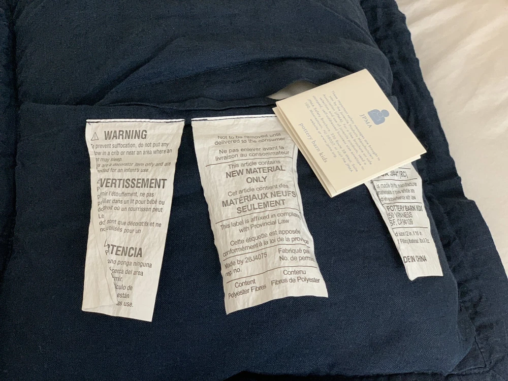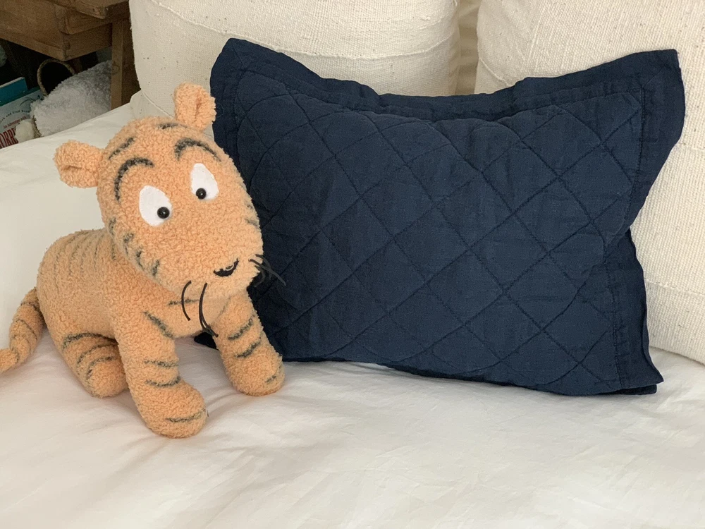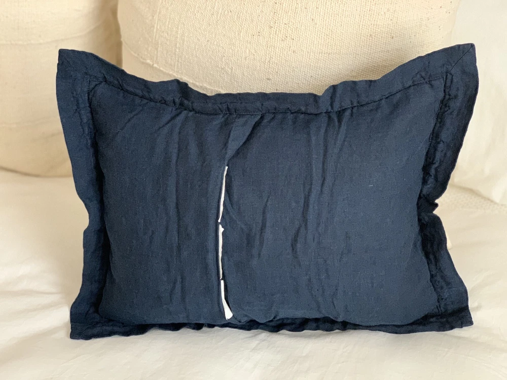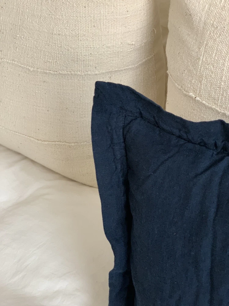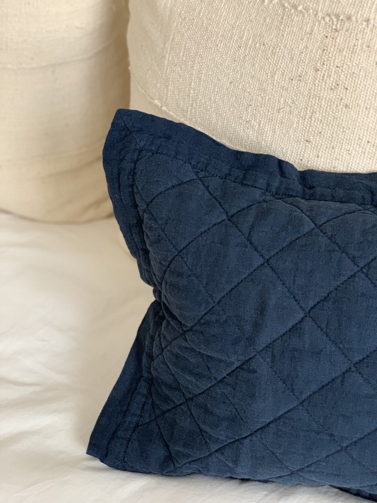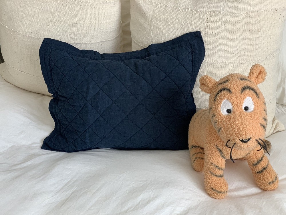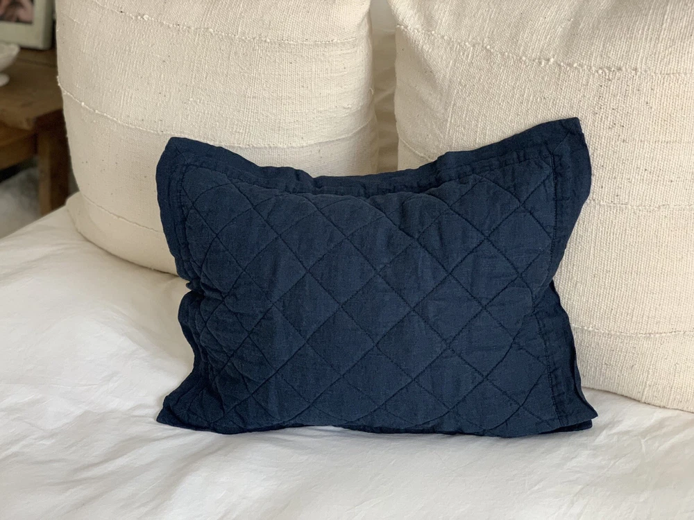 Pottery Barn Baby Belgian Flax Linen Quilted Sham Pillow Cover Only- 12 in x 16 in Navy Blue color Small baby/kids sham pillow cover. Insert pillow is not included. Quilted design 12" x 16" in Machine Washable 100% linen Filling; 100% polyester Hand quilted with decorative stitching