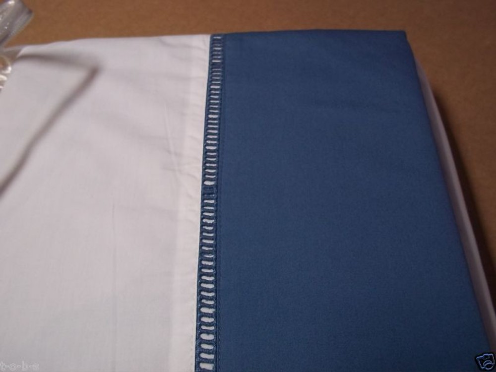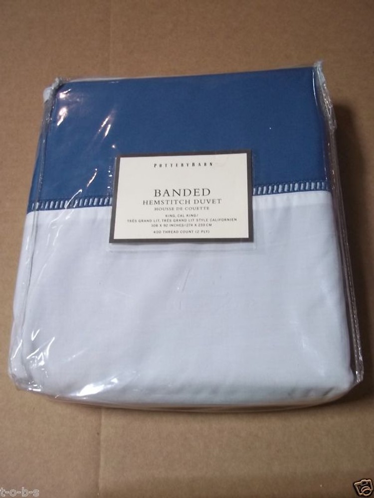 POTTERY BARN Banded HEMSTITCH DUVET.. BRAND NEW IN PACKAGE.. COLOR: Cornflower Blue (dark blue) SOLD OUT IN THIS COLOR AT POTTERY BARN SIZE IS KING/CALIFORNIA KING Wide bands of color edge this 2-ply white cotton percale duvet cover 100% cotton percale. 400-thread-count. An Easy-Care finish ensures that the bedding emerges smooth from the dryer. Accented with a row of hemstitching. Duvet cover has a hidden button closure and interior ties to keep the duvet in place. Machine wash.