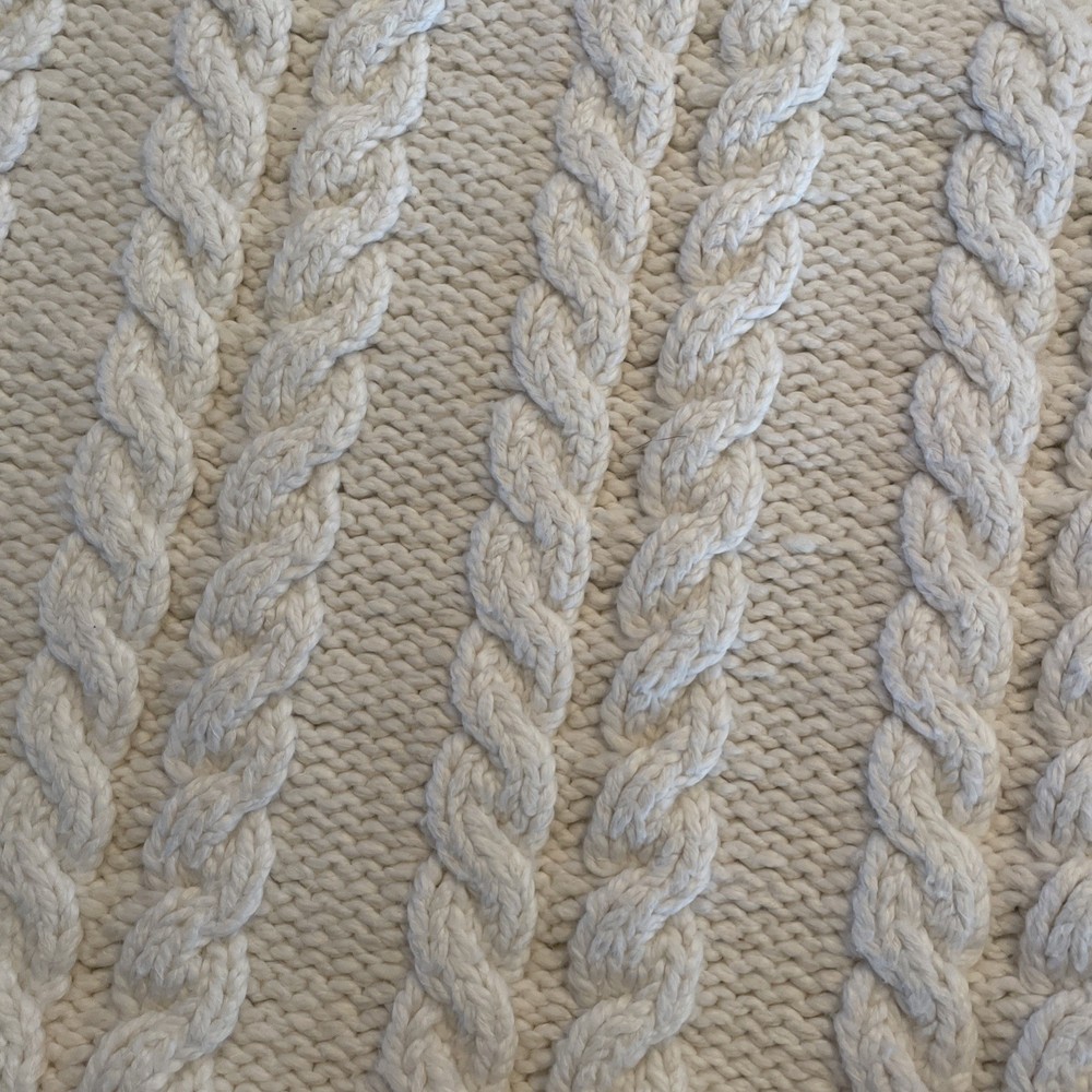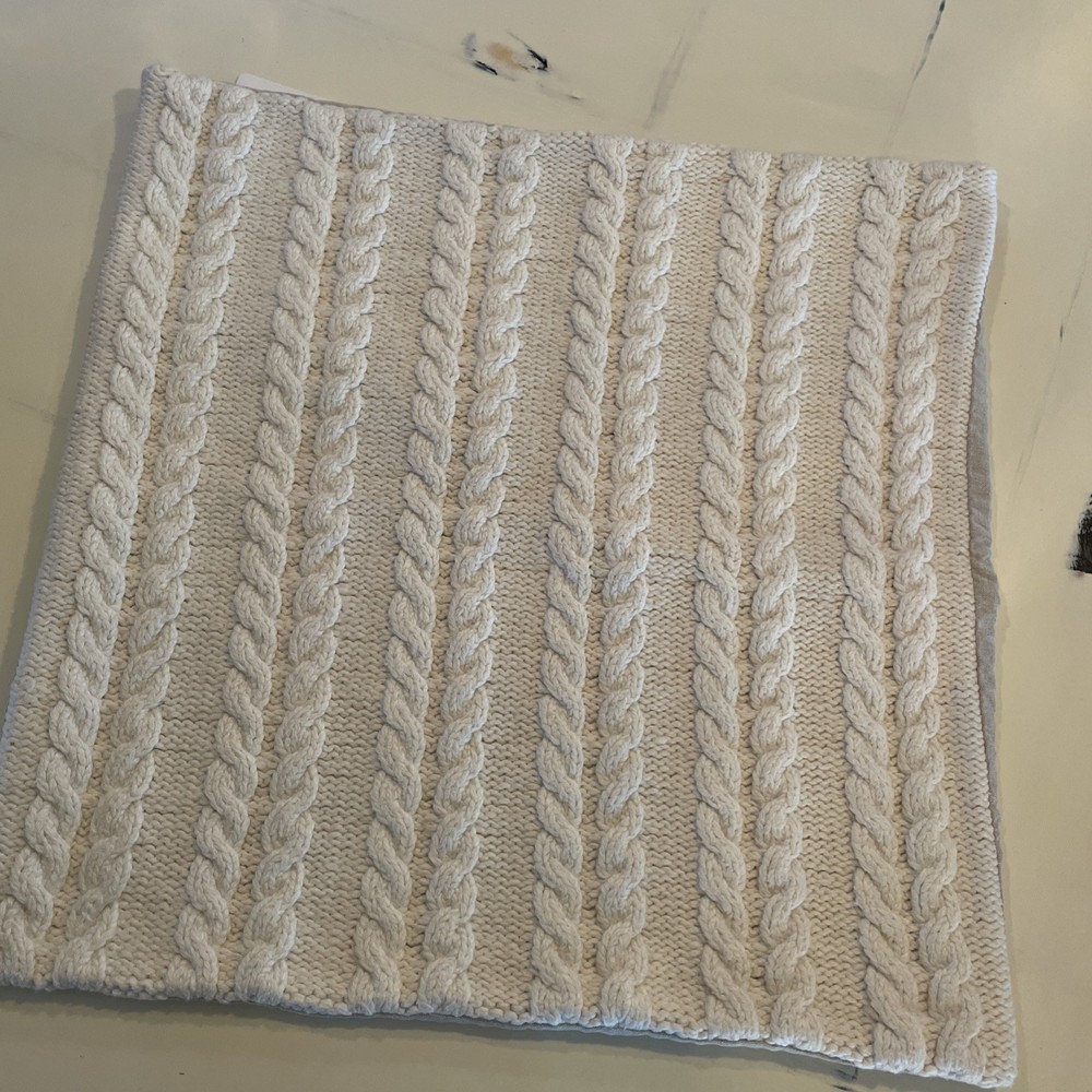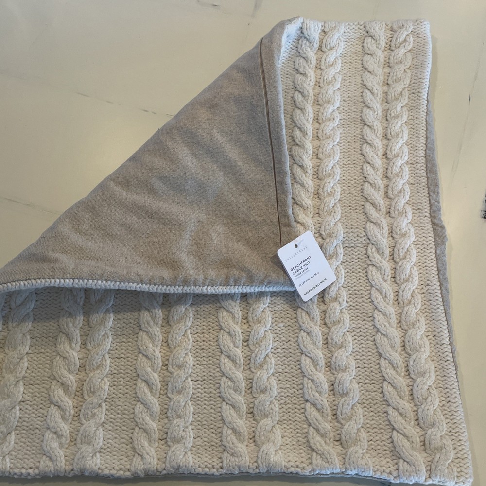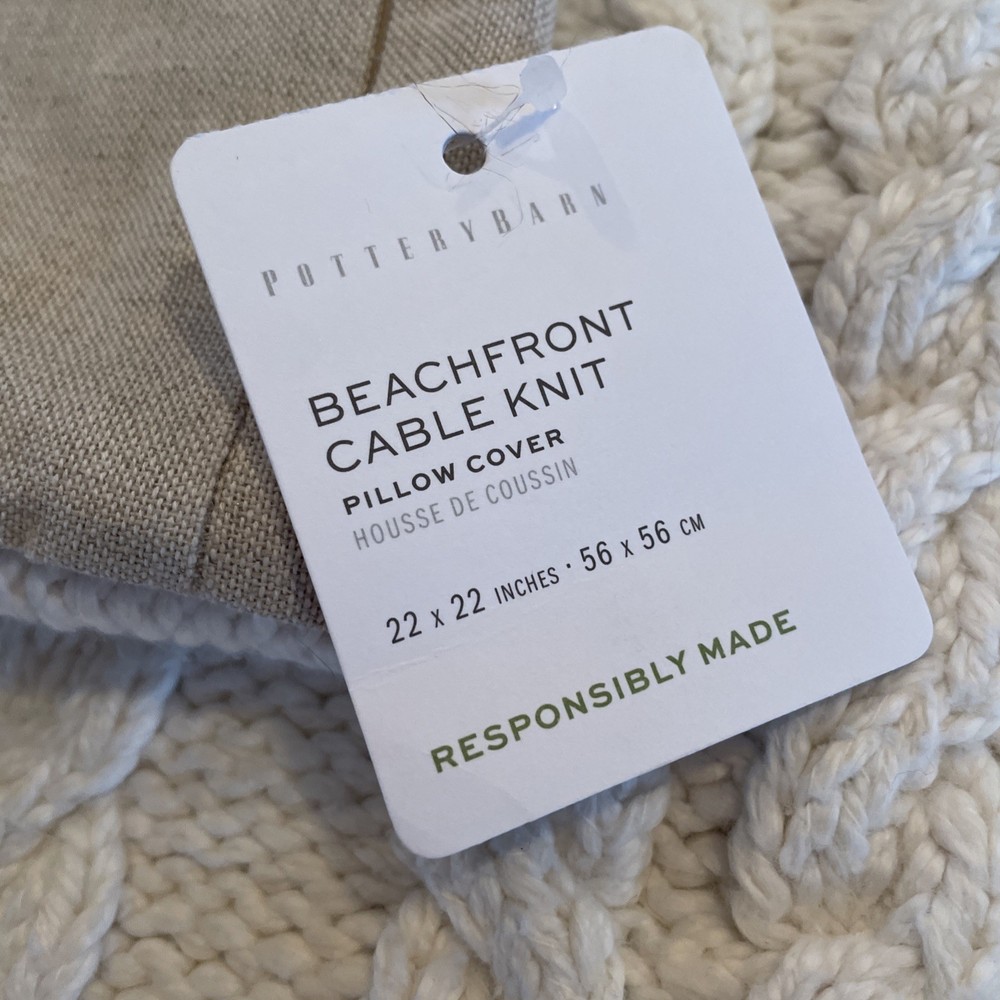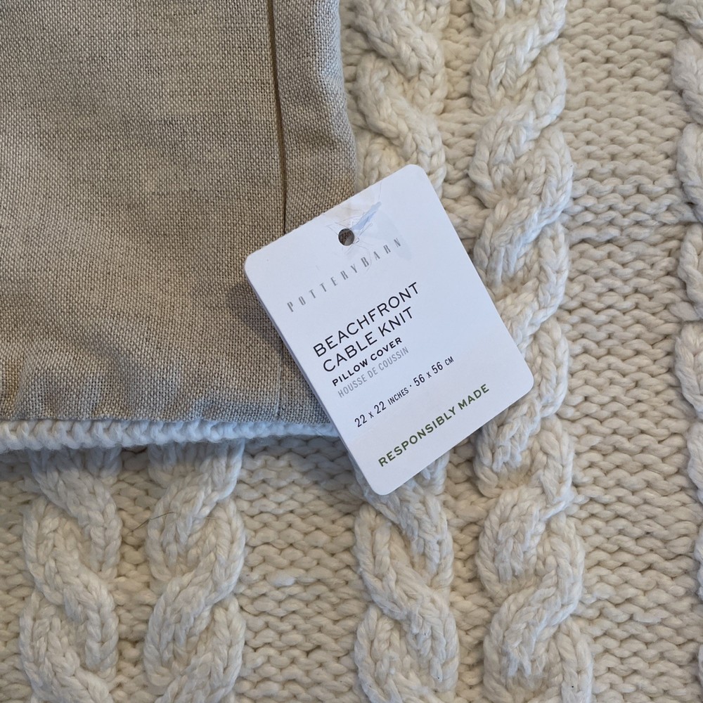Pottery Barn Beachfront Cable Knit Pillow Cover qty: 1 NEW With TAGS Made with 100% cotton, reverses to 52% linen and 48% cotton. Zipper closure. Accommodates 22" square insert. Imported. By choosing our cotton products, you’re supporting our investment in Better Cotton’s mission. This product is sourced via mass balance and therefore may not contain Better Cotton. CARE: Machine wash in warm water, inside out; gentle cycle. Only non-chlorine bleach when needed. Tumble dry on low heat; remove promptly. Warm iron as needed. DIMENSIONS: Overall: 22" sq