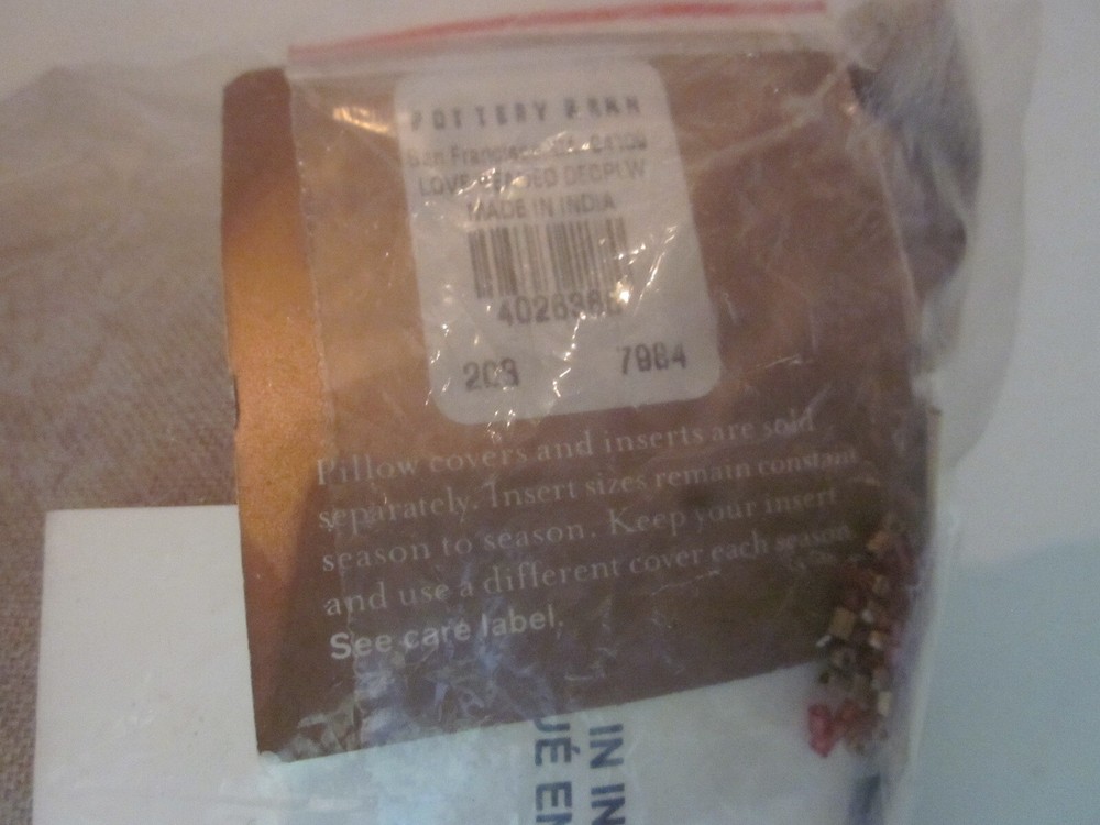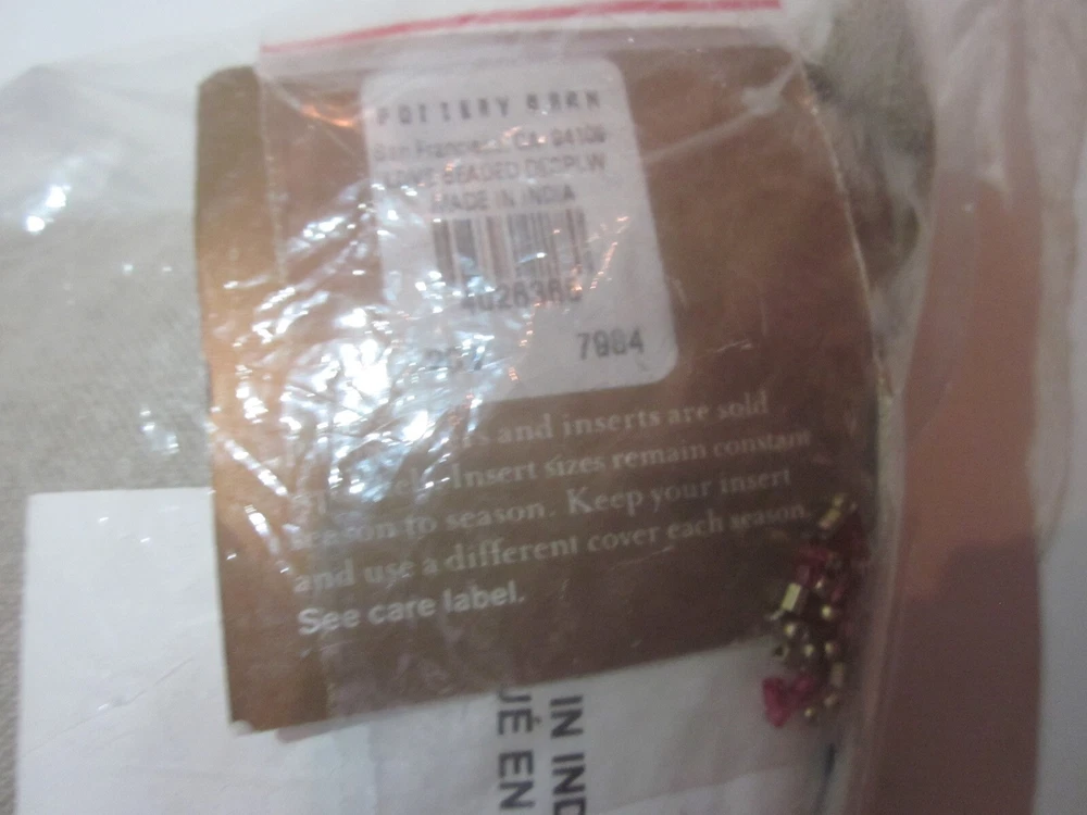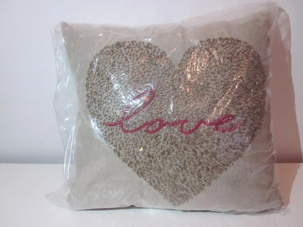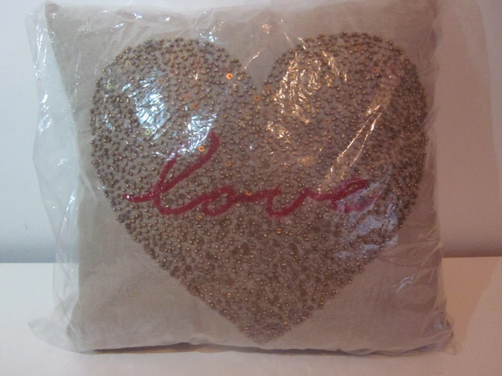 From Pottery Barn, is this rare 1st Version Love Beaded Accent 12" Pillow. More details are as follows: New in Package with Tags Extra Packet of Beads from Manufacturer (both - red and gold) Cover is made of Cotton Lining is made of Polypropylene Filled with Polyester Features a hidden zipper Spot Clean Imported from India This is a beautiful, classy pillow with just the right amount of bling. The tracking number will be listed. Items will be shipped by the end of the next business day, after payment is received. "Buy It Now's" have immediate payment due, and is appreciated. I offer combined shipping, when possible, i f interested in other items I have up for auction. Just e-mail me before bidding on multiple auctions, and include your zip code for a combined shipping price Thank you for your time.