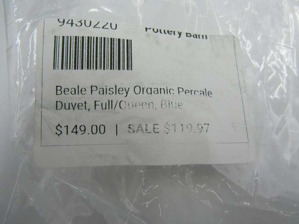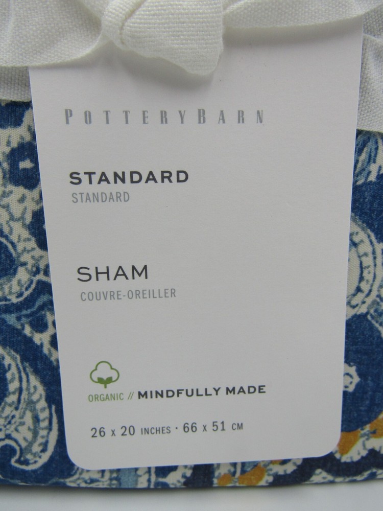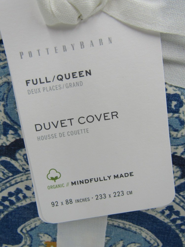 Pottery Barn Beale Paisley Organic Percale Duvet Cover Queen W/ 2 Shams Standard Blue #N196 Item is brand new! Auction includes: 1 Duvet Cover and 2 Standard shams Made of 100% organic cotton. Reverses to self. Duvet cover has a hidden button closure and interior ties to keep the duvet in place 200-thread count. Machine wash. Imported. DIMENSIONS Duvet Cover Full/Queen: 88" long x 92" wide Sham Standard: 20" h x 26" w Euro: 20" sq King: 20" h x 36" w Flange: 2" w CARE AND MAINTENANCE Machine wash cold, gentle cycle with like colors. Use only non-chlorine bleach if needed. Tumble dry low, remove promptly. Warm iron as needed.