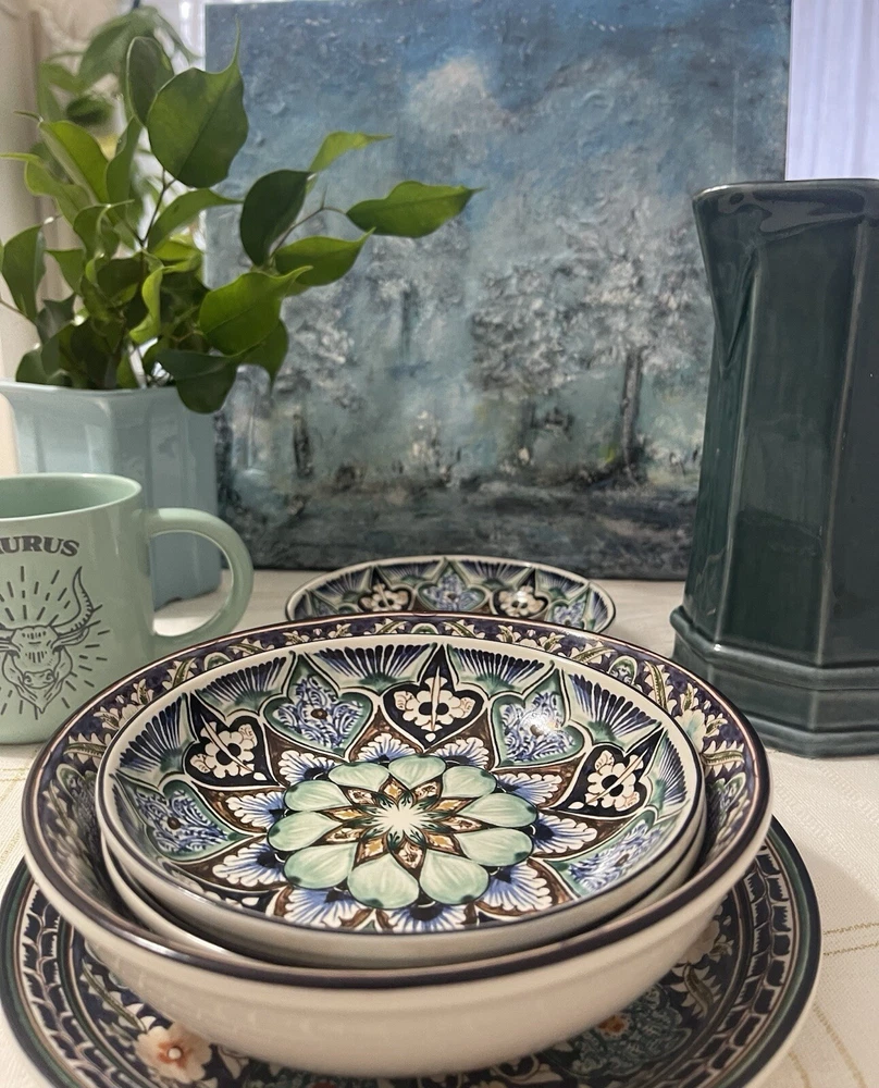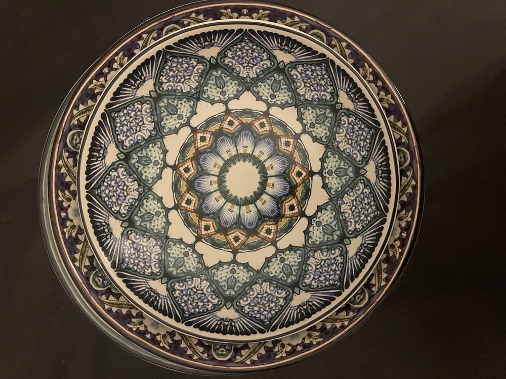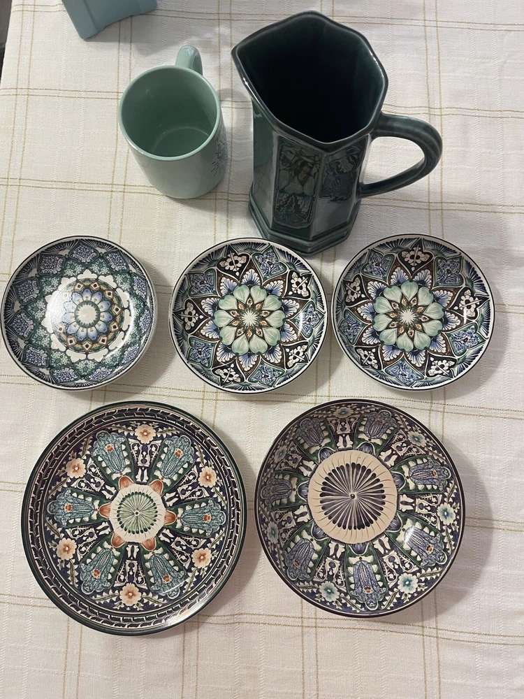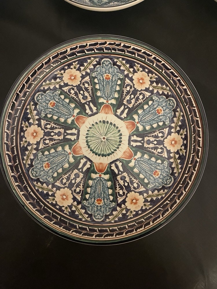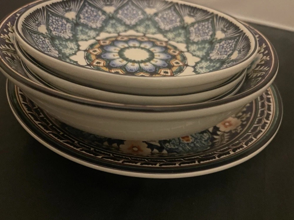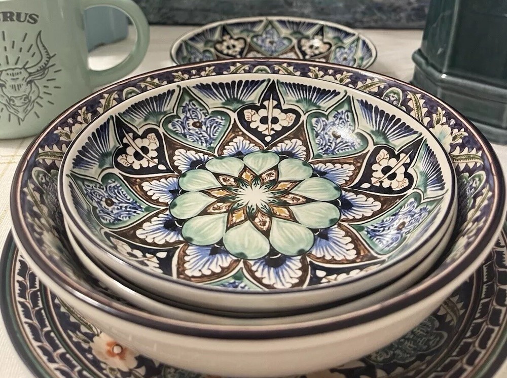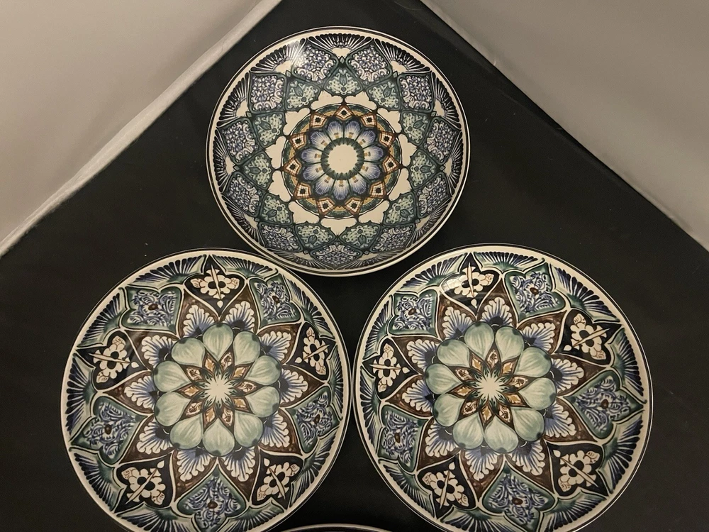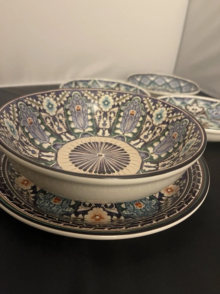 Beautiful and in perfect condition! 3 Dip Dishes 12/each (6 inch) Dinner plate $35 (10,5 inches) Bowl $45 (8 inches) Description: Blue Geometric Floral Print, Rim, Smooth Pattern: Mezze Blue by Pottery Barn China Status: Discontinued. Actual: 2018 - 2022