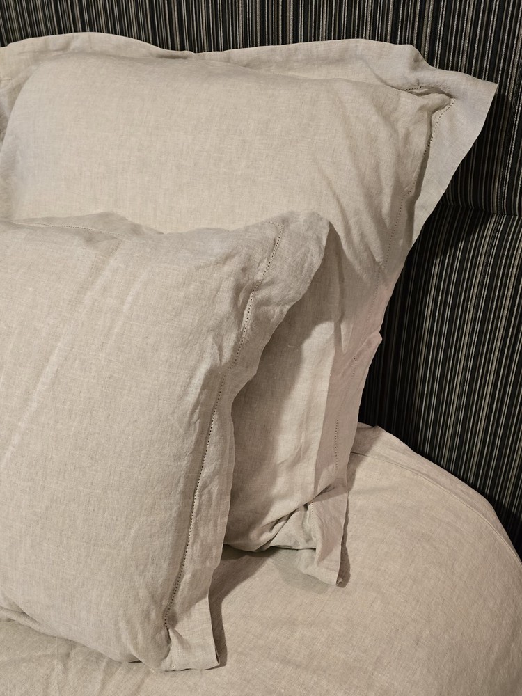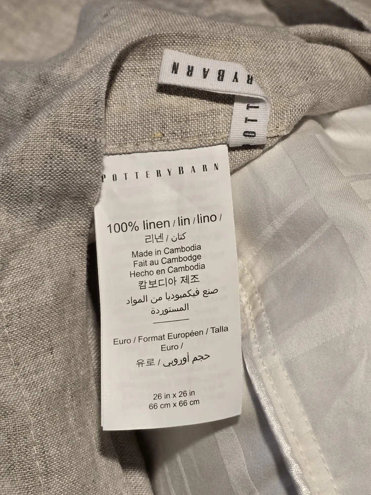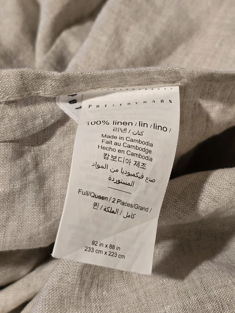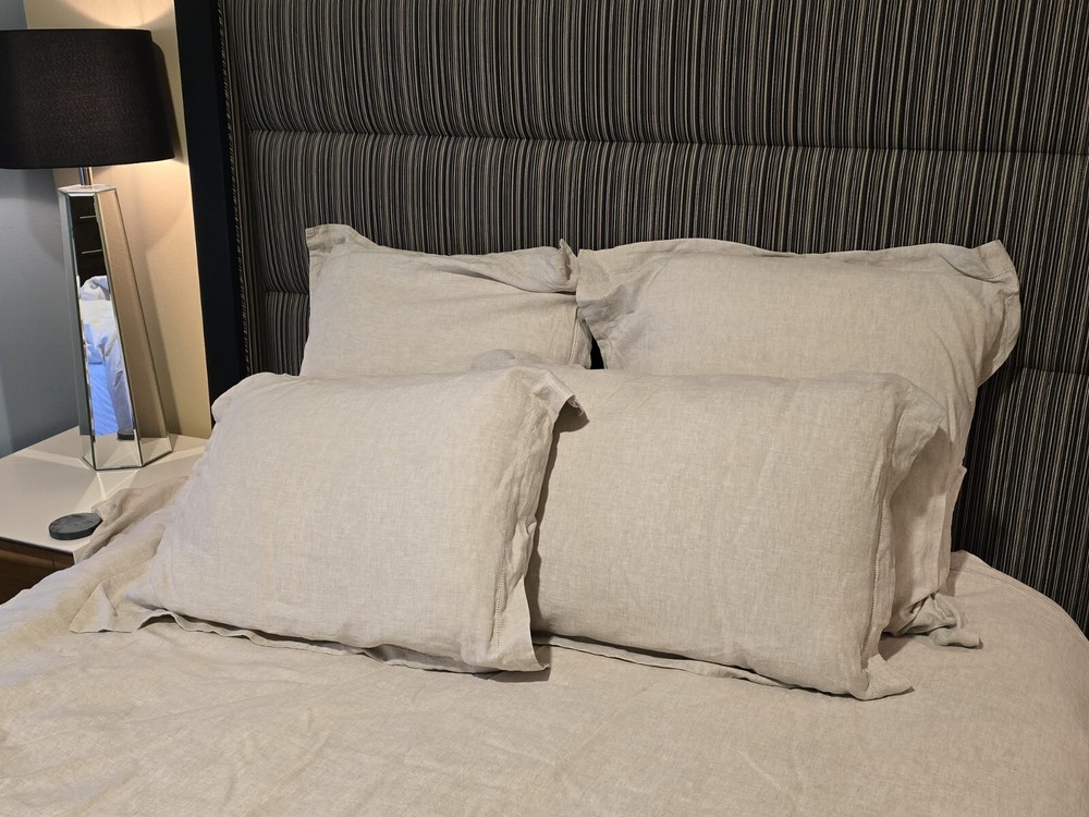 Pottery Barn Belgian Flax Beige Linen Double Flange Queen Duvet Cover Set 5Pc Set includes duvet, 4 pillow shams. New set as seen from spare bedroom. Never slept in. See photos and labels. Labels include sizes. Extremely clean home. Pillow and duvet inserts NOT included.
