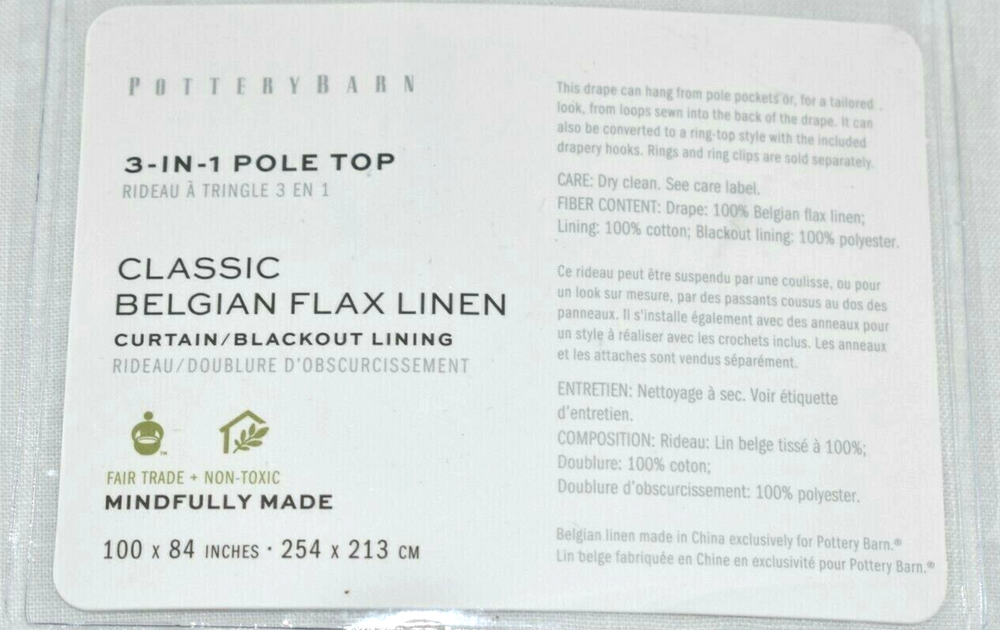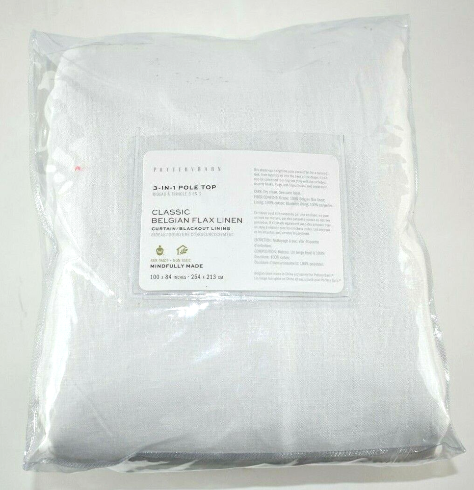 This listing is for one Pottery Barn Belgian Flax Linen White 100x84 Double Wide Drape or Curtain Panel! Condition: Drape is new and unused in the original opened package. Drape was briefly unpackaged, then carefully repackaged. No curtains hooks are included. Exterior package may show light wear and tear--nothing that affects the drape at all. Dimensions: 100" wide x 84" long Color: White Lining:Blackout " Woven from the finest Belgian flax fibers, this curtain is an elegant option for any room in the home, especially when left long to create a glamorous pooling effect at the floor. A blackout lining provides maximum light control." Made of 100% Belgian flax linen. 100" wide x 84" long Side Hem: 1" wide Bottom Hem: 4" high Rod pocket: 3" high Length includes height of rod pocket. Our curtain’s 3-in-1 construction offers three hanging options: rod pocket, back tabs, ring top. Curtain features a 100% polyester blackout lining. The enzyme wash is used to soften and finish fabric, giving it a worn-in look and feel. Medium weight fabric. Curtain hooks are not included. Use with 9 Clip or Round Rings for 50" wide panel, 16 Clip or Round Rings for 100" wide panel (not included). Dry-clean only. Imported. Buyer pays $15.90 shipping. Thanks so much!
