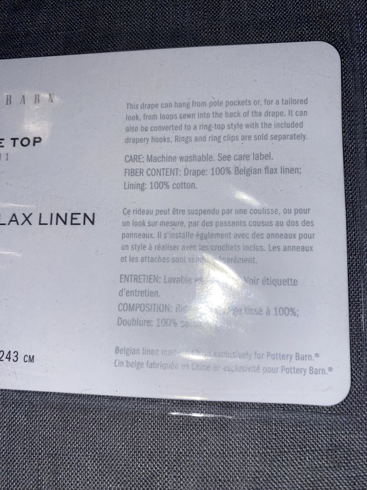 Pottery Barn Belgian Flax Linen 50x96 COTTON LINED Drape Flagstone Gray New with tags in original packaging...