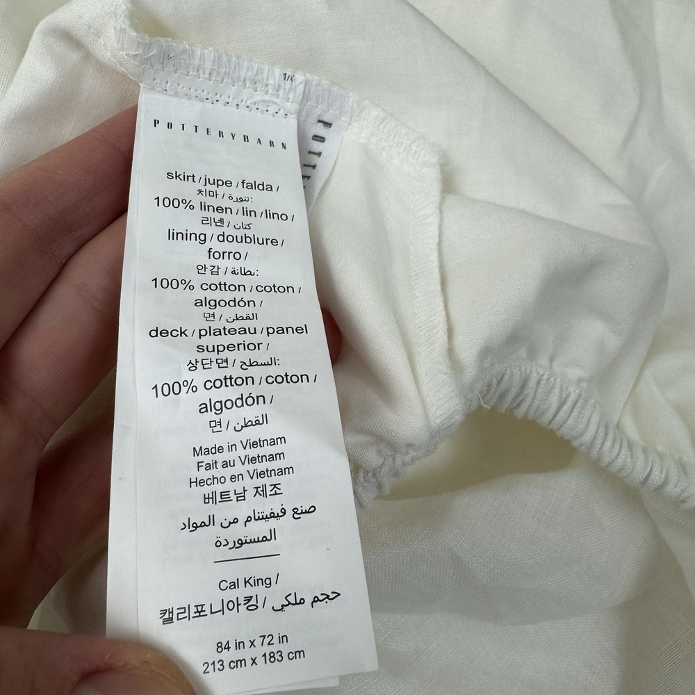 Pottery Barn Belgian Flax Linen Box Spring Cover Cal. King Off White/Ivory NWOT New without tags item / open box - item ships without manufacturer packaging There is a bit of wrinkling throughout from storage / handling Dimensions: 84”x72”