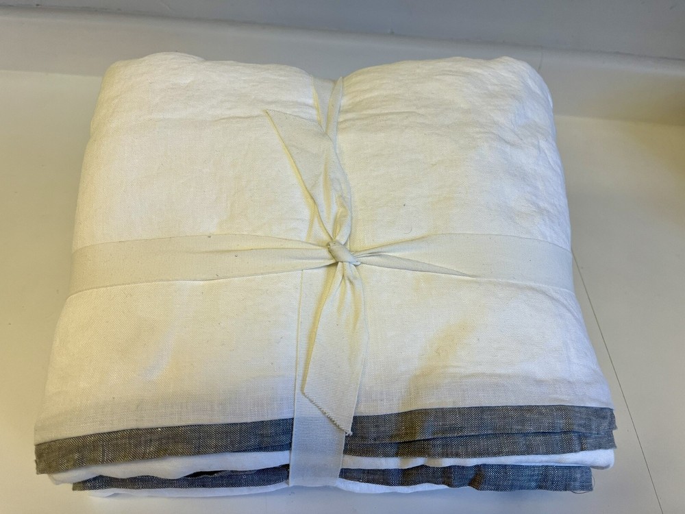 ***Pottery Barn*** Belgian Flax Linen Contrast Flange Duvet Cover Full/Queen Belgian Flax Linen. Reverses to solid. White with Flagstone Flange. Button closure. Machine wash. MSRP: $279. New without tags. Pet/Smoke free environment. Ships - USPS Priority. Please email any questions. Thanks for shopping by!