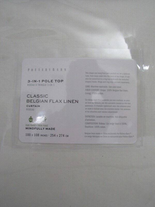 Pottery Barn Belgian Flax Linen Curtain, Classic Ivory, 100" x 108" NWT Pottery Barn Belgian Flax Linen Curtain, Classic Ivory, 100" x 108" NWT New with tags----Open box 1 Panel--100" x 108"----234 x 274cm Color --Classic Ivory Trying to match a curtain you already have? Please check the MPN #1739880 to be sure colors match. MPN numbers are on the Pottery barn, West elm or Crate & Barrel sale tag or the sewn in garment label located on the inside bottom of curtain. Description Crisp linen adds soft texture and a classic look to your windows. Our linen drape is woven from the finest Belgian flax fibers and gently filters sunlight. PRODUCT DETAILS CONSTRUCTION Linen is made from 100% Belgian flax. Our curtain’s 3-in-1 construction offers three hanging options: rod pocket, back tabs, ring top. The enzyme wash is used to soften and finish fabric, giving it a worn-in look and feel. Medium weight fabric. Length includes height of rod pocket. Imported. CARE Dry-clean only. INSTALLATION Curtain hooks included; Round Rings and Clip Rings sold separately. Use with 9 Clip or Round Rings for 50" wide panel, 16 Clip or Round Rings for 100" wide panel. Sold individually. 100in x 108in SIDE HEM: 1" w BOTTOM HEM: 4" h ROD POCKET: 3" h See my other listings for more great items! Please read our return policy before you purchase: We take pride in our business, and we strive to do our best. We purchase brand new items and we do our best to give accurate descriptions and photos. If you have any questions about an item, please contact us through eBay prior to your purchase. We try our best to resolve any issues as fast as possible. Please contact us right away if there are any issues with your purchase. Item must be returned within 30 days of the original delivery date. When we receive the returned item, inspect it, and it is found to be in the same condition that we shipped it in (brand new, unused and in the original packaging) You will immediately receive your refund. Returns that have any signs of use or handling will NOT be accepted and no refund will be given. Thank you! Please read our return policy before you purchase: We take pride in our business, and we strive to do our best. We purchase brand new items and we do our best to give accurate descriptions and photos. If you have any questions about an item, please contact us through eBay prior to your purchase. We try our best to resolve any issues as fast as possible. Please contact us right away if there are any issues with your purchase. Item must be returned within 30 days of the original delivery date. When we receive the returned item, inspect it, and it is found to be in the same condition that we shipped it in (brand new, unused and in the original packaging) You will immediately receive your refund. Returns that have any signs of use or handling will NOT be accepted and no refund will be given. Thank you! Feedback: We strive to give you the best service. If you have any issues regarding your item, please contact us right away . Customer satisfaction is our priority. We accept MasterCard, Visa, Discover, Paypal and American Express, securely and conveniently via eBay Managed Payments. We will use the address listed on your eBay account...so please make sure it is correct. WE WILL SHIP TO CONFIRMED EBAY ADDRESSES ONLY!! DO NOT send money via PayPal if your address is not confirmed...we will not be able to accept it. We provide fast shipping! Your item will be shipped within 1-3 business days via UPS, USPS priority mail or Fed-Ex. We reserve the right to choose shipping company. They can NOT deliver to PO boxes, so please provide us with a physical street address. Once your item is shipped you will receive an email with your tracking number. We are HAPPY to combine shipping on items that can be combined. Please email us for shipping rates to HI and AK. Signature at delivery is required for all items over $250. All items must also be shipped to the address on your eBay account.. We are enrolled in eBay's Global Shipping Program . Only countries approved in eBay's Global shipping can receive deliveries from us. Other Items Feedback Contact txzj pxzj432 txzj-11 txzj1 txzj115