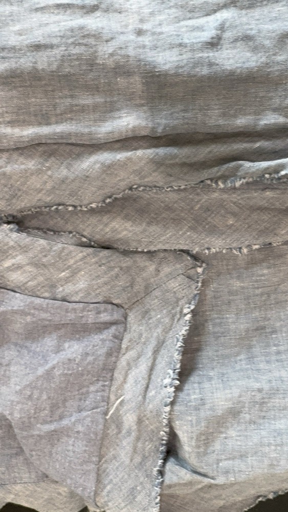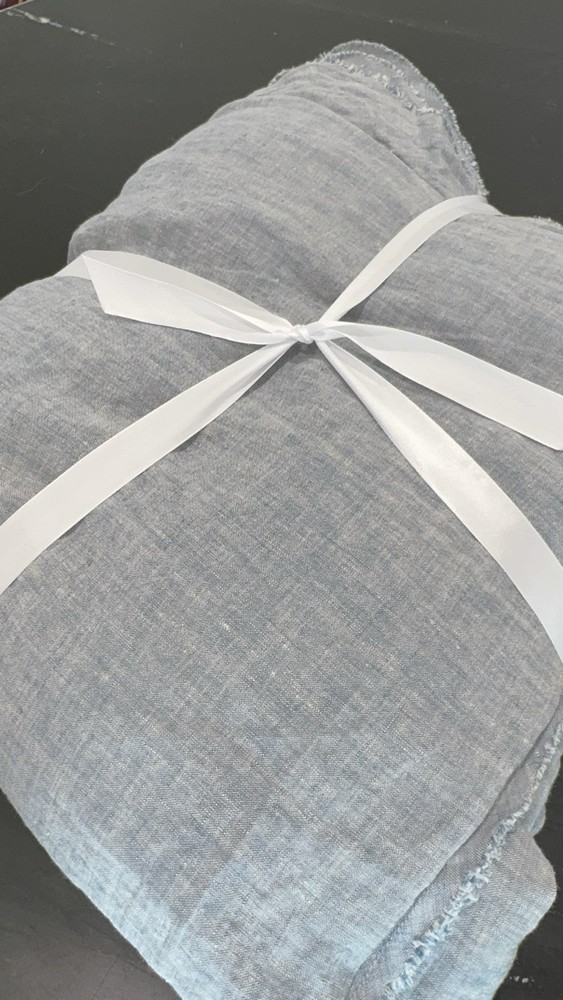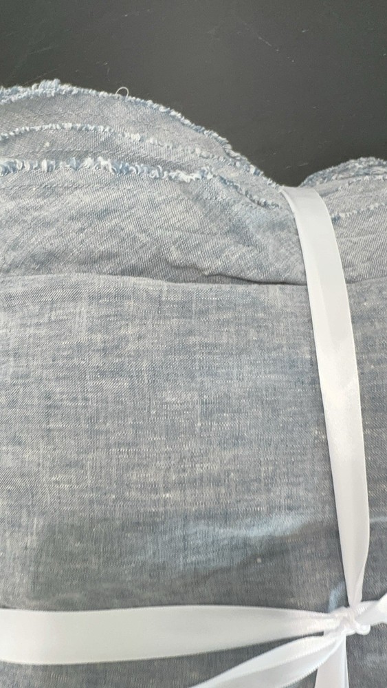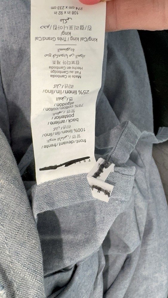Tags marked with black marker as shown in last photo Open box No manufacturing packaging Belgian Flax Linen Double Flange Duvet Cover in chambray king cal king with a relaxed look and luxurious hand Beautifully woven from the world's finest Belgian flax, prewashed for superior softness that only gets better with time. Double flanges with raw edges bring a casual sensibility to the design, while the natural, breathable fibers make this bedding perfect for year-round layering. Natural fibers, like our flax linen, offer beautiful, unique variations in color ensuring your bedding is one of a kind. Linen woven from 100% Belgian flax; reverse is 75% cotton and 25% linen Duvet features a hidden button closure with inner ties that keep the insert in place