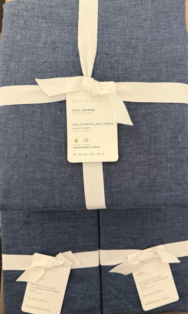Brand new never used excellent (New) condition with tags (as pictured) smoke/pet free environment. ***While I try to post the best images of an item sometimes out of my control factors prevent you from seeing the item in the best view. That being said I encourage you to visit the manufacturers website to view an item in more detail. All items unless specified are “ new” not seconds and unused. That being said also note I do not accept returns. While I want you to be satisfied with your purchase I reiterate viewing images to be sure about color, fabric, care, etc.*** ***if you are interested in multiple items I do combine shipping. Just pay in full and I will automatically refund any overpayment once the appropriate and most economical package is determined. I will only ship USPS priority and Fed ex ground. You must use the same account for items to be combined otherwise they won’t ship together.*** Effortless, timeless, and made for layering, our linen bedding is the epitome of casual luxury. Woven from the world's finest Belgian flax, it's prewashed for incredible softness that only gets better with time. One of our absolute favorite fabrics, linen keeps you cool when it's warm and warm when it's cold. Proudly made at a Fair Trade Certified™ factory. Natural fibers, like our flax linen, offer beautiful, unique variations in color, ensuring your bedding is one of a kind. Details Material: Linen woven from 100% Belgian flax, prewashed for a supersoft hand feel. Reverses to the same. Temperature Suitability: Ideal for warm or cool temperatures. Natural Variation: Color variations are inherent to natural fibers, and slight variations may occur to what is shown online for our Flax color option. Secure Design: Duvet features a hidden button closure with inner ties that keep insert in place; sham features an envelope closure. Certification and Standards: OEKO-TEX® STANDARD 100 certified, tested for 1000+ harmful substances (14.HUS.42449 HOHENSTEIN HTTI). Place of Manufacture: Imported. Care Instructions Linen will get softer with every wash. Machine wash in cold water separately on gentle cycle. Use only non-chlorine bleach, if needed. Line or tumble dry on a low temperature. Warm iron as needed. DIMENSIONS Duvet Full/Queen 88”x92” Sham Euro 26”