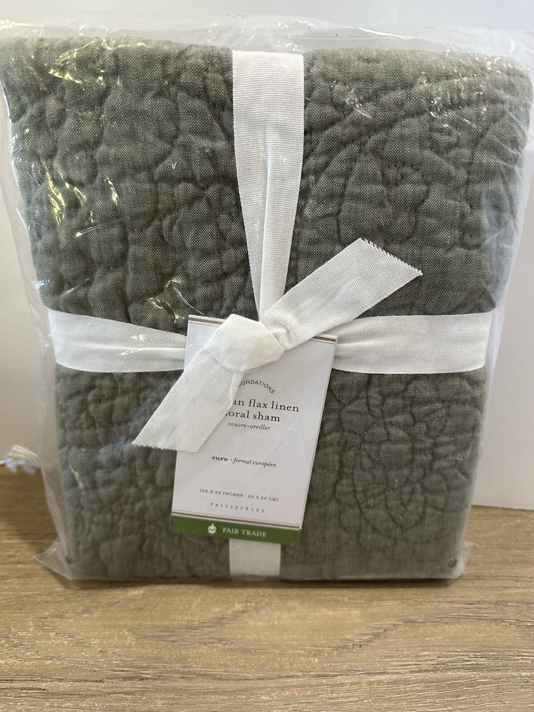 one pottery barn belgian flax linen floral stitch sham size is euro color is loden