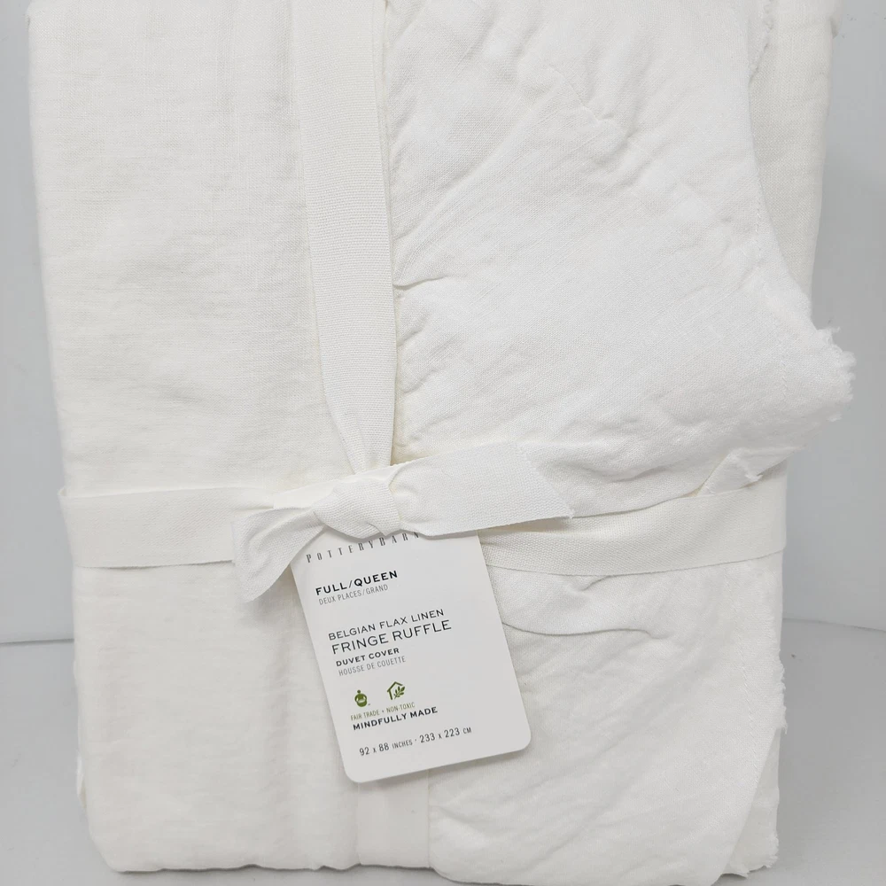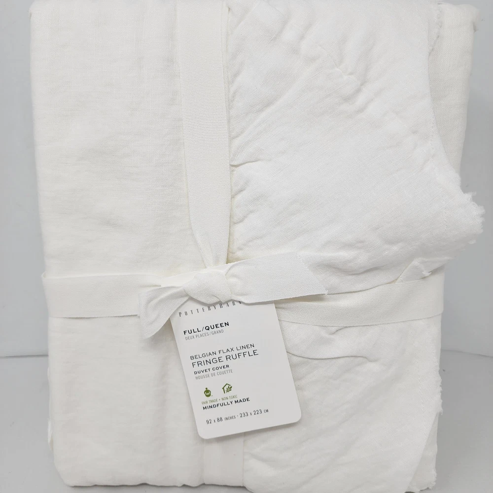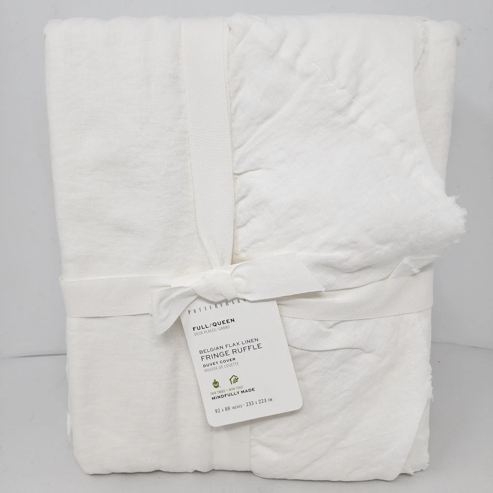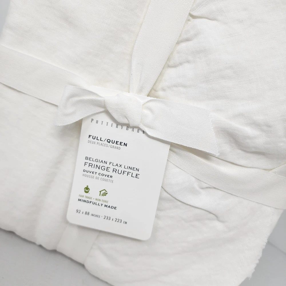 Add a touch of luxury to your bedroom with this Pottery Barn Belgian Flax Linen Fringe Ruffle Duvet Cover. The white color and traditional style of this duvet cover make it a perfect fit for any bedroom decor. Made of high-quality linen material, it is both comfortable and durable. This full/queen size duvet cover features a ruffled design with a solid pattern that adds a unique texture to your bedding. The Pottery Barn brand is known for its quality products, and this duvet cover is no exception. It is perfect for anyone who wants to add a touch of elegance to their bedding without compromising on comfort.