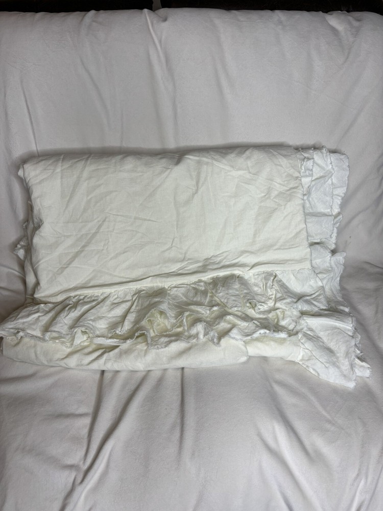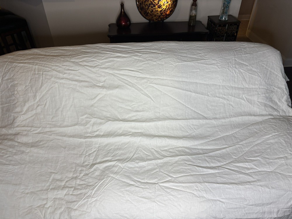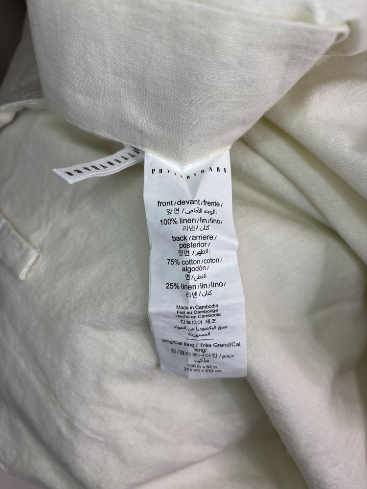 Pottery Barn Belgian Flax Linen Fringe Ruffle Duvet Cover-King/Cal King Classic Ivory color in EXCELLENT CONDITION!!! ** To be honest I was torn between listing this as new item vs pre-owned because it shows no signs of usage*** This is an open box item so will be more wrinkled than normal. No spots / stains Smoke & pet free
