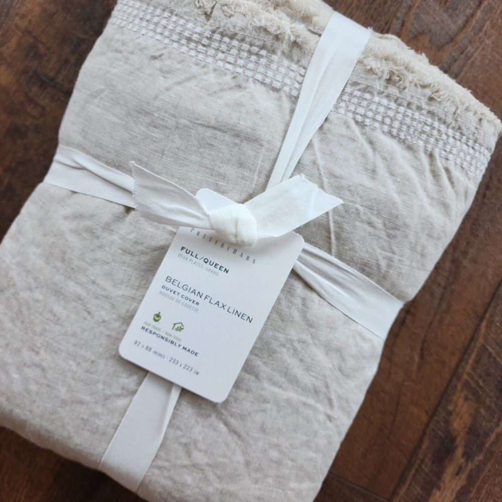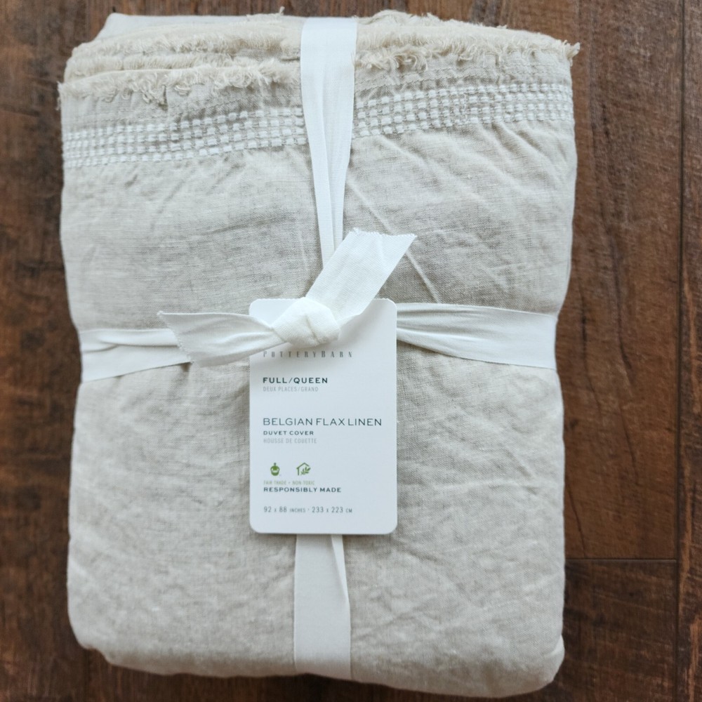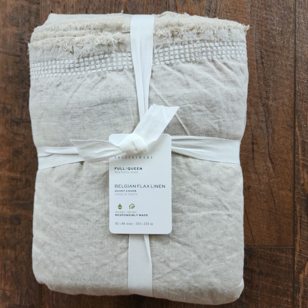 Add a touch of elegance to your bedroom with this full queen duvet cover from Pottery Barn. The fringed border stitch design in flax/white color is perfect for any bedroom decor. Made of high-quality linen material, this duvet cover is durable and long-lasting. The Pottery Barn Belgian model is designed to provide comfort and style to your bedroom. Ideal for any bedroom, this duvet cover is perfect for those who love to decorate their bedroom with unique and stylish bedding sets.