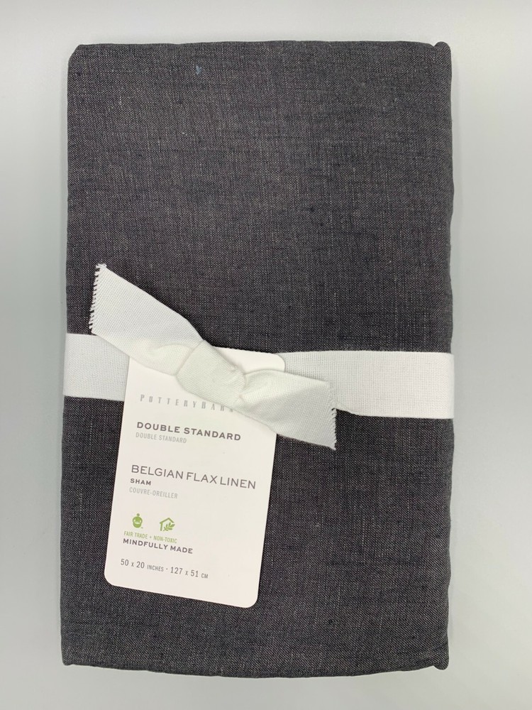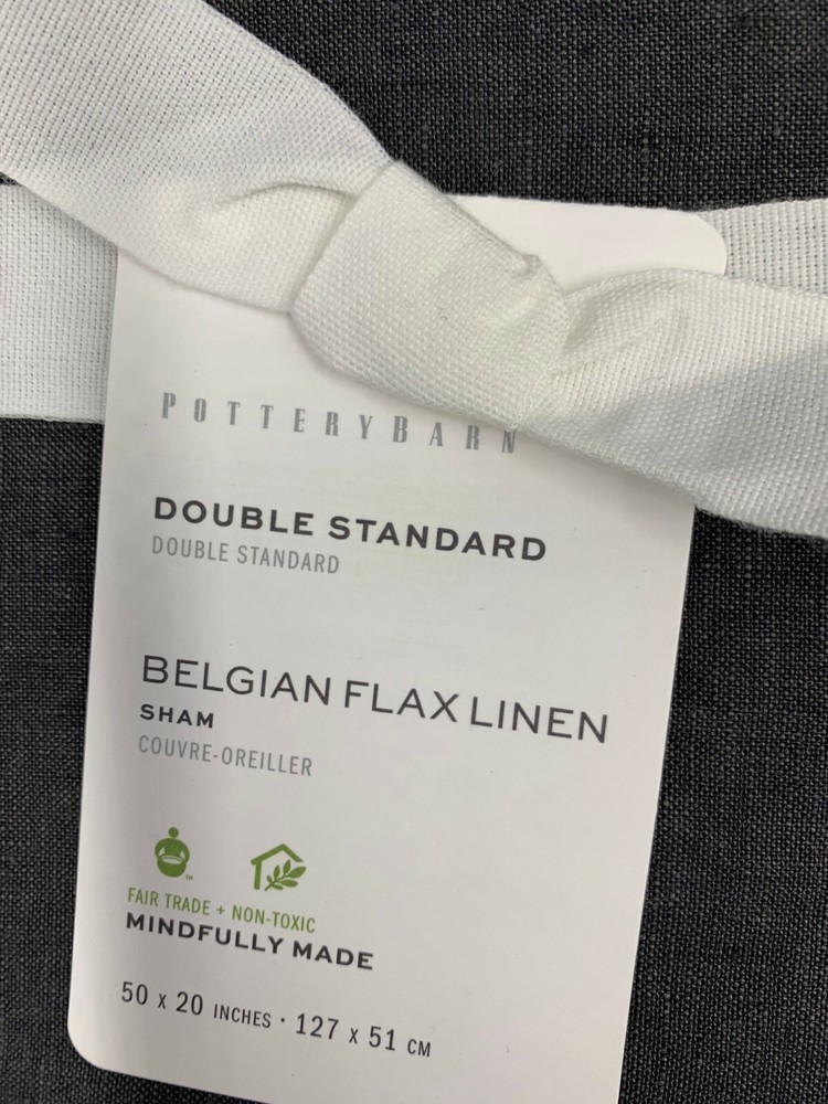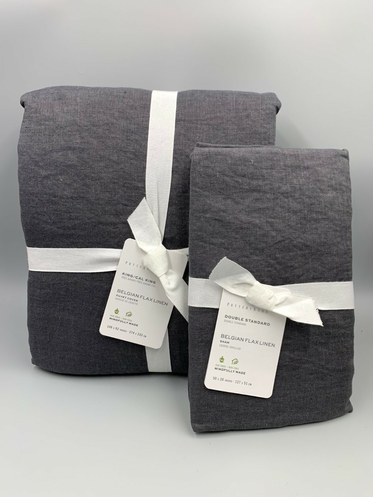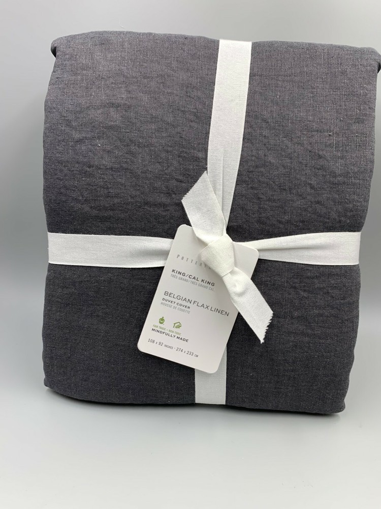 Pottery Barn Belgian Flax Linen King Duvet Cover 1 Double Standard Sham Ebony #351 Item is brand new! Auction includes: 1 King/ Cal. King Duvet Cover and 1 Double Standard Sham Linen woven from 100% Belgian flax. Breathable Belgian flax linen is ideal for warm or cool temperatures, and its durability lets you love it for years. Soft and cool to the touch. Microscopic breaks in the fabric provide a light massaging effect, and high absorbency meaning they'll always feel fresh and cool. Duvet features a hidden button closure with inner ties that keep insert in place. DIMENSIONS Duvet King/Cal. King: 92" l x 108" w Sham Standard: 20" h x 26" w Double Standard: 50" x 20" Euro: 26" sq King: 20" h x 36" w Flange: 2" w CARE AND MAINTENANCE Linen will get softer with every wash. Machine wash in cold water separately on gentle cycle. Use only non-chlorine bleach, if needed. Line or tumble dry on a low temperature.