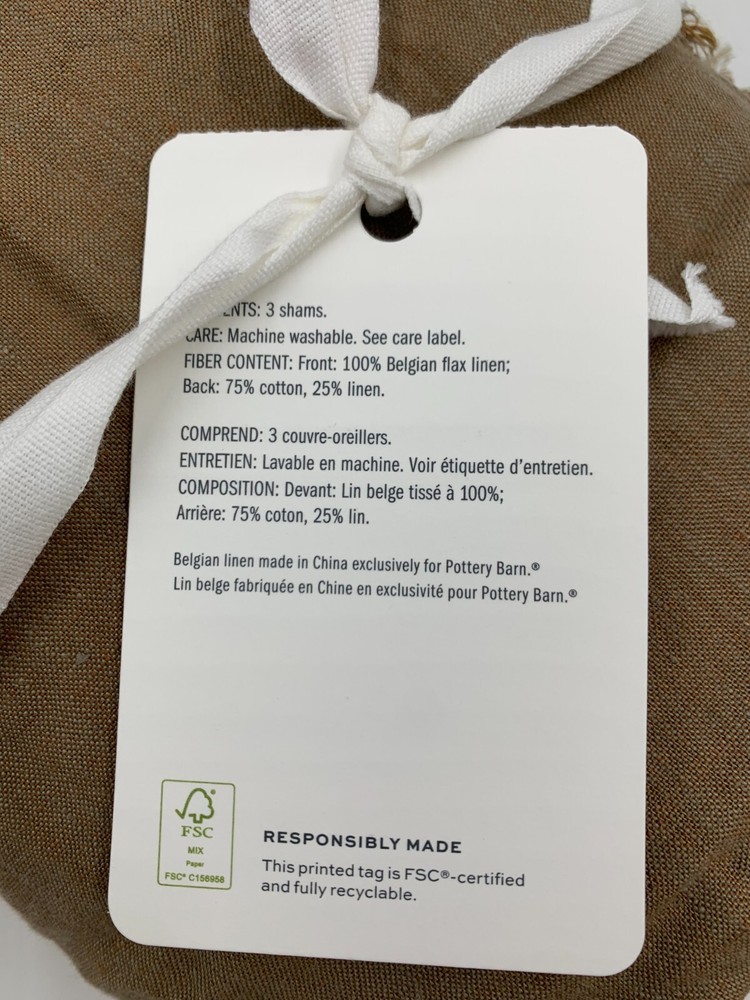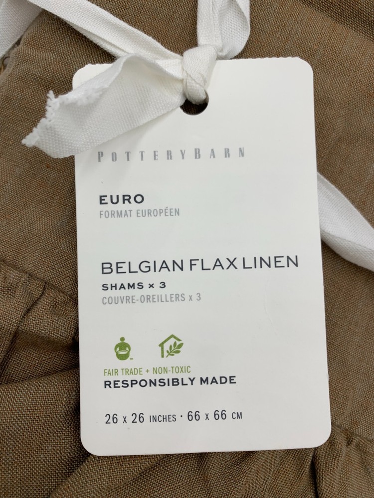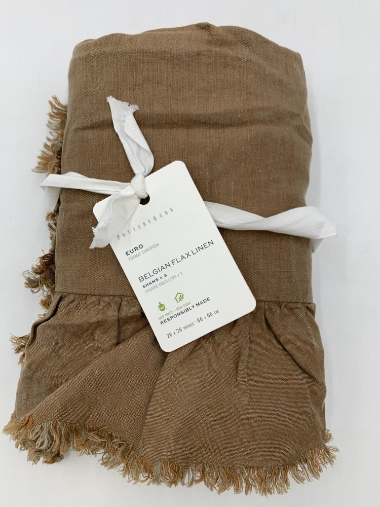 Pottery Barn Belgian Flax Linen Raw Edge Fringe Ruffle Sham Item is brand new Auction includes: 1 sham PRODUCT DETAILS CONSTRUCTION: Linen woven from 100% Belgian flax; reverse is 75% cotton and 25% linen blend. Breathable Belgian flax linen is ideal for warm or cool temperatures, and its durability lets you love it for years. Prewashed for a super soft hand feel. Designed with romantic ruffle edges. OEKO-TEX® STANDARD 100: tested for 1000+ harmful substances. 14.HUS.42449 HOHENSTEIN HTTI. Made in a Fair Trade Certified™ factory, empowering workers who made it. Shams and inserts are sold separately. Imported. CARE: Linen will get softer with every wash. Machine wash in cold water separately on gentle cycle. Use only non-chlorine bleach, if needed. Line or tumble dry on a low temperature. Warm iron as needed. DIMENSIONS Standard Sham: 20" h x 26" w Euro Sham : 26" sq King Sham: 20" h x 36" w Flange: 2"