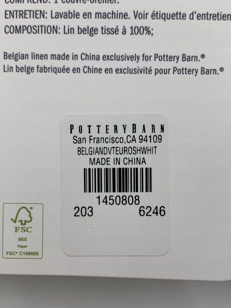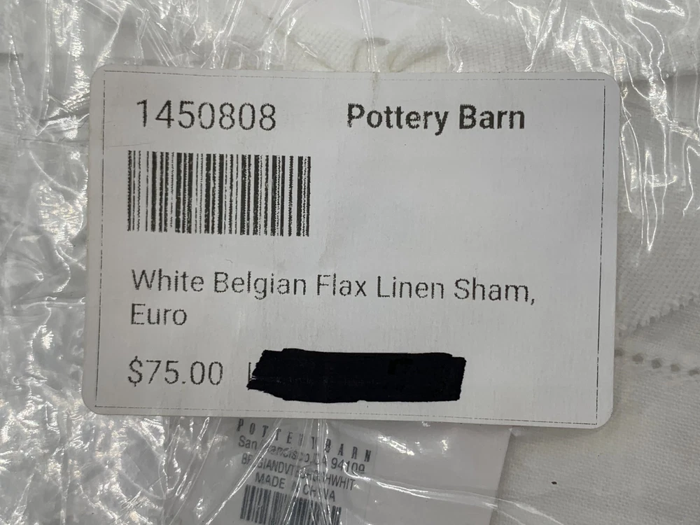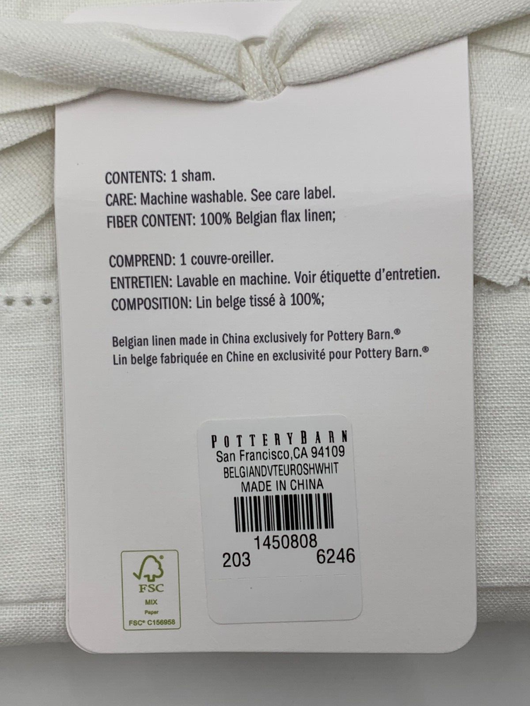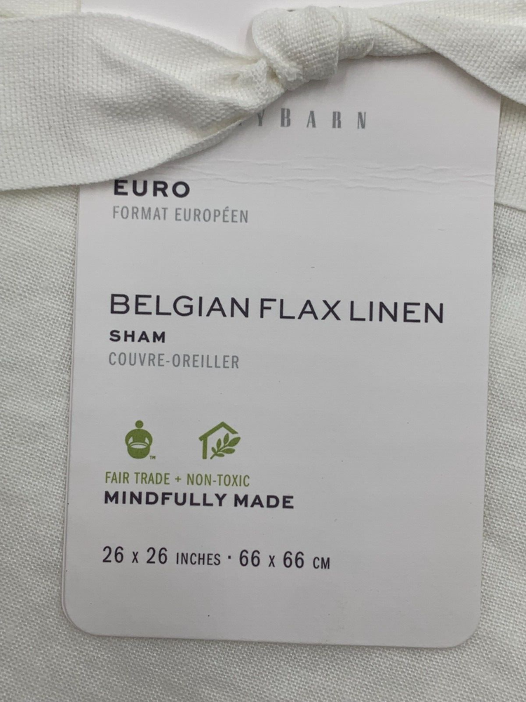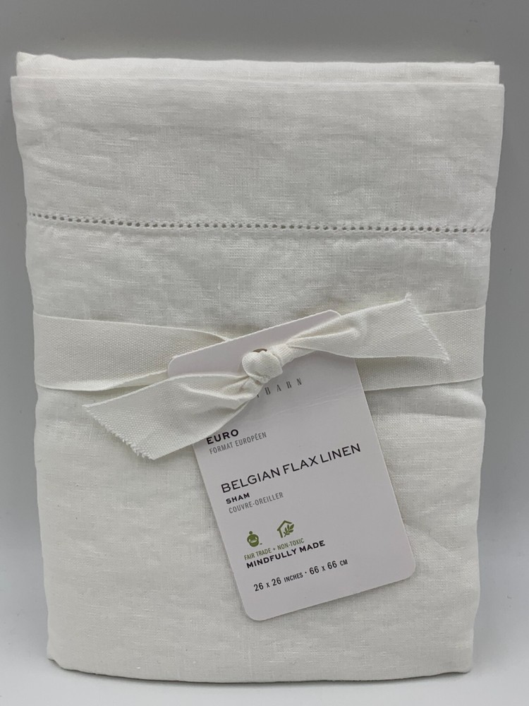 Pottery Barn Belgian Flax Linen Sham Euro White #H204 Item is brand new! Auction includes: 1 Euro sham. DETAILS: Linen woven from 100% Belgian flax. Breathable Belgian flax linen is ideal for warm or cool temperatures, and its durability lets you love it for years. Soft and cool to the touch. Microscopic breaks in the fabric provide a light massaging effect, and high absorbency meaning they'll always feel fresh and cool. STANDARD 100 by OEKO-TEX® certified. Tested in an independent lab and verified to be safe from over 350 harmful substances. Fair Trade Certified™ Sham features an envelope closure. Pre-washed for a super soft hand feel. Machine wash. Imported. DIMENSIONS Sham Euro: 26" sq Flange: 2" wide CARE AND MAINTENANCE Linen will get softer with every wash. Machine wash in cold water separately on gentle cycle. Use only non-chlorine bleach, if needed. Line or tumble dry on a low temperature. Warm iron as needed.