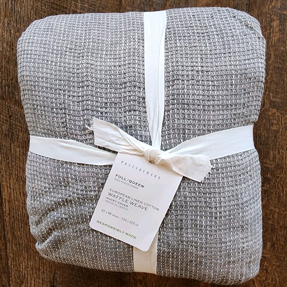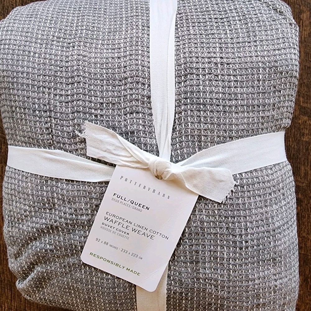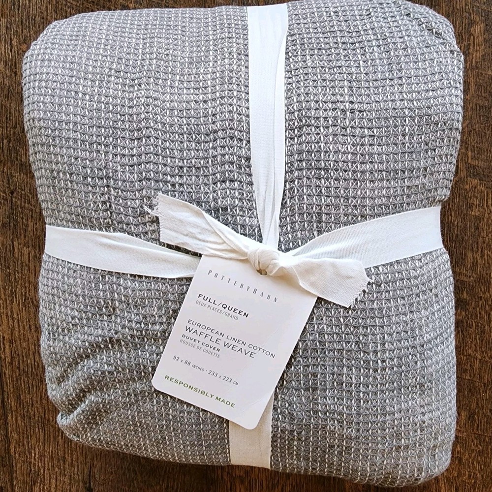 Pottery Barn Belgian Flax Linen Waffle Weave full queen Duvet Cover Light Gray Front is woven from 100% European Flax Linen; reverse is 100% cotton. Breathable European flax linen is ideal for warm or cool temperatures and its durability lets you love it for years. Designed with a waffle texture. Soft and cool to the touch. OEKO-TEX® STANDARD 100: tested for 1000+ harmful substances. 14.HUS.42449 HOHENSTEIN HTTI. Made in a Fair Trade Certified™ factory, empowering workers who made it. Duvet features a hidden button closure with inner ties that keep insert in place; Duvet cover and insert sold separately. Imported.