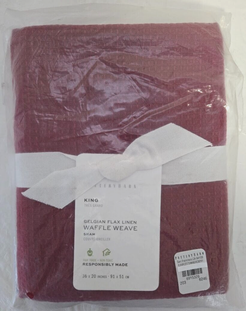 New With Tagged, as Shown on Photos. Elevate the style of your bedroom with this Pottery Barn Belgian Flax Linen Waffle Weave Pillow Sham. The Red Berry color and waffle weave pattern add a modern touch to your space. The sham is made of 75% cotton and 25% linen, making it both comfortable and durable. This king-sized sham measures 36 inches in width and 20 inches in length. Features a no-closure design for easy installation. Machine washable for easy care, this sham is perfect for both teens and adults. Add this one piece to your collection of Pottery Barn Belgian Flax Linen Waffle Weave Bedding and enjoy the luxurious feel it brings to your bedroom.