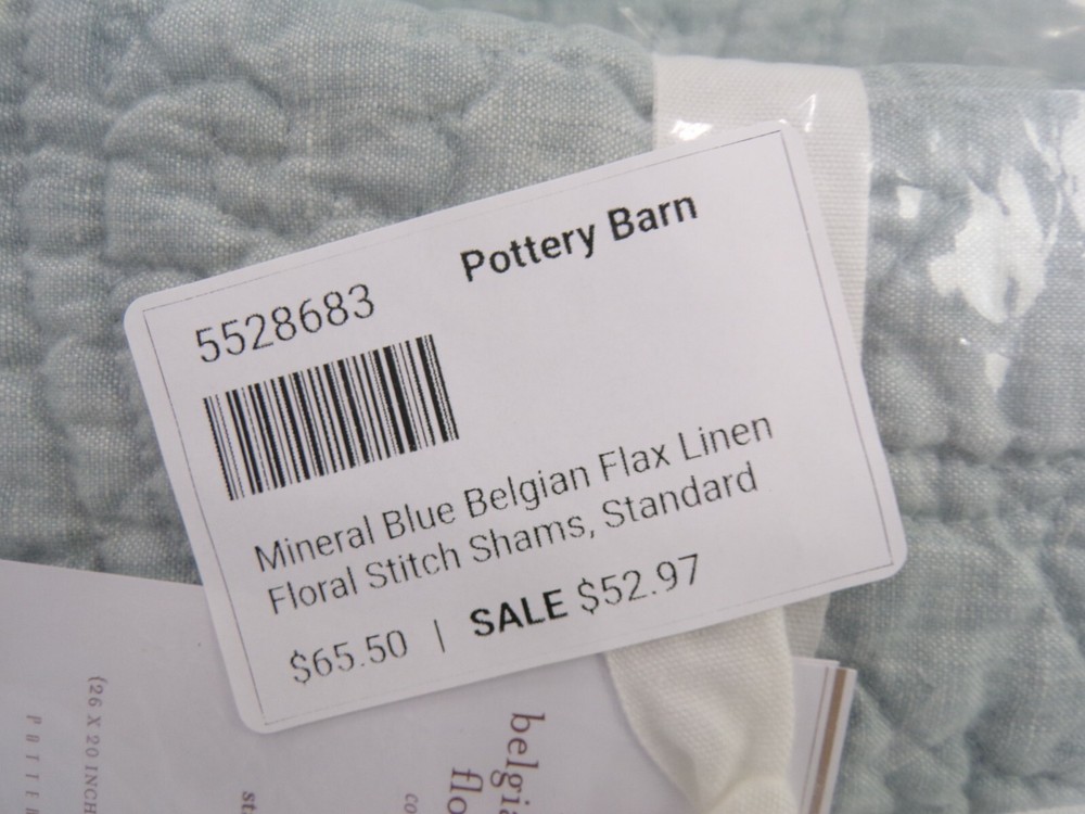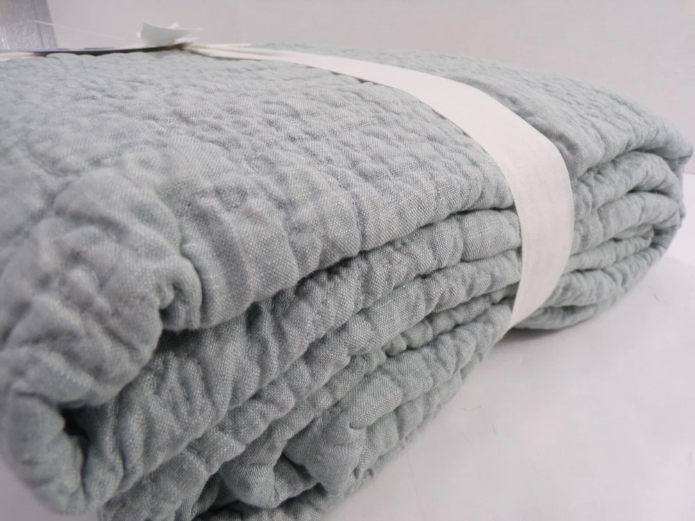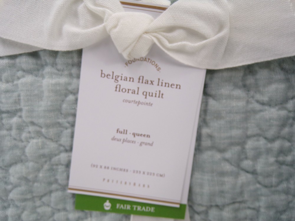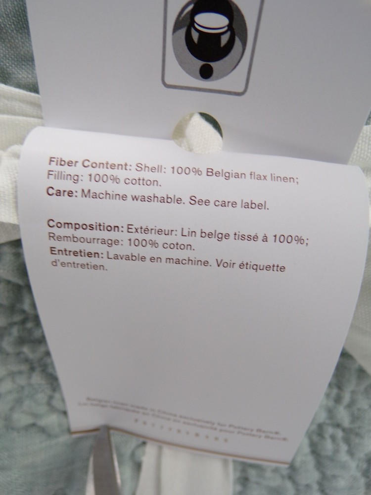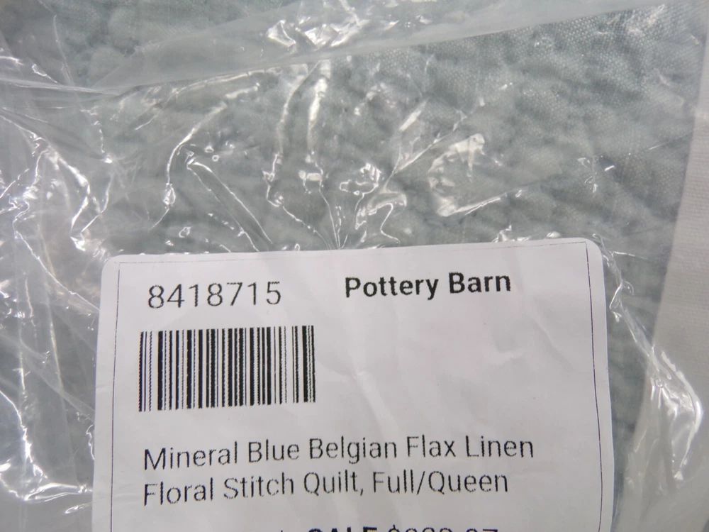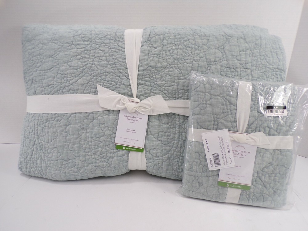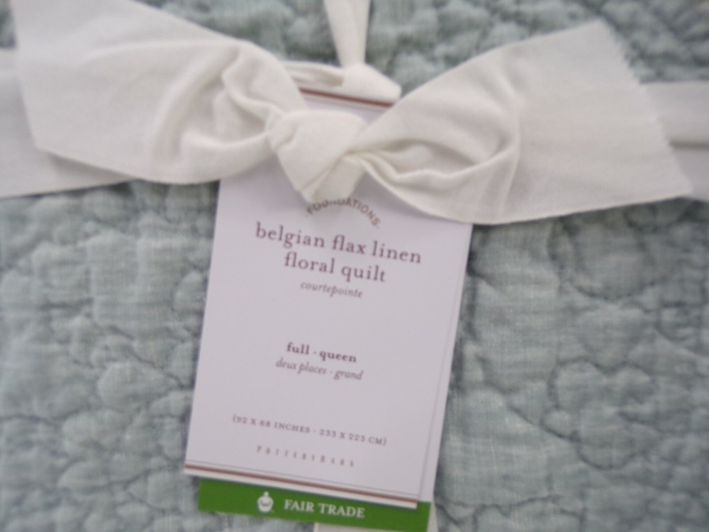 Pottery Barn Belgian Flax Linen Floral Stitch Quilt Queen Mineral Blue w/ 1 Std Sham #306 Item is brand new! Auction includes: 1 Full/Queen Duvet Cover and 1 Standard Sham Linen woven from 100% Belgian flax. Prewashed for a supersoft hand feel. Features intricately stitched designs of florals and vines. Ideal for warm or cool temperatures. Fair Trade Certified™. STANDARD 100 by OEKO-TEX® certified. Tested in an independent lab and verified to be safe from over 350 harmful substances. 250 gsm; 100% cotton fill. Quilted sham features an envelope closure. Machine wash. Imported. DIMENSIONS Quilt Full/Queen: 88" long x 92" wide Sham Standard: 20" high x 26" wide CARE AND MAINTENANCE Linen will get softer with every wash. Machine wash in cold water separately on gentle cycle. Use only non-chlorine bleach, if needed. Line or tumble dry on a low temperature.