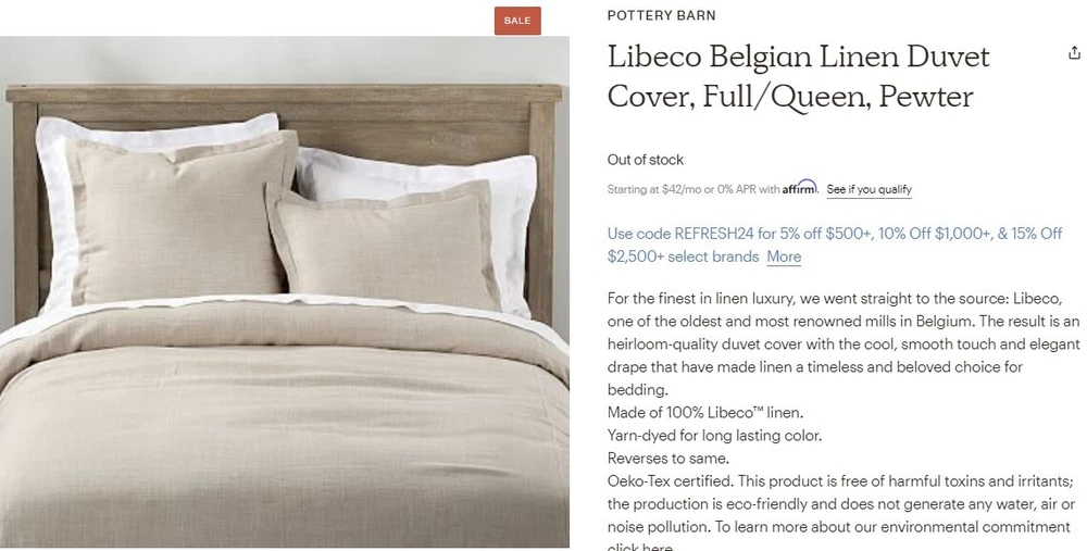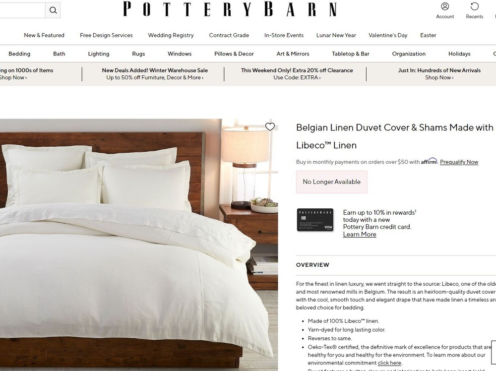 Pottery Barn Belgian Linen Duvet Cover Made with Libeco™ Linen, Full/Queen, New Original price $499. For the finest in linen luxury, we went straight to the source: Libeco, one of the oldest and most renowned mills in Belgium. The result is an heirloom-quality duvet cover with the cool, smooth touch and elegant drape that have made linen a timeless and beloved choice for bedding. Made of 100% Libeco™ linen. Yarn-dyed for long lasting color. Reverses to same. Oeko-Tex® certified, the definitive mark of excellence for products that are healthy for you and healthy for the environment. To learn more about our environmental commitment click here . Duvet features a button closure and interior ties to help keep insert (sold separately) in place. Duvet, sham and insert sold separately. Machine wash. Imported. Oeko Tex® is safe from 400+ harmful substances. DIMENSIONS Duvet Cover Full/Queen: 88" l x 92" w CARE AND MAINTENANCE Machine wash in cold water; gentle cycle. Only non-chlorine bleach when needed. Tumble dry on low heat; remove promptly. Warm iron as needed. AboutLibeco Libecois the premier destination for the highest quality Belgian Linen,upholstery, decor, and home accessories. Libeco started in 1858 as atrading house in Kortrijk, Belgium, then later established a weavingmill in Meulebeke. The linen mill’s specialization on a single rawmaterial – flax – has made the company one of the largest inEurope and most internationally renowned. Artisans in this regionhave worked with flax for centuries, with skills that have beenpassed down between generations. From the lush Belgian fields to thesustainable manufacturing of the fabrics, the making of Libeco linenis about sustainability, passion, and craftsmanship. Libecocombines new technologies with artisanal skills to harvest the flaxand create unique fabrics with quality design. The best flax in theworld grows in “flax-territory”: Belgium, France, and theNetherlands. The lengthy production of Libeco’s flax is done withtop-notch care and includes a cycle of natural flax growth,processing, yarn-spinning, weaving, and extensive quality control.Libeco carries the Masters of Linen® quality label and is one of thesix weavers worldwide to carry the prestigious Belgian Linen™quality label. Whenit comes to sustainability, flax is one of the most sustainable rawmaterials in the world. The flax plant is fully rainwater sufficientduring growth and requires no traditional irrigation. Compared toother crops, fewer environmentally harmful products like pesticidesand fertilizers are used. It is a 100% natural and biodegradableproduct that will fully degrade in 6.5 months. Libeco is CO2 neutraland proudly follows a zero-waste policy, meaning every part of theplant is used or repurposed for other projects. Libeco’s dedicationto traditionally-woven fibers and sustainability creates strong fiberlinens renowned for their quality and high performance.