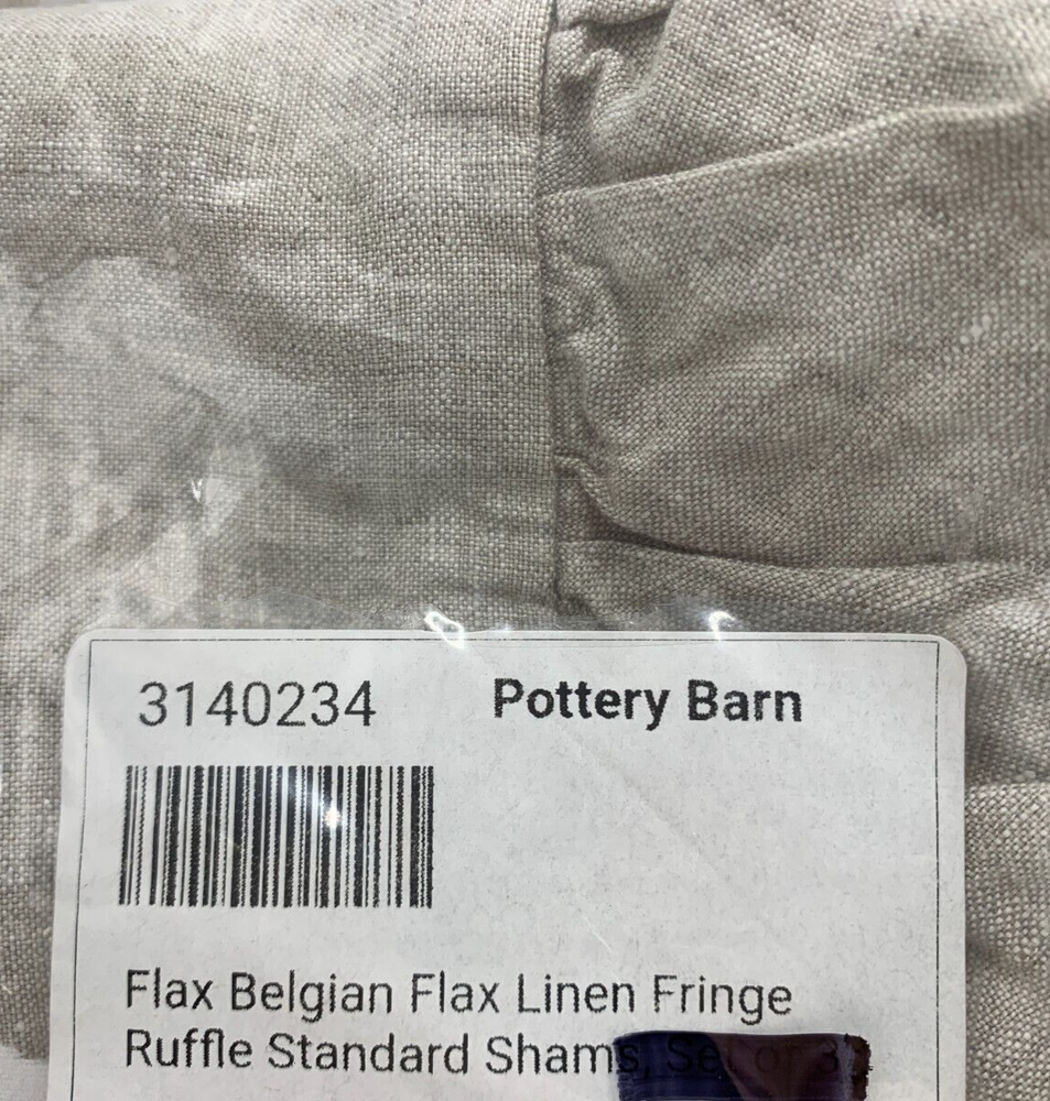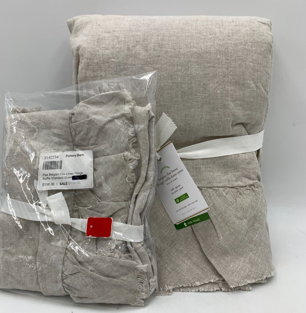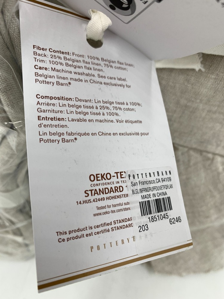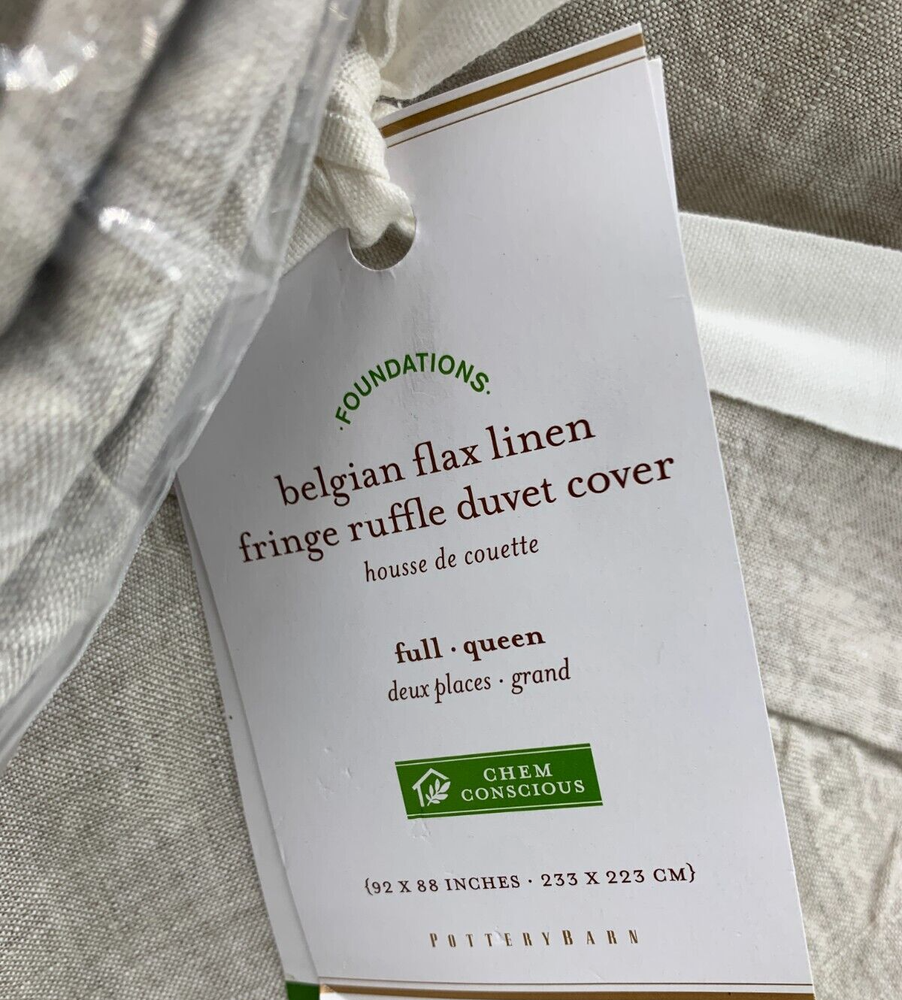 Pottery Barn Belgian Linen Fringe Ruffle Duvet Items are brand new Auction includes: 1 duvet and 1 sham PRODUCT DETAILS CONSTRUCTION: Linen woven from 100% Belgian flax; reverse is 55% linen and 45% cotton blend. OEKO-TEX® STANDARD 100: tested for 1000+ harmful substances. 14.HUS.42449 HOHENSTEIN HTTI. Imported. CARE: Machine wash in cold water separately on gentle cycle. Use only non-chlorine bleach, if needed. Line or tumble dry on a low temperature. Warm iron as needed. DIMENSIONS: Duvet Twin: 86" l x 68" w Full/Queen : 88" l x 92" w King/Cal. King: 92" l x 108" w Standard Shams : 20" w x 26" l King Shams: 20" w x 36" l Euro Shams: 26" sq