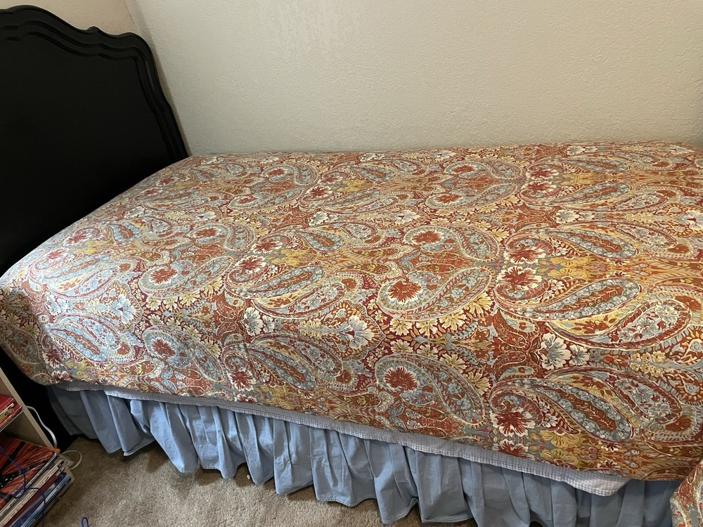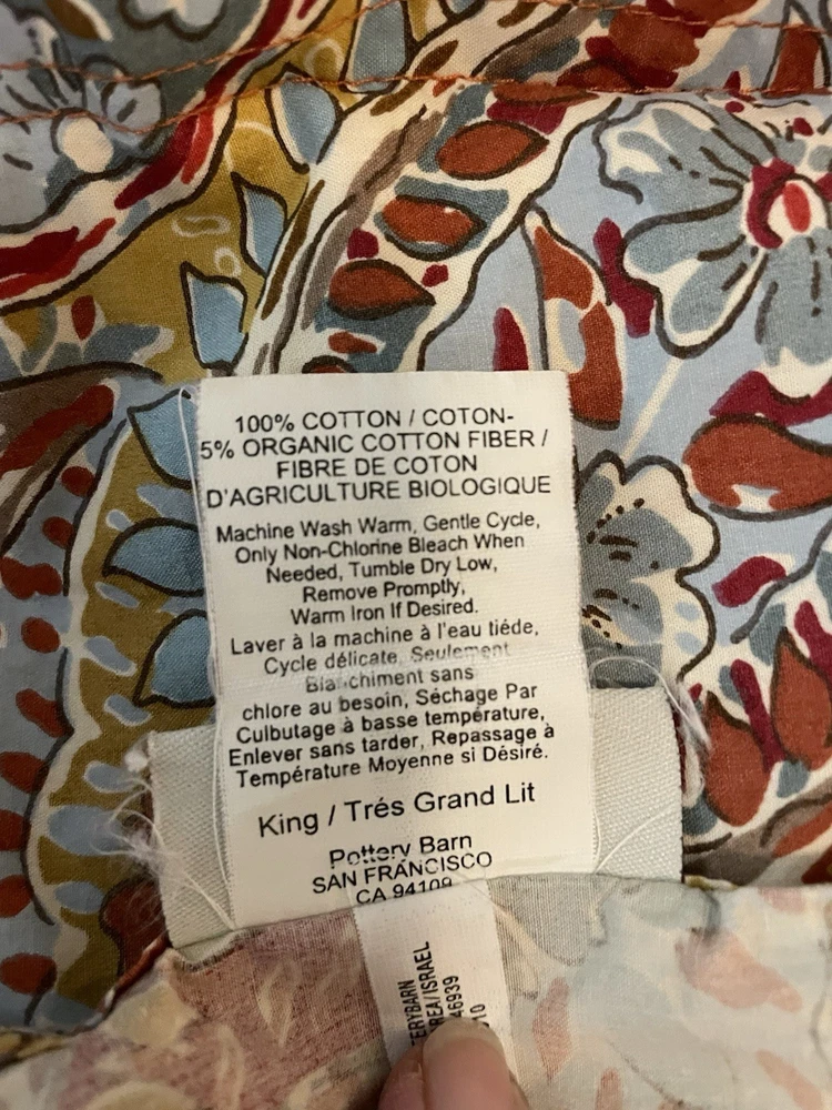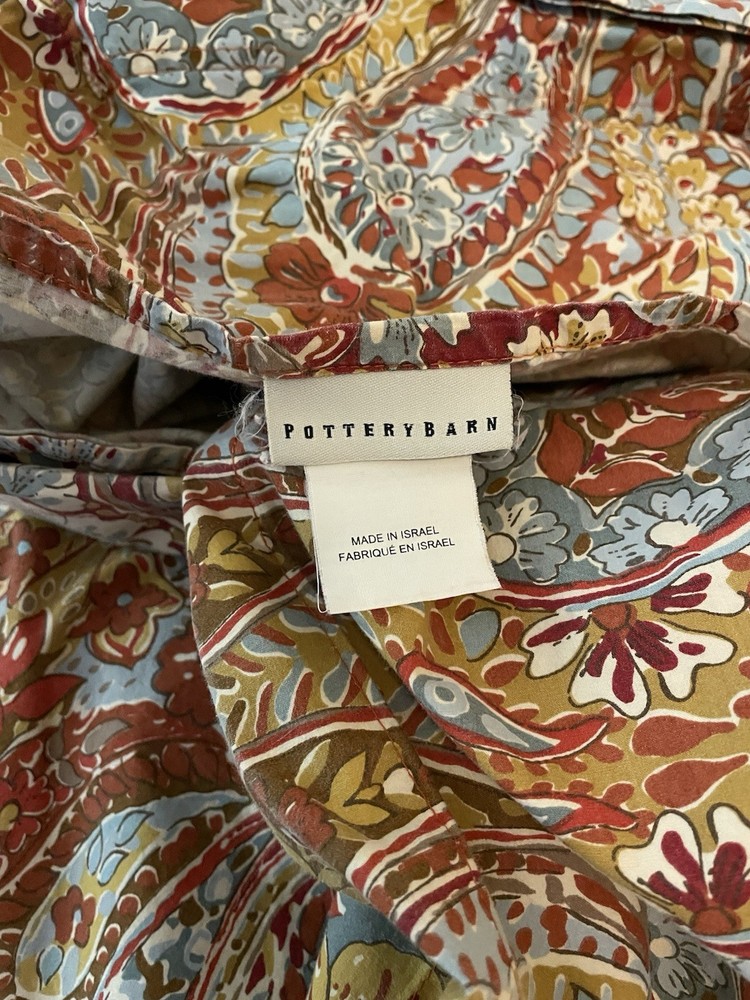 Beautiful multicolor Pottery Barn King Duvet Cover. Button closure. I’m including one standard pillow sham, for free (I only have one). This cover is pre-owned but I find no flaws. The pictures show it on a twin bet, just to give you an idea of how it looks on a bed, it is doubled up. It is KING size. Please see pictures and message me if you have any questions.