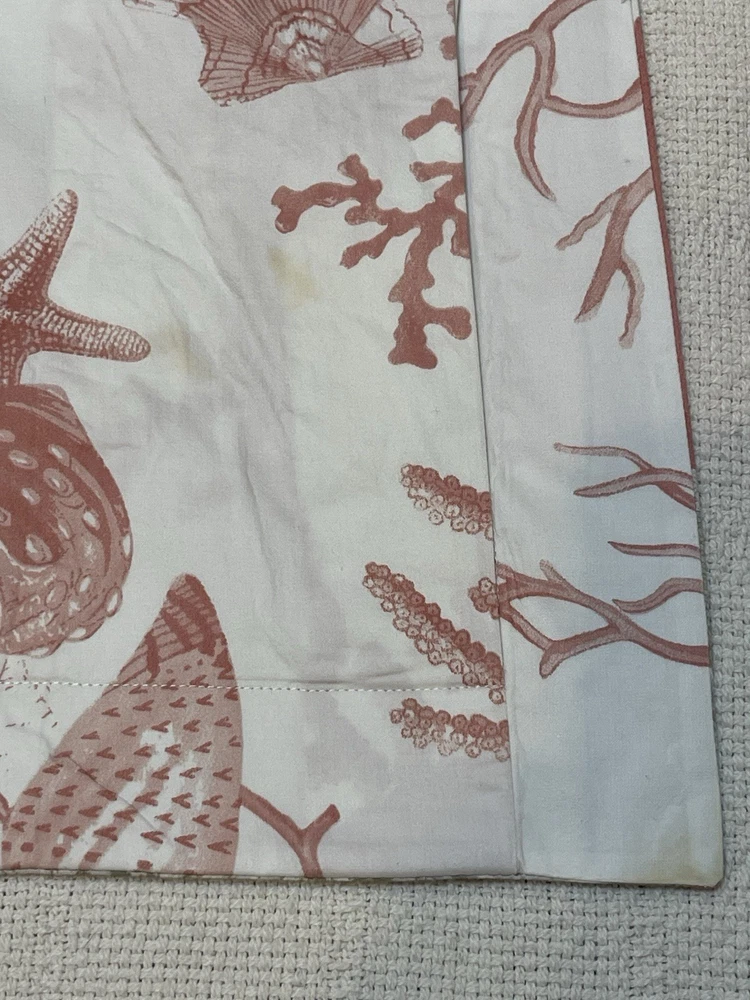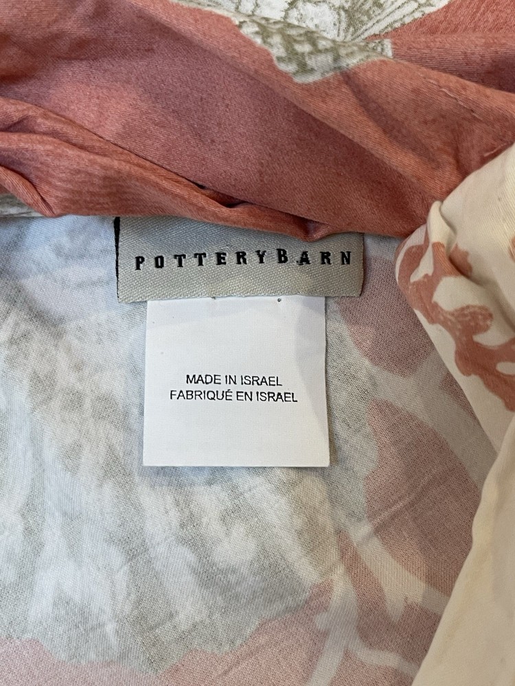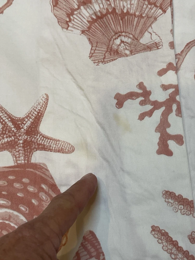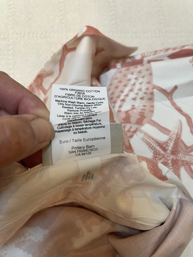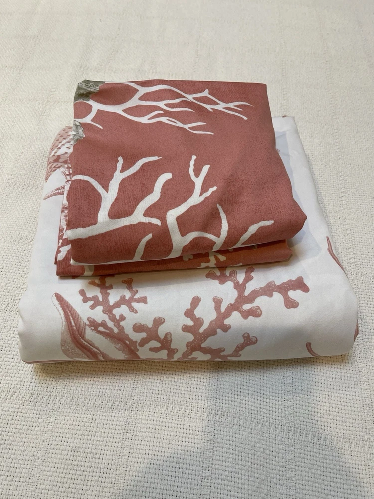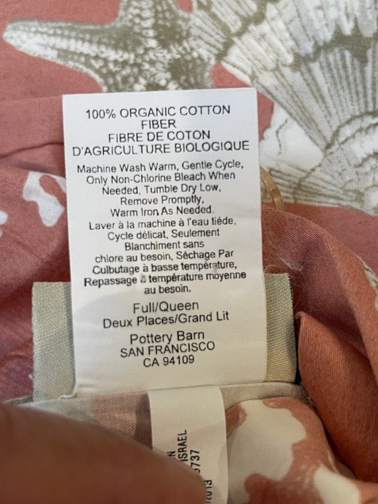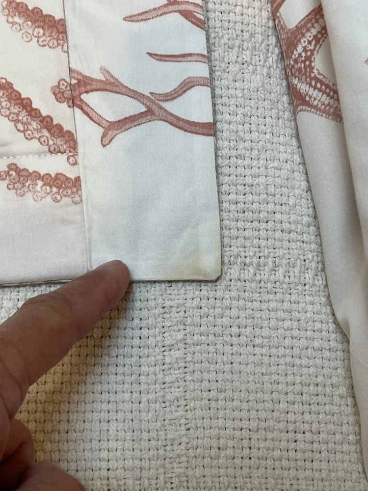 A beautiful duvet, cover, and ham set for sure! You can flip it over and have a reverse print showing with the white, see photos Duvet, cover and shams have been dry, cleaned, and were used for staging in a home ***** One sham does have a few spots on the white side Duvet cover and other sham have no issues