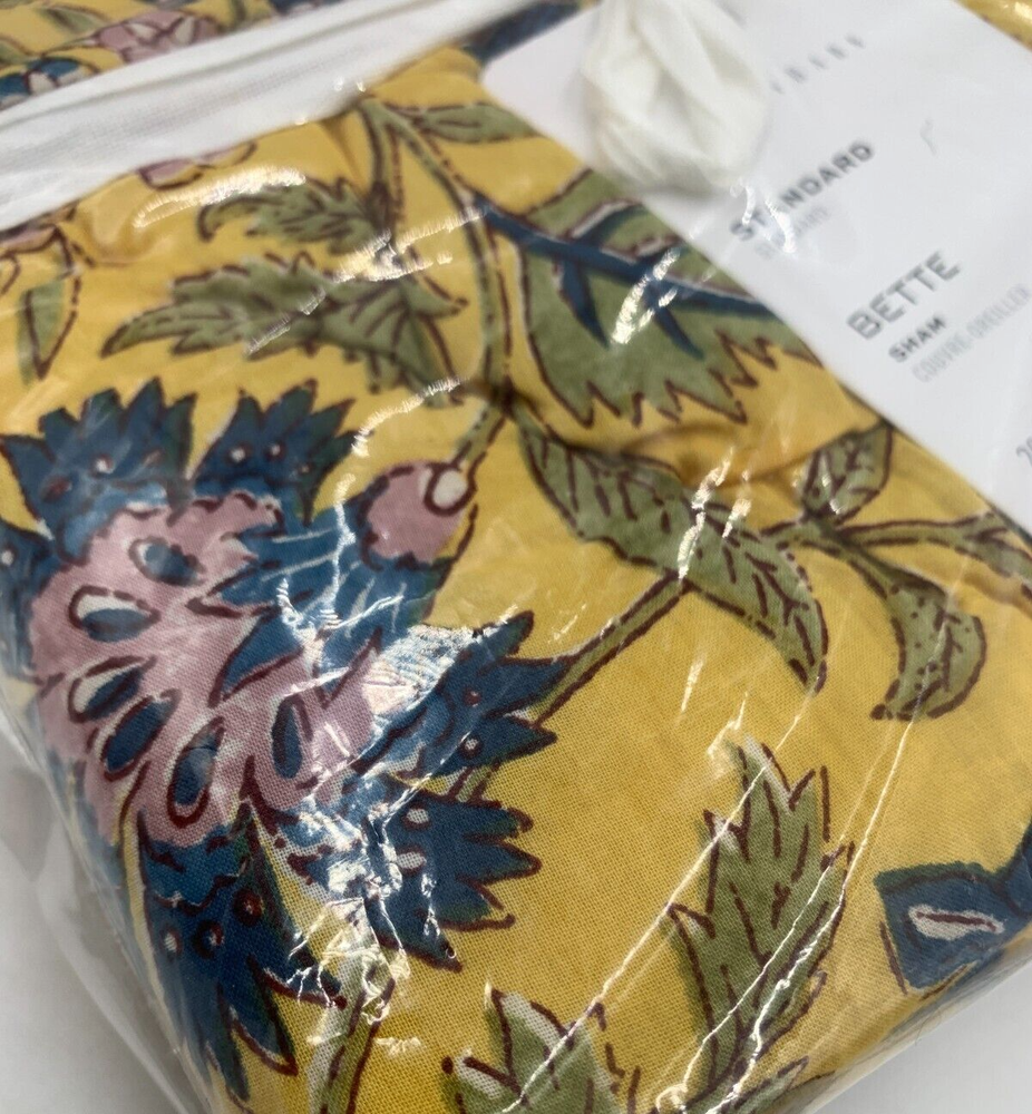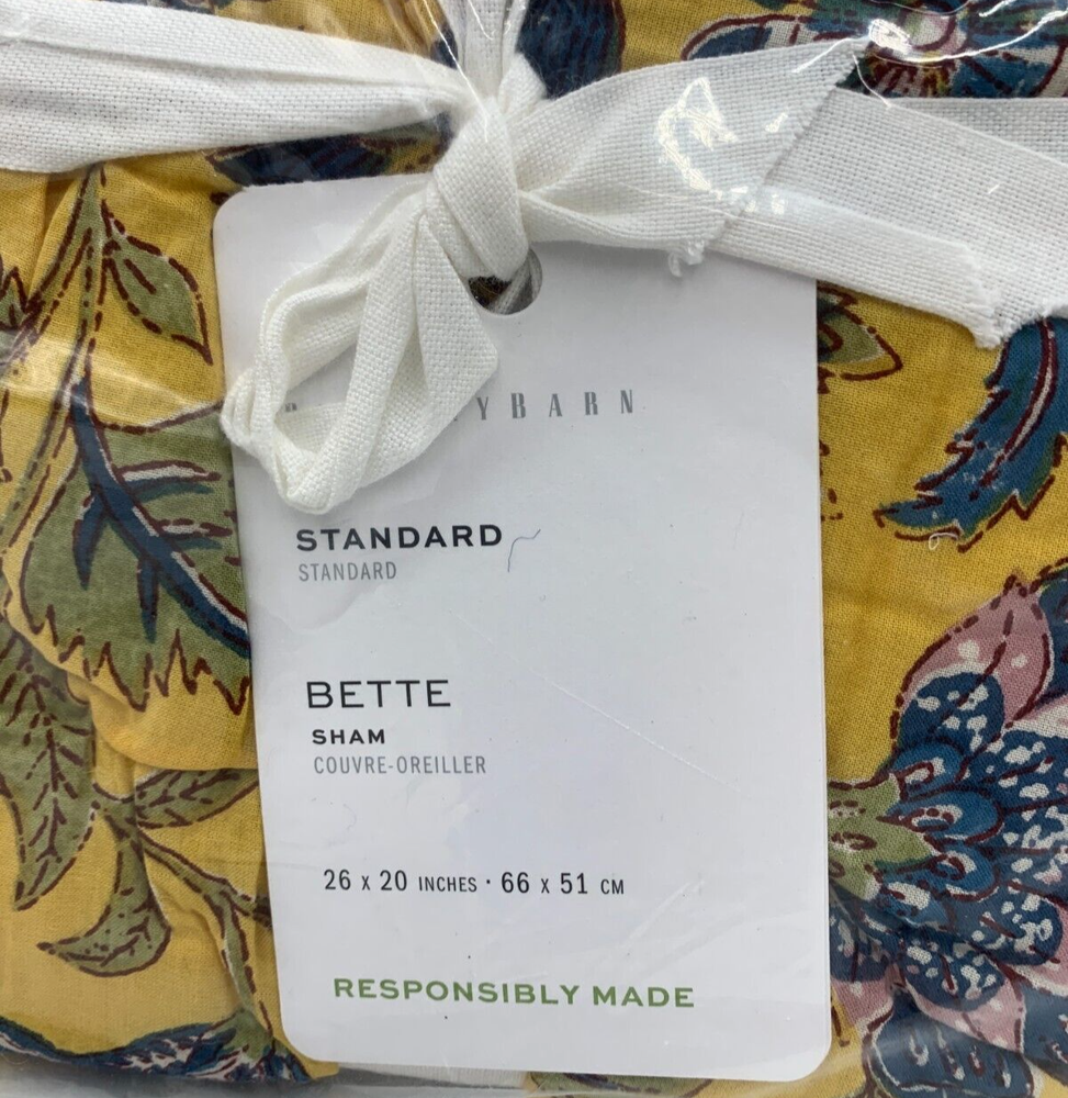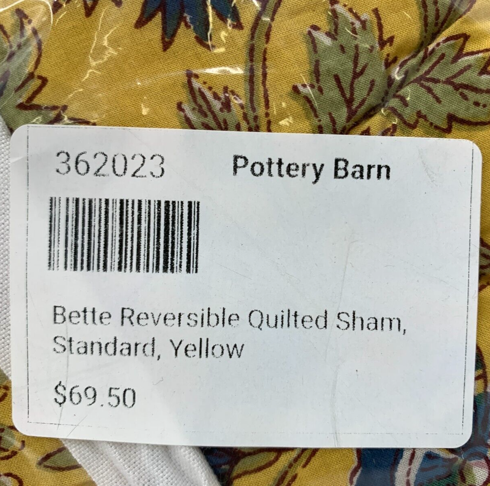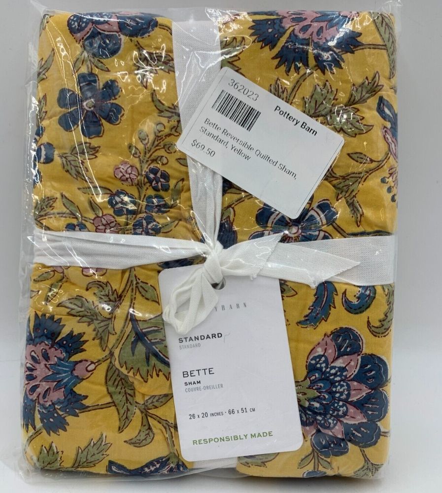 Pottery Barn Bette Reversible Quilted Cotton Sham Item is brand new Auction includes: 1 sham PRODUCT DETAILS CONSTRUCTION: Made from 100% cotton. Filled with 100% polyester batting. Reverses to 100% cotton. Reverses to coordinating pattern. Sham features a zipper closure. Ethically handcrafted to the Nest Standards for homes and small workshops. Shams sold individually. Quilt, shams and inserts are all sold separately. Imported. CARE: Machine wash in warm water; gentle cycle. Only non-chlorine bleach when needed. Tumble dry on low heat; remove promptly. Warm iron as needed. DIMENSIONS: Standard Shams : 20" w x 26" l King Shams: 20" w x 36" l Euro Shams: 26" sq