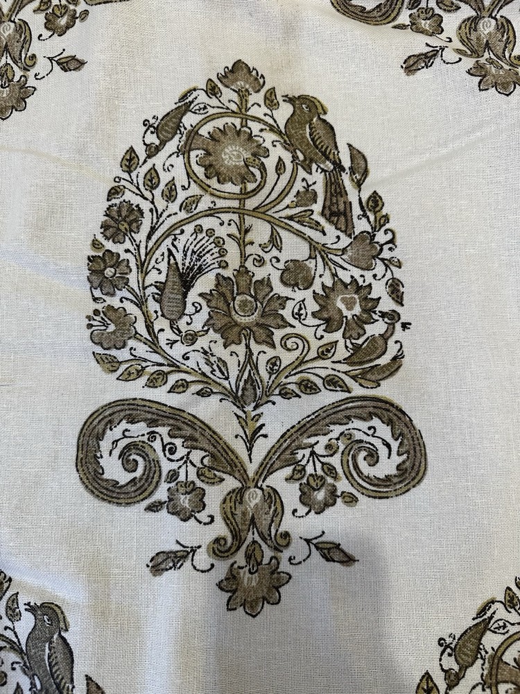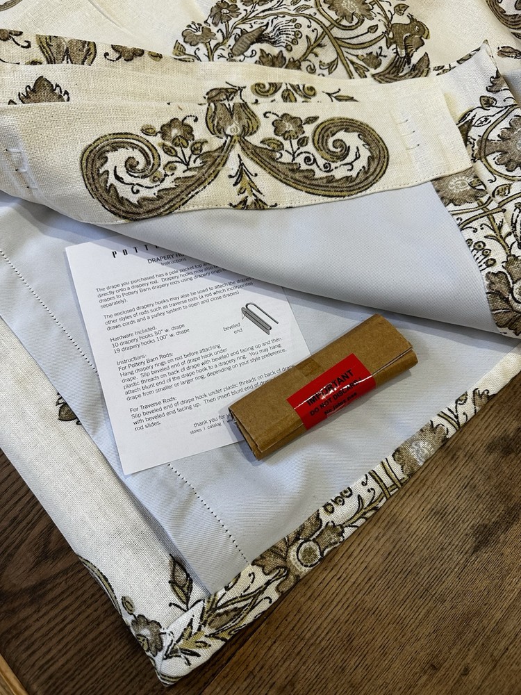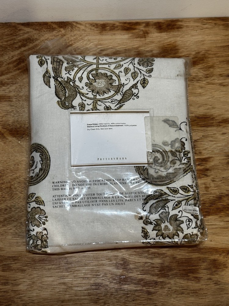 The Pottery Barn Bhota Drape is a rare find, discontinued for more than a decade. This curtain features a paisley pattern with floral and bird designs. With a neutral beige color scheme, this curtain is 50 inches wide and 84 inches long, making it suitable for a variety of window sizes. The intricate detailing and unique design of this curtain make it a stylish and eye-catching addition to any home decor. This is a pole top drape with a blackout lining As of the time of this listing, I have three panels total. This listing is for one panel. Two of the panels are still factory sealed, the third is still in the factory packaging and includes the original hardware, however it has been opened, re-folded and placed back in the original packaging.