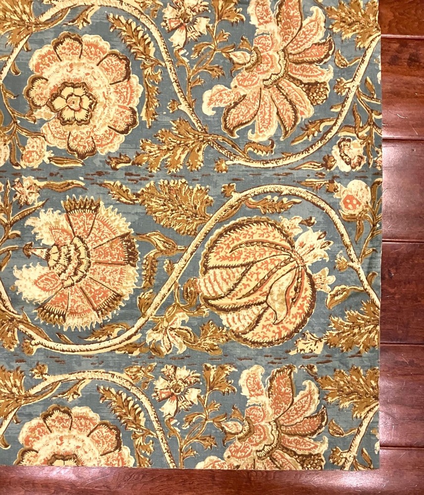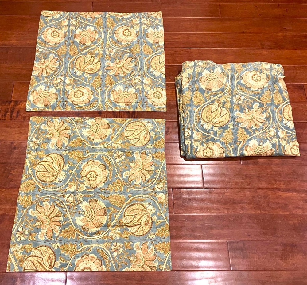 Enhance your bedroom with this Pottery Barn Palampore blue floral queen/full duvet cover and two euro shams set. The intricate floral pattern adds a touch of elegance, while the rich blue background creates a serene and inviting atmosphere. Carefully made in India of 100% cotton, the set features a button closure for easy removal and machine washability for effortless maintenance. The duvet cover set brings a coordinated look to your bedding ensemble, elevating your space with its timeless design and classic elegance. Each euro sham measures approximately 29 inches long and 28 inches wide and fits a 26 inch insert. The duvet cover and shams are in very good used condition with no rips, tears, or stains, and minimal signs of wear.