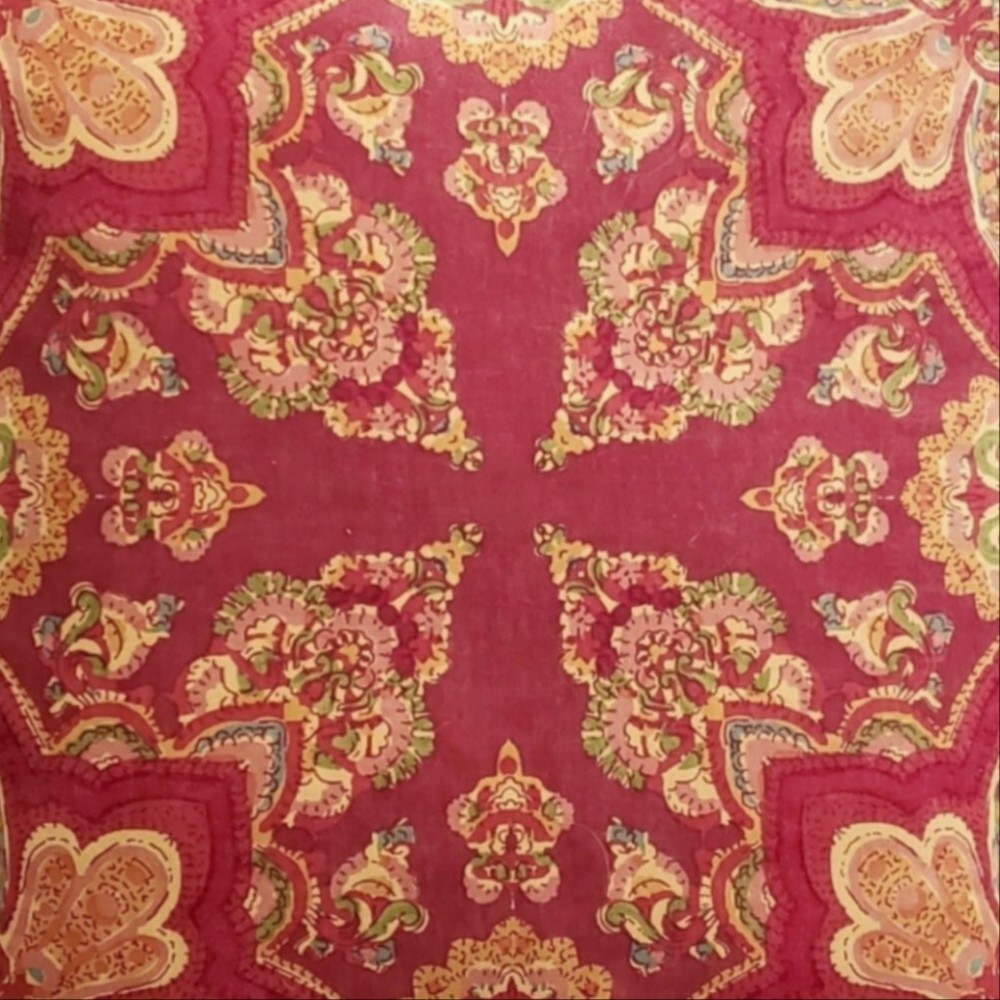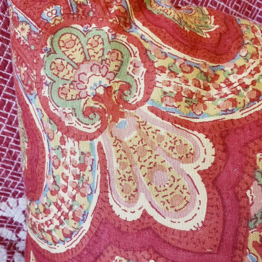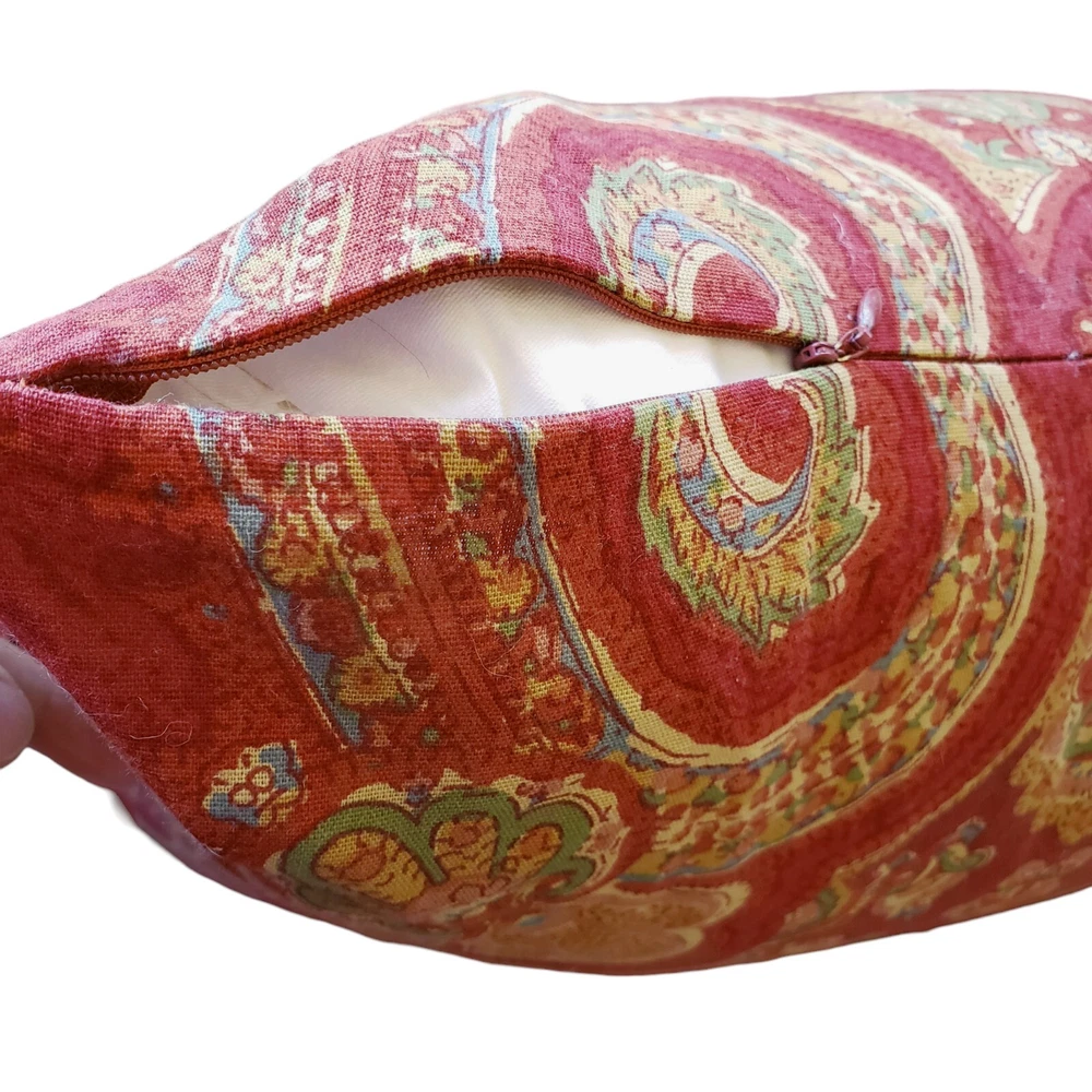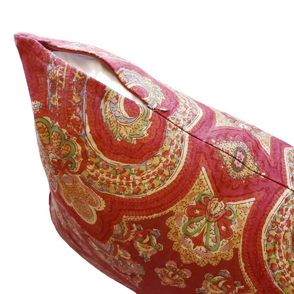 Large throw pillow in red and gold with an Indian design. 20 x 20 inches Zip opening. Cotton exterior. Feather and down filling. Excellent Pre-owned condition.
