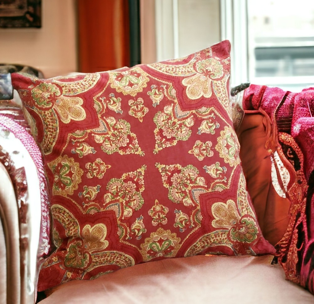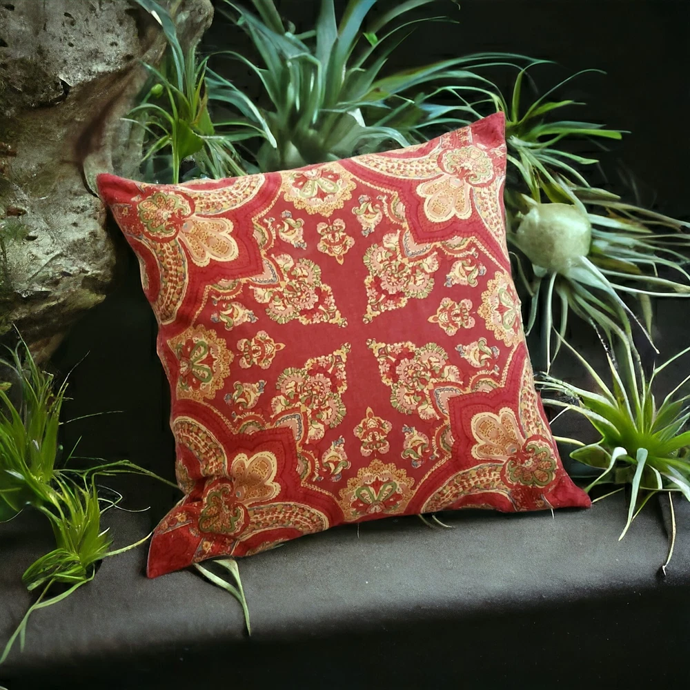 Large throw pillow in red and gold with an Indian design. 20 x 20 inches Zip opening. Cotton exterior. Feather and down filling. Excellent Pre-owned condition....