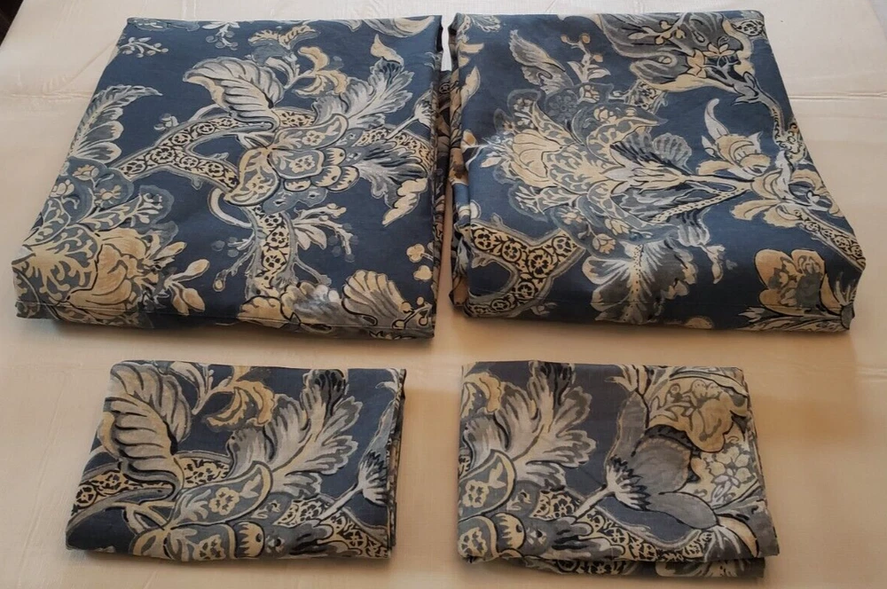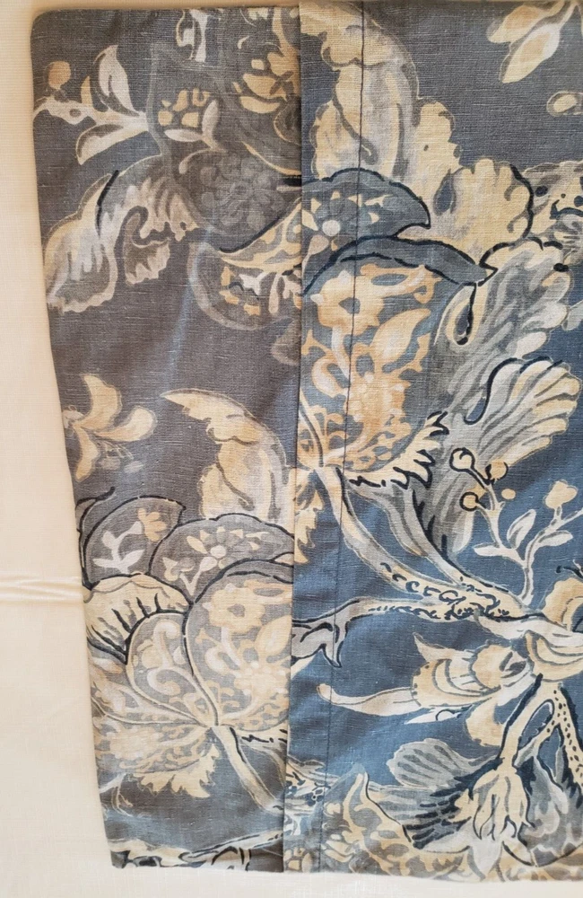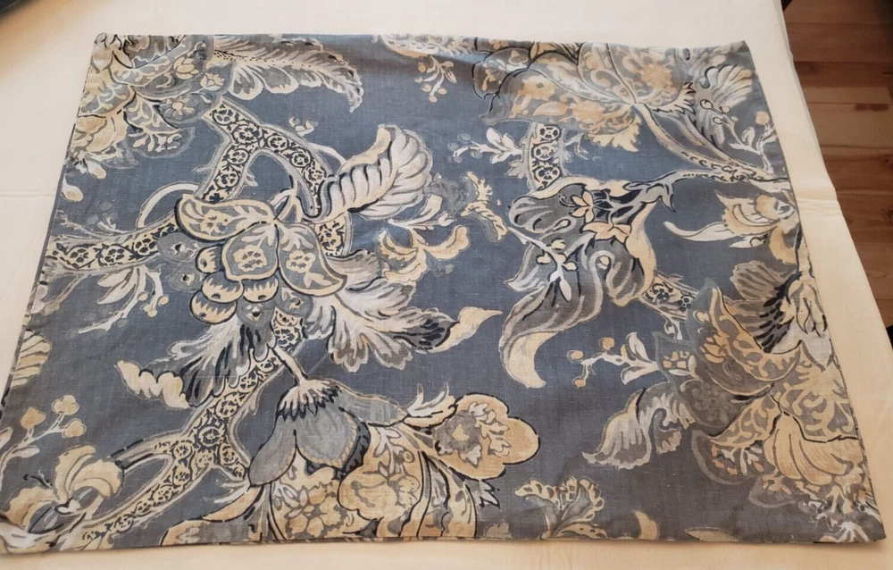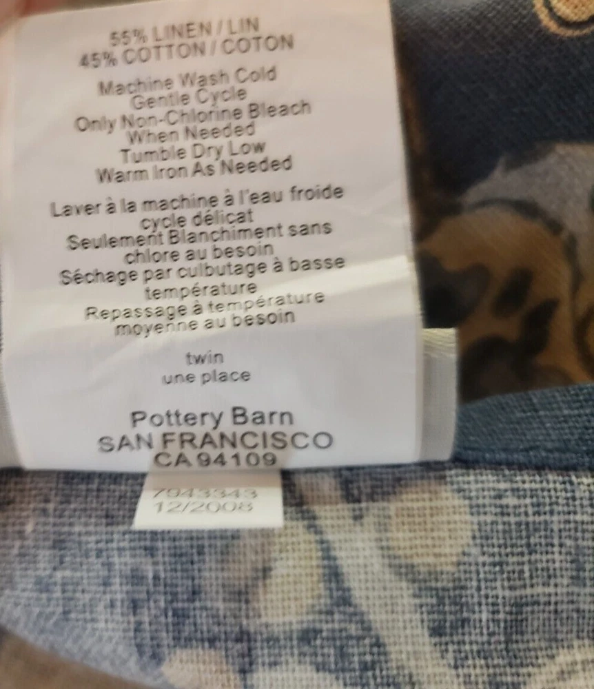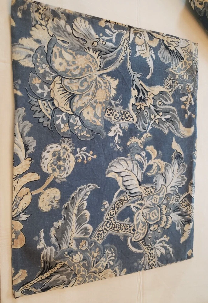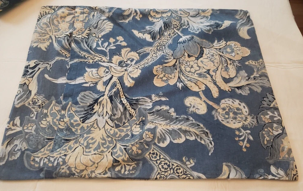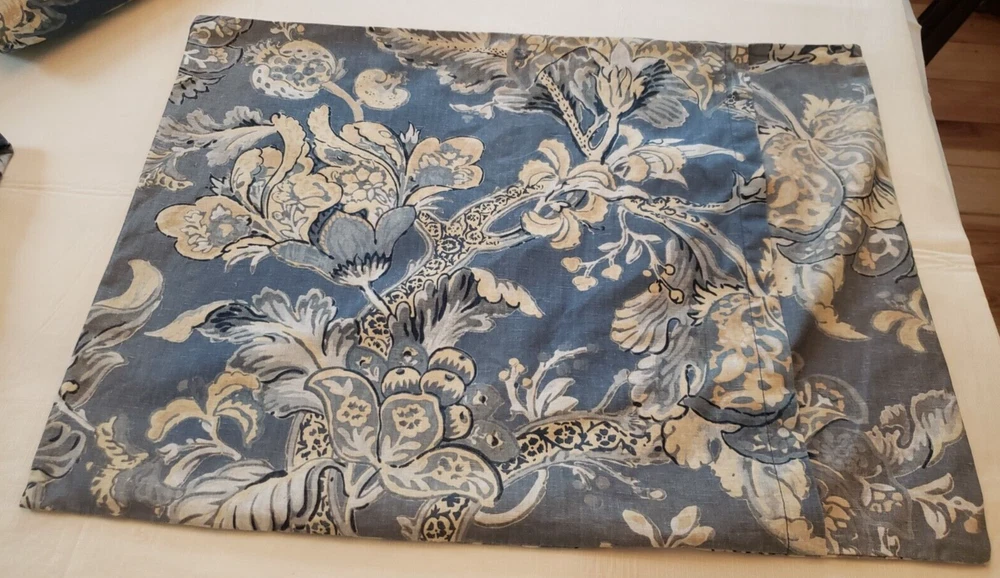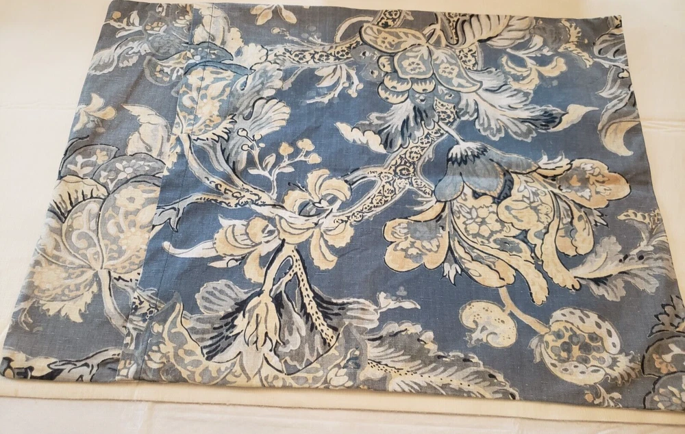 Lovely gently used Pottery Barn Bristol Palampore Jacobean TWIN Duvet Cover and Sham set. The duvet cover features a blue, yellow, tan and white floral pattern. Made of high-quality 45% cotton/55% linen blend. The duvet is reversible, with the same pattern on each side. Button closure. The duvet measures 87" long by 67" wide. The sham measures Wide 25" by 20" long. This is a 2008 pattern. Made in China. The shams have some fading due to sun exposure. One sham has minor fading on the back panel, the other sham has fading on the back panel and some fading on the front. Please see closeup photos. Two sets are available. No returns accepted Free shipping