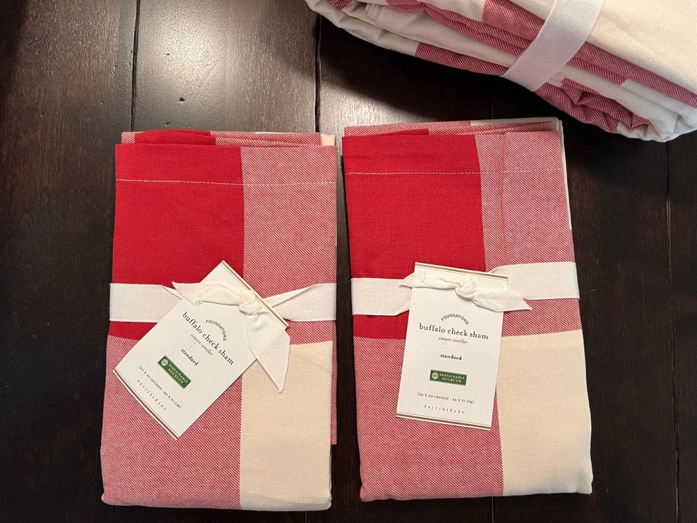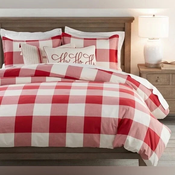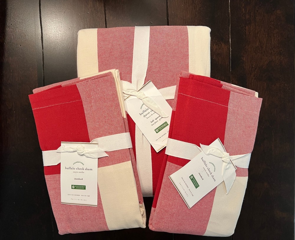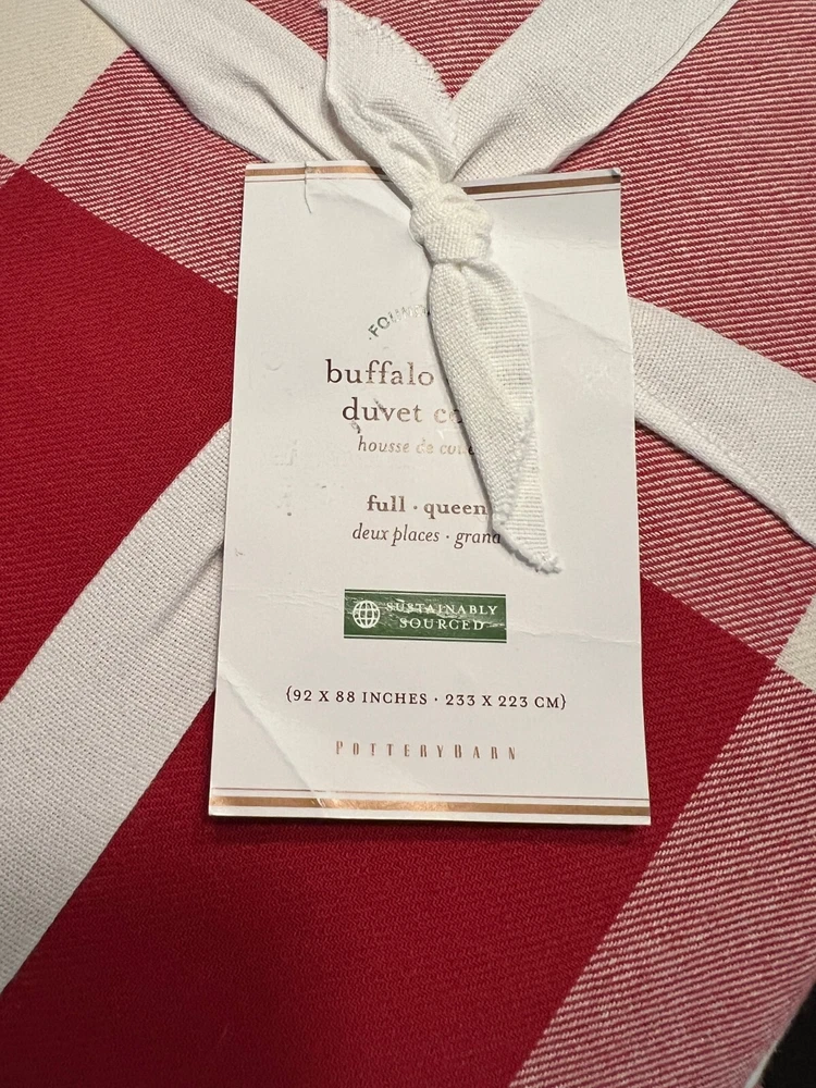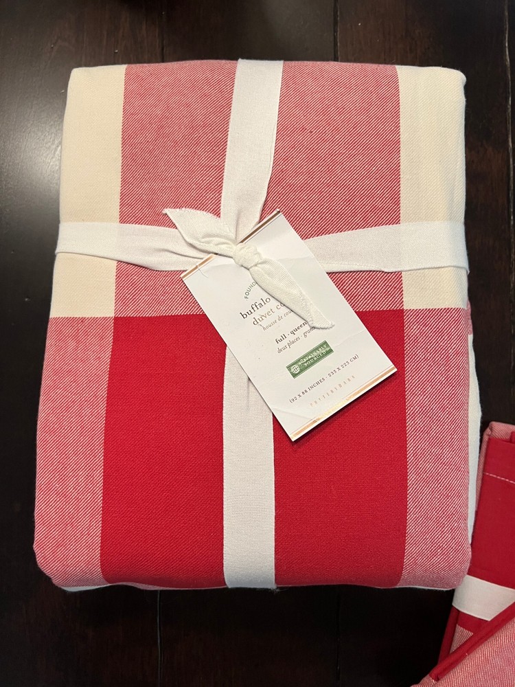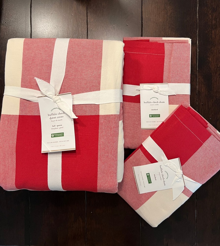 Pottery Barn Buffalo Check Duvet & Shams New with tags Set Includes: One Full Queen Duvet cover and two Standard Shams Color: Cherry Red and Ivory Please let me know if you have any questions. no returns. We took our inspiration from your coziest plaid shirt to design this inviting bedding. The bold punch of color makes a statement in your room Made of 100% cotton Duvet cover and sham reverse to self Duvet has a hidden button closure; sham has an envelope closure. Machine Wash tumble dry Full/Queen: 88" long x 92" wide Standard: 20" high x 26" wide