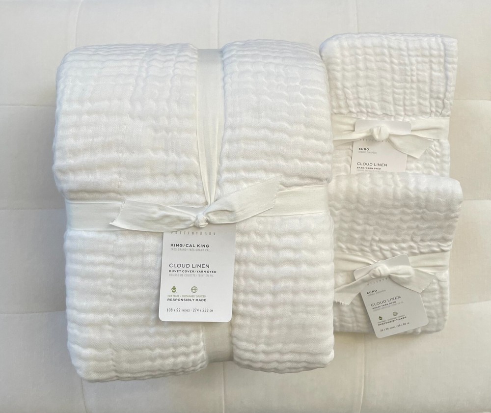 Pottery Barn CLOUD COTTON LINEN King/Cali King Duvet Cover & Two Euro Shams ~White~ New with Tags PB describes as: Supremely soft, our Cloud bedding is lightweight yet exceedingly cozy. The linen-cotton blend will make you feel like you’re floating on air — it’s perfect on its own year-round or layered underneath a quilt when the weather turns chilly. Front is 55% Linen and 45% Cotton. Reverse is 100% Cotton. Duvet features a hidden button closure with inner ties to keep insert in place. STANDARD 100 by OEKO-TEX® Certified: WSI Certificate #: 14.HUS.42449: tested for 400+ harmful substances to keep you and your family safe from chemicals common to textile manufacturing. By choosing our cotton products, you’re supporting our investment in Better Cotton’s mission. This product is sourced via mass balance and therefore may not contain Better Cotton. Imported. King/California King Duvet Cover: 92" l x 108" w Euro sham: 26" sq. Pet & Smoke free Ships within 1 business day Thank you!