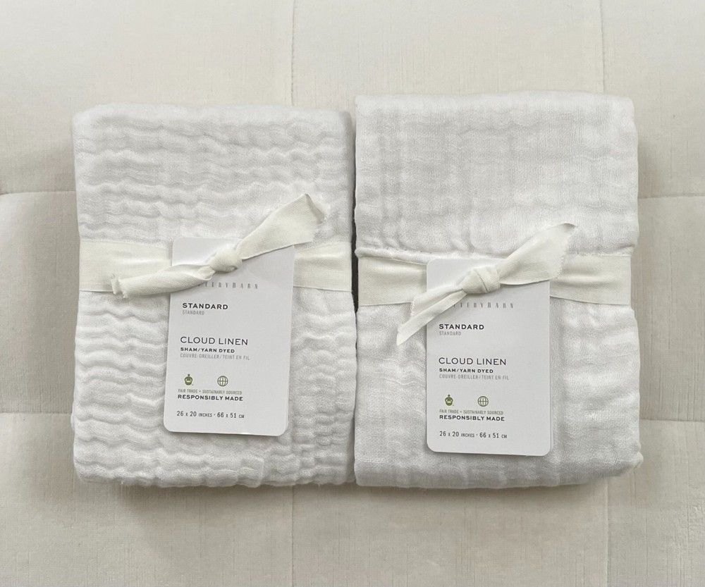 Pottery Barn CLOUD COTTON LINEN Standard Shams Set/2 ~White~ New with Tags PB describes as: Supremely soft, our Cloud bedding is lightweight yet exceedingly cozy. The linen-cotton blend will make you feel like you’re floating on air — it’s perfect on its own year-round or layered underneath a quilt when the weather turns chilly. Front is 55% Linen and 45% Cotton. Reverse is 100% Cotton. STANDARD 100 by OEKO-TEX® Certified: WSI Certificate #: 14.HUS.42449: tested for 400+ harmful substances to keep you and your family safe from chemicals common to textile manufacturing. Machine wash. Imported. Standard Sham: 20" h x 26" w Pet & Smoke free Ships within 1 business day Thank you!