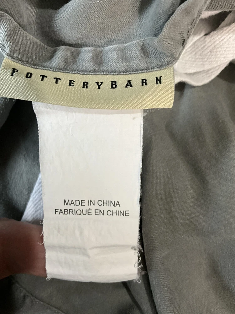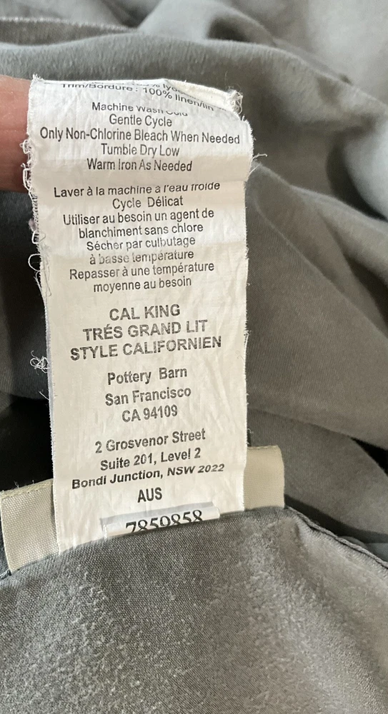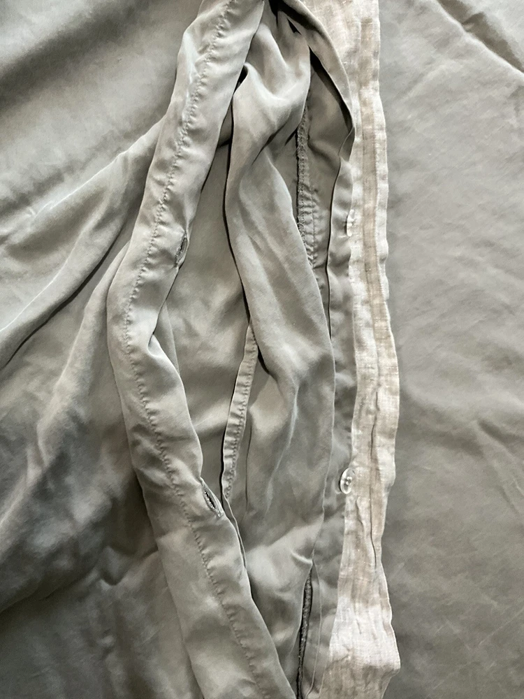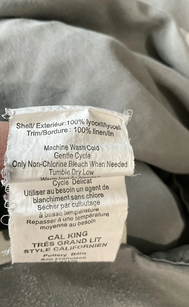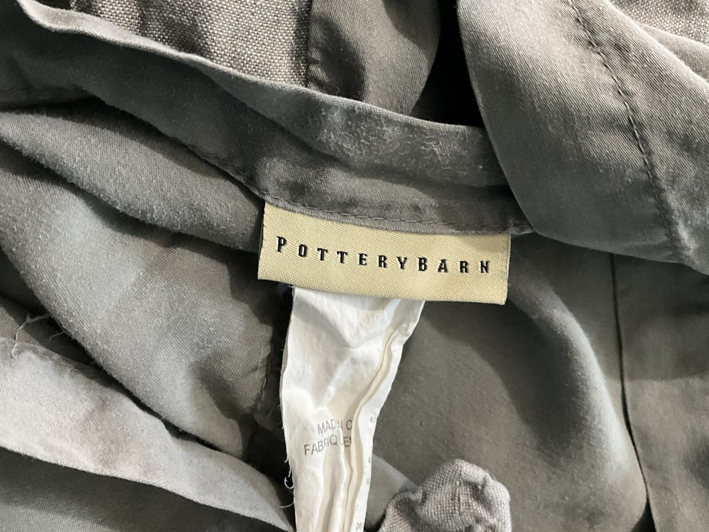 Pottery Barn California King Tencel Duvet Cover in Gray with Linen Border, part of the Casual TENCEL collection. This modern duvet cover set includes 2 standard pillowcases and features a solid color pattern. The set is machine washable, reversible, and has ties inside to secure the duvet. Made with TENCEL™ and linen border , it offers luxury and comfort for your bedroom decor.