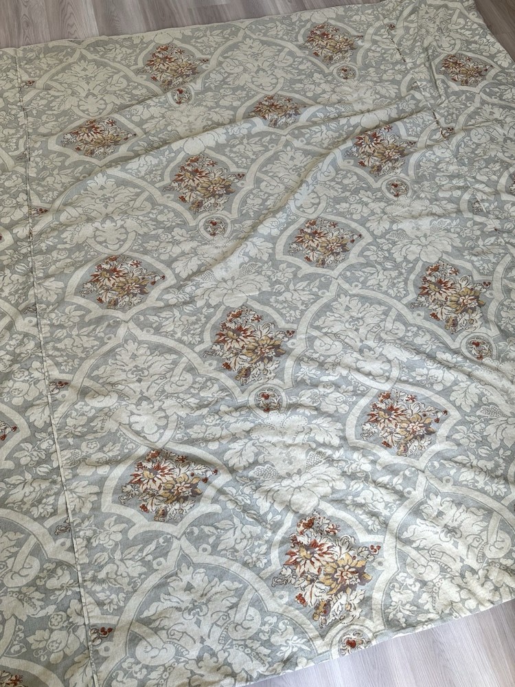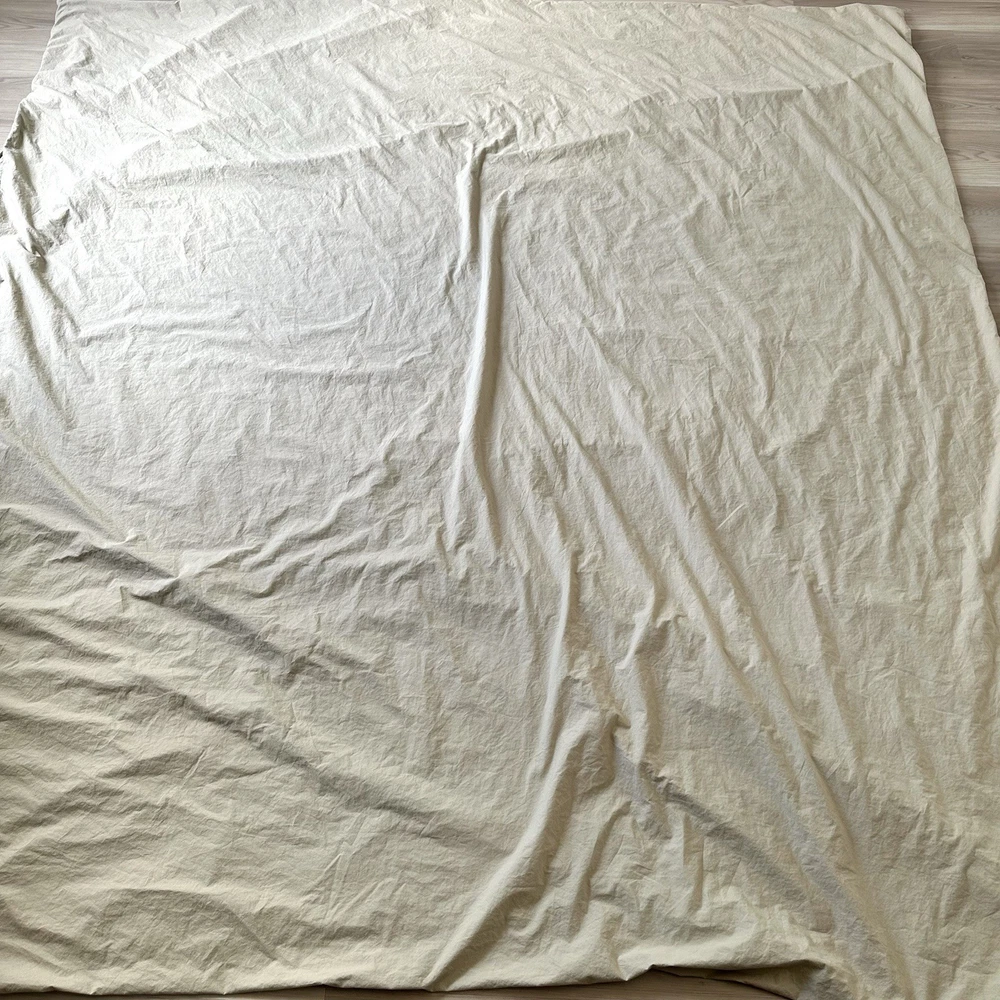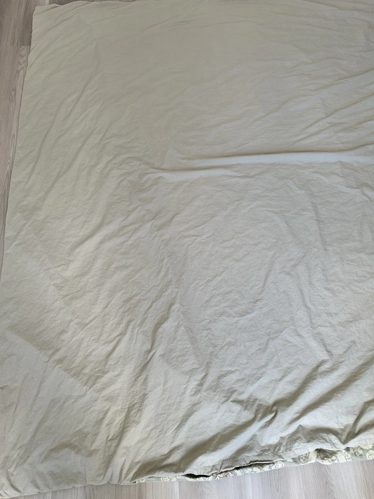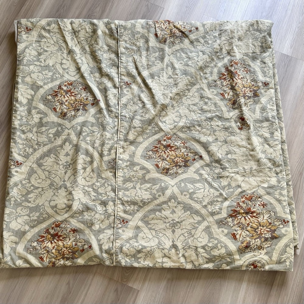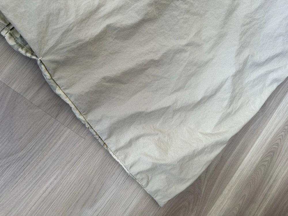 Queen Some faint light spots on solid side as shown A good amount lint/feathers from washing - especially inside Pilling on linen side as shown Sold as is Duvet cover only. Buttons closed...