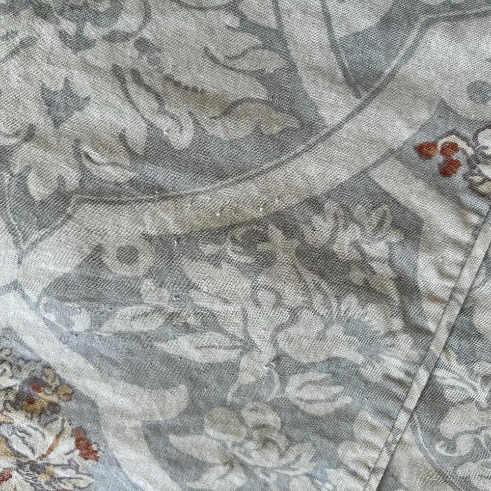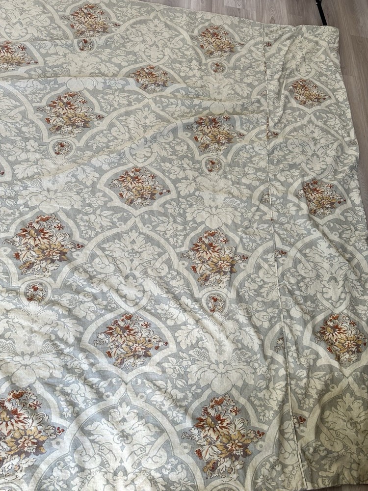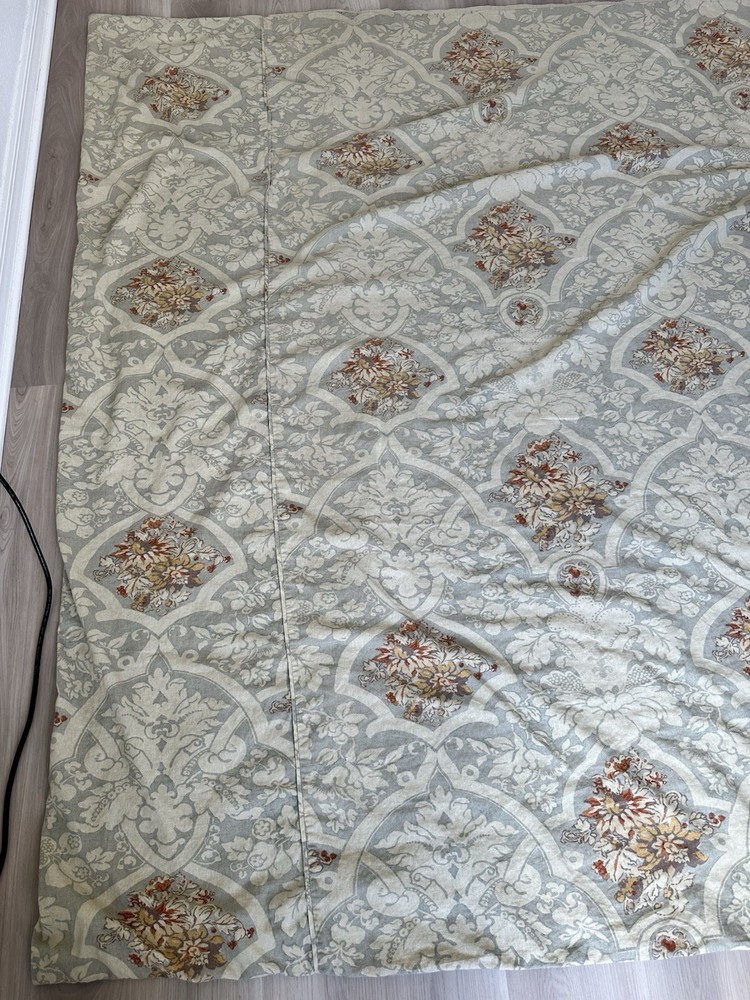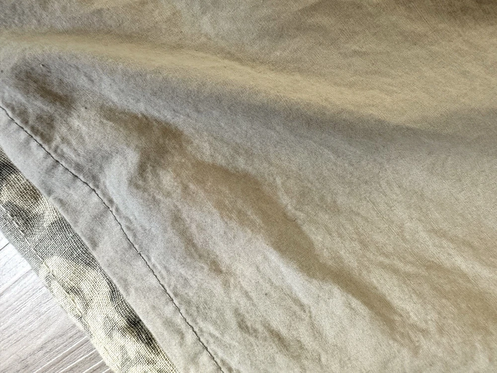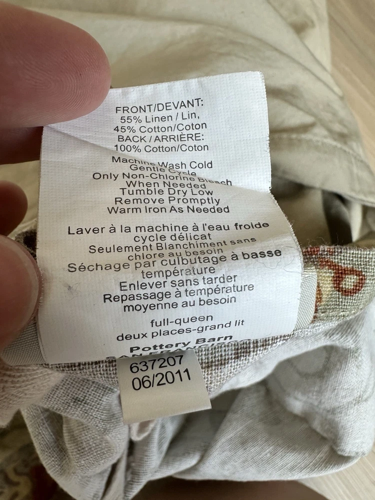 Queen Some faint light spots on solid side as shown A good amount lint/feathers from washing - especially inside Pilling on linen side as shown Sold as is Duvet cover only. Buttons closed