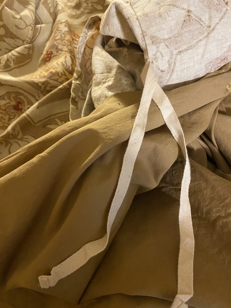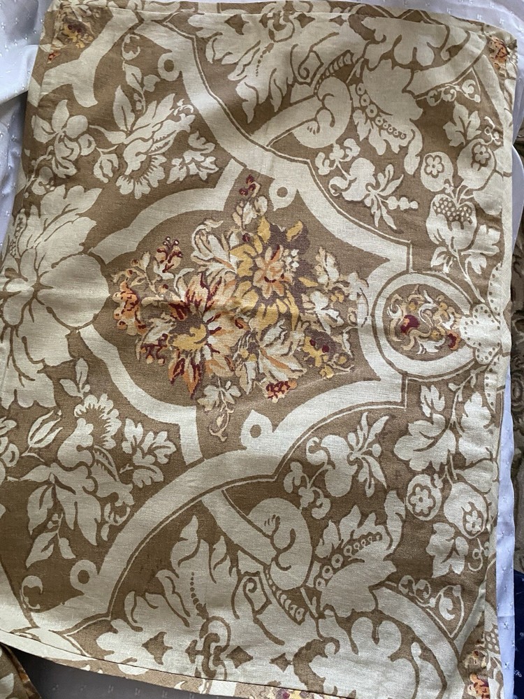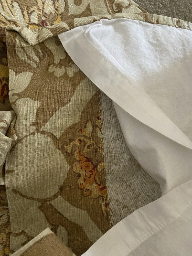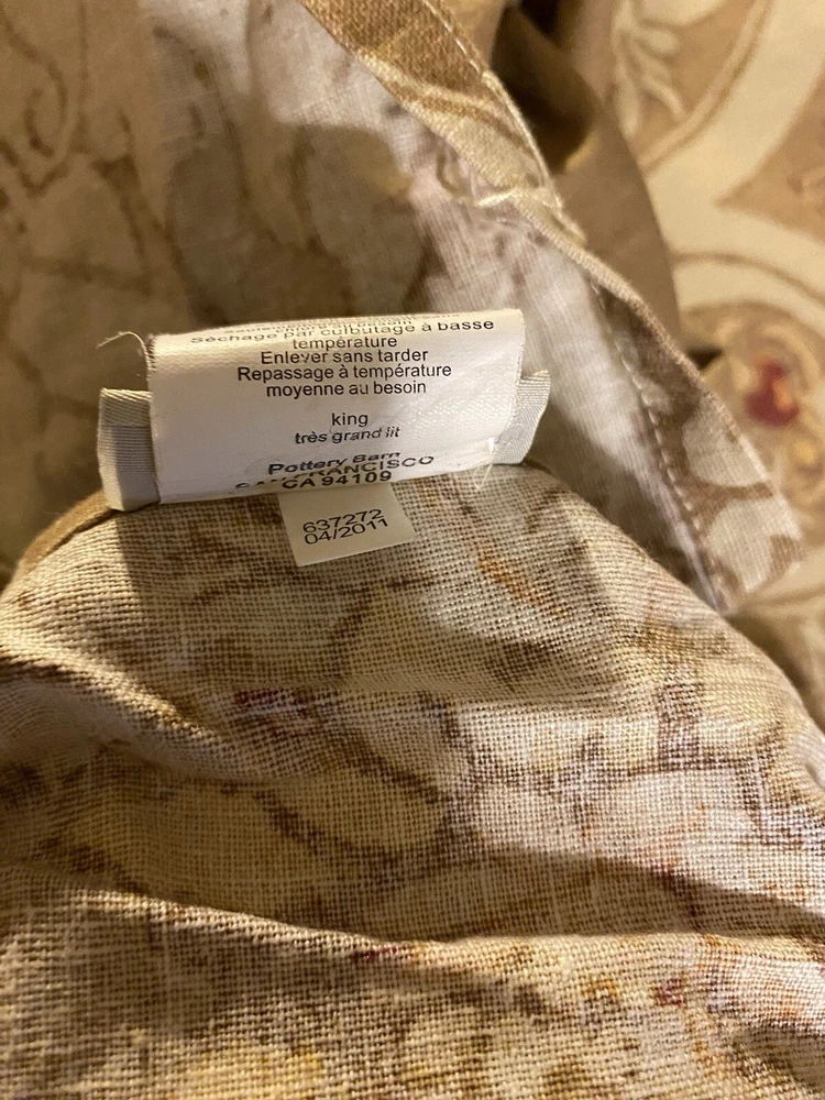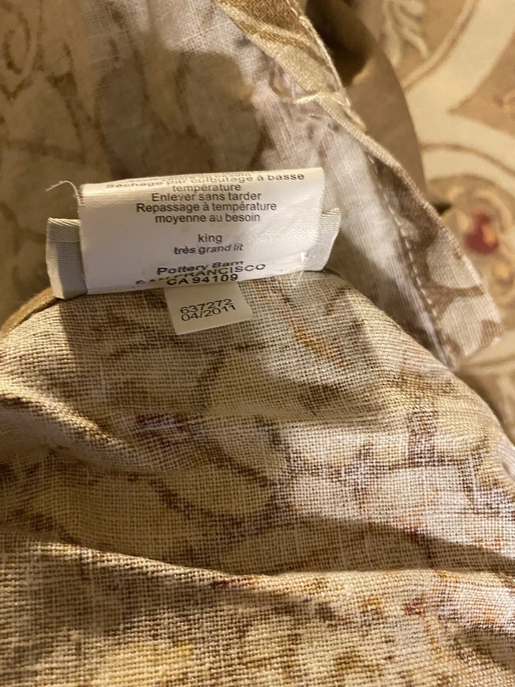 Add a touch of luxury to your bedroom with this beautiful Pottery Barn King Duvet Cover in the stunning Camilla pattern with gold/tan flowers. The cover is made of a blend of cotton and linen which is very natural and breathable. The set includes king duvet cover, two stand pillow shams and a pair of lined matching drape panels adding a cohesive touch to your bedding collection. Machine wash and tumble dry for easy care instructions. All cleaned and ready for use.